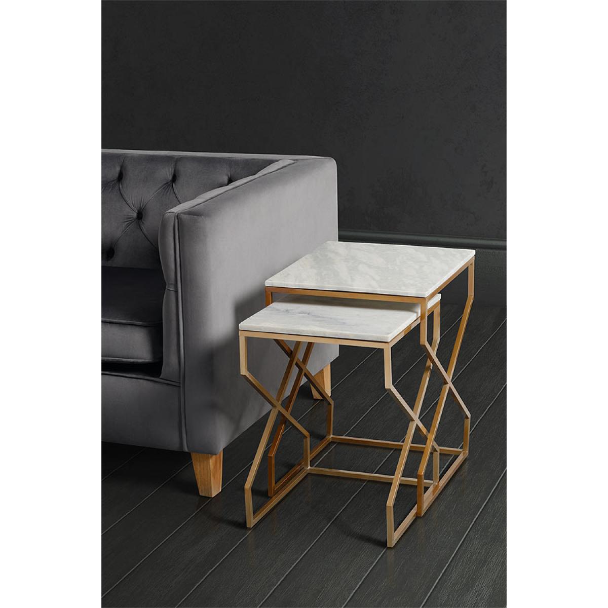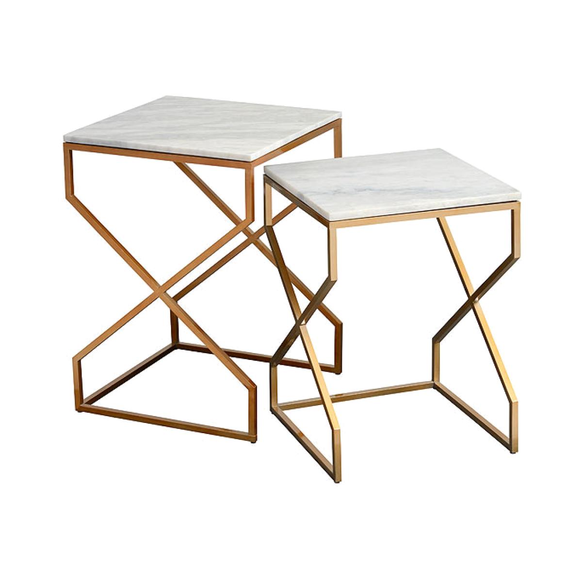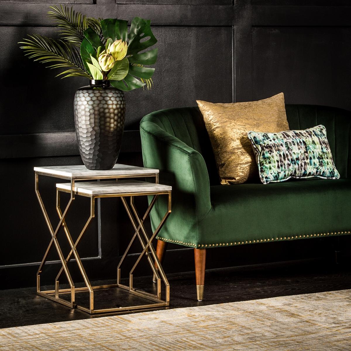 Glamorous design, Inspired by mesmerising geometric patterns from the Alhambra Palace. High quality, steel construction with brass effect finish. Solid marble top. Nesting design, tucks away neatly when not required. Due to its natural formation every piece of marble is unique. There may be subtle differences in colour, tone and composition from the image shown. On occasions fissures may be present, these are natural characteristics and do not compromise the marble’s structural integrity. Wipe with a soft, dry cloth. Avoid using chemical based cleaners as these could damage the finish.