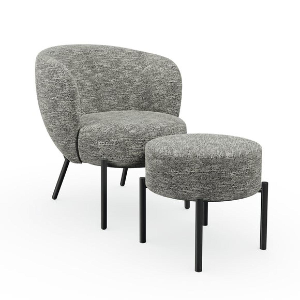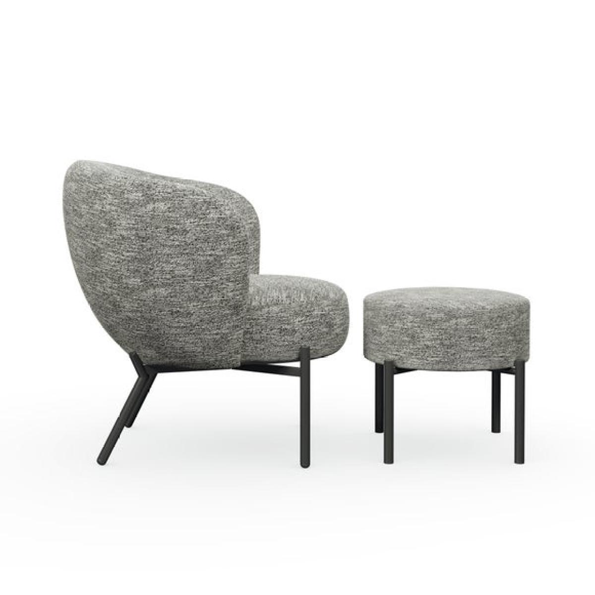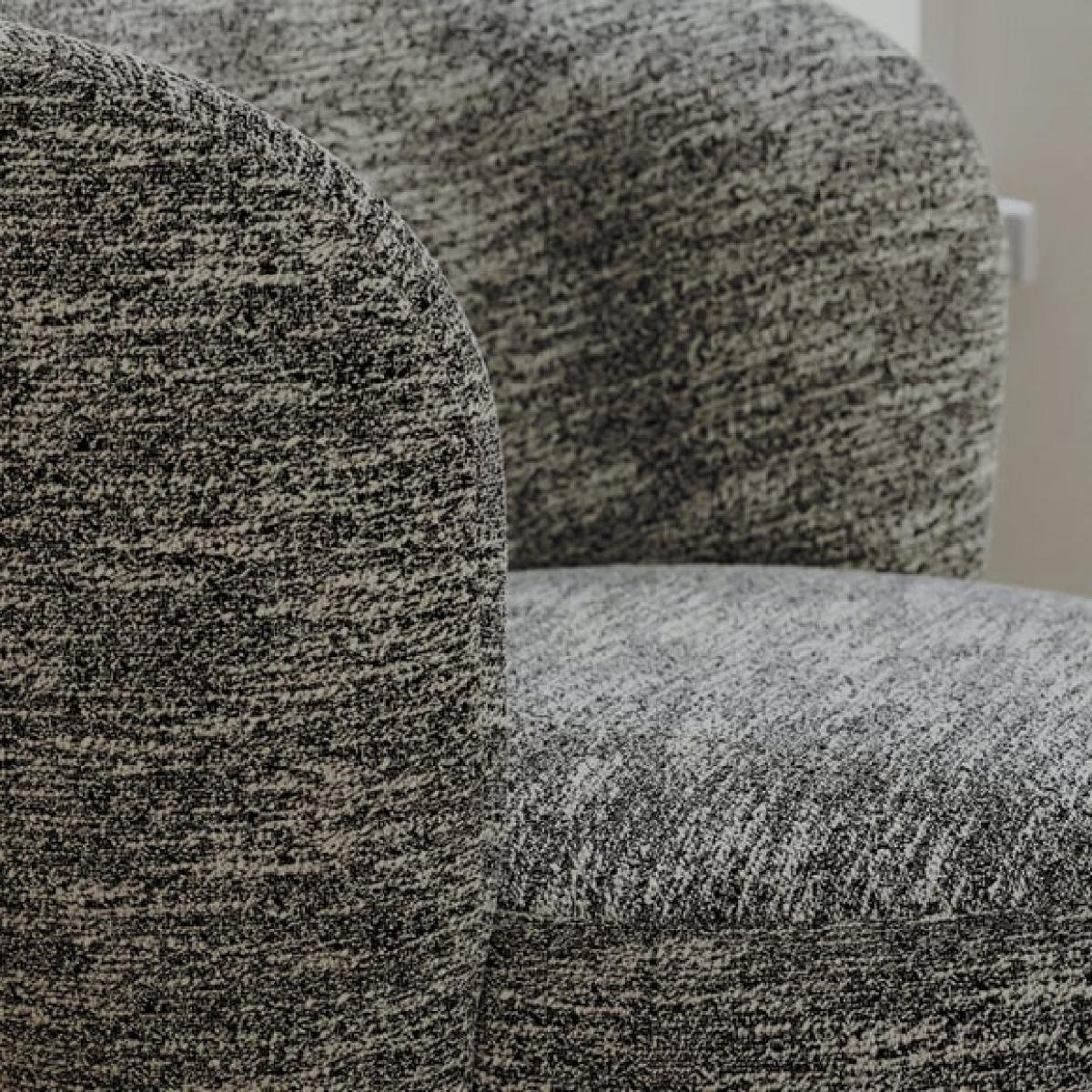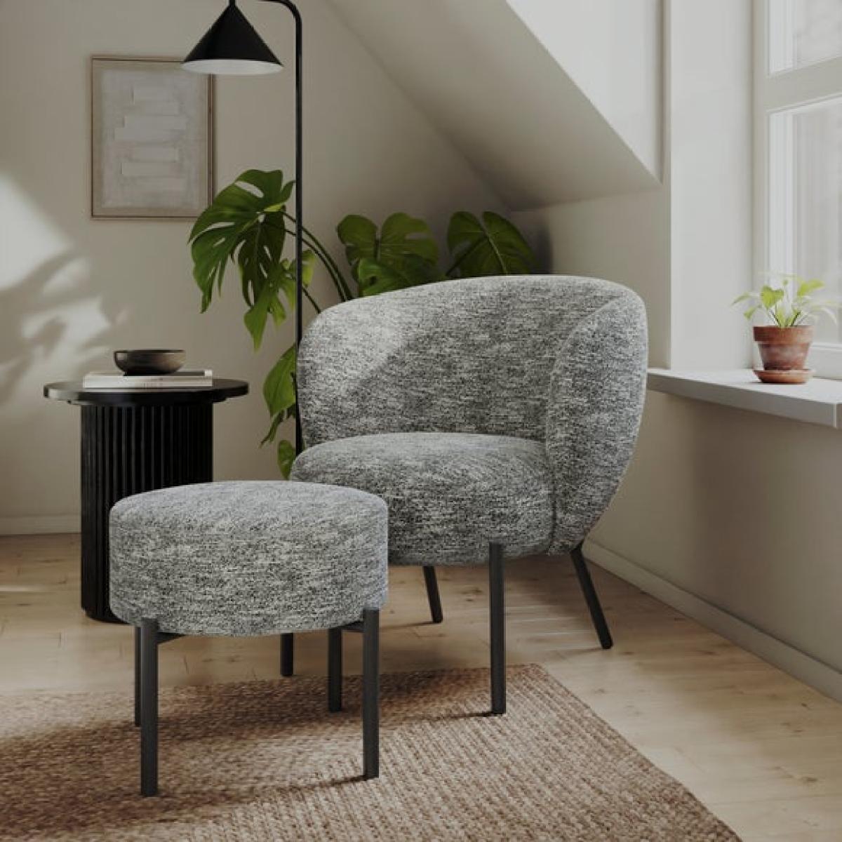* Modern chair and footstool * Textured fabric * Matching footstool * Metal legs Designed for ultimate relaxation, this curved chair comes paired with a matching footstool to complete the experience. Upholstered in a fleck weave fabric, it offers a subtle texture that adds depth without overwhelming your space. The chair’s rounded silhouette cradles the body, while the footstool provides the perfect perch for tired feet. Please Note: In accordance to The Offensive Weapons Act 2019, this product is now click and collect only. You may be asked to show ID upon collection.