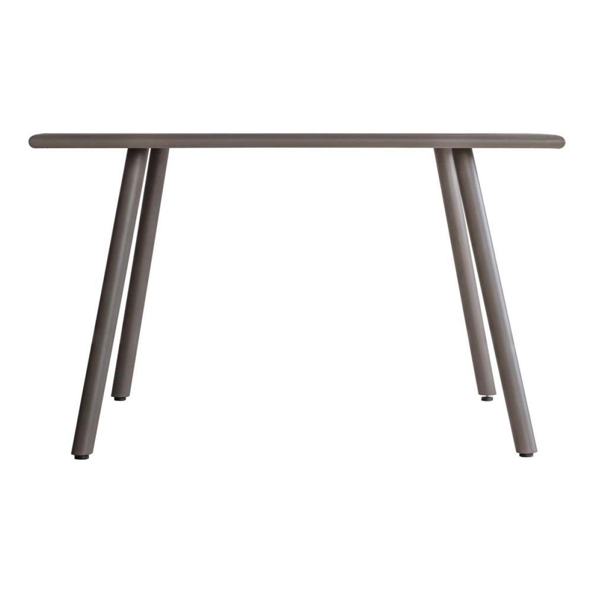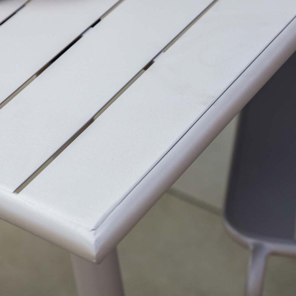 The Alicante Outdoor Dining Table is made of smooth painted steel. The table is in a subtle grey tone that picks up the light reflected around it. The design of the table is in keeping with the Alicante style, and the slatted top matches the dining chairs in the same range perfectly.