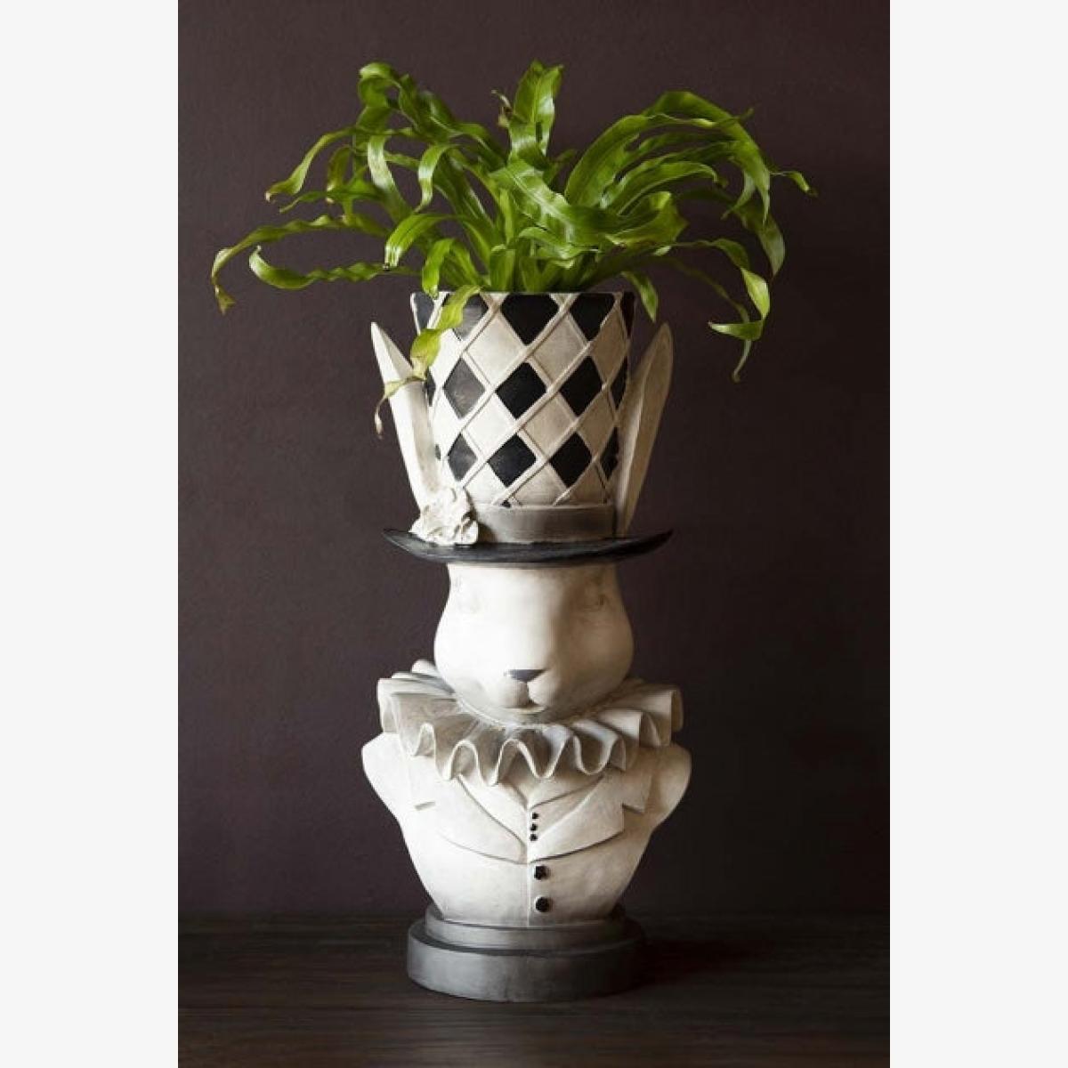 About This Quirky Rabbit Vase Fall down the Rabbit Hole straight into the wonderful world of Alice In Wonderland with this quirky Rabbit Bust Plant Holder. A homage to The White Rabbit in Alice In Wonderland, the rabbit wears his signature waistcoat and top hat which is checked in black and stone. The Alice In Wonderland White Rabbit Bust Plant Holder is made from polyresin and measures 46cm in height x 20cm in width x 11cm in diameter. The diameter of the Plant Pot hat is 14cm. Who We Think Will Love This Alice In Wonderland Planter Anyone who loves Lewis Carrol’s Classic, Alice In Wonderland, or loves quirky homeware will adore this Planter! Wonderfully eclectic this striking plant pot will add playful theatrics to your décor and would make a lovely addition to children’s bedrooms or playrooms. Better yet, the Alice In Wonderland Rabbit Bust Plant Holder is not just for your house plants or faux plants. Instead, you can use the planter as a quirky utensil holder for your kitchen utensils such as spatulas and wooden spoons. Creatives could fill the planter with paintbrushes, pens and pencils too! The multipurpose uses of this planter is never ending. Where To Style Your Rabbit Bust Plant Holder Incredibly well dressed this Rabbit Bust Plant Pot is a presentable fella who could be styled anywhere in your home. Pop the stone effect rabbit on top of your dining table with vases and candles to create an Easter or quirky mad hatter’s tea party table display! Alternatively the bunny rabbit planter could be displayed on top of your cabinets, shelves or chest of drawers with trailing ivy planted in his hat.