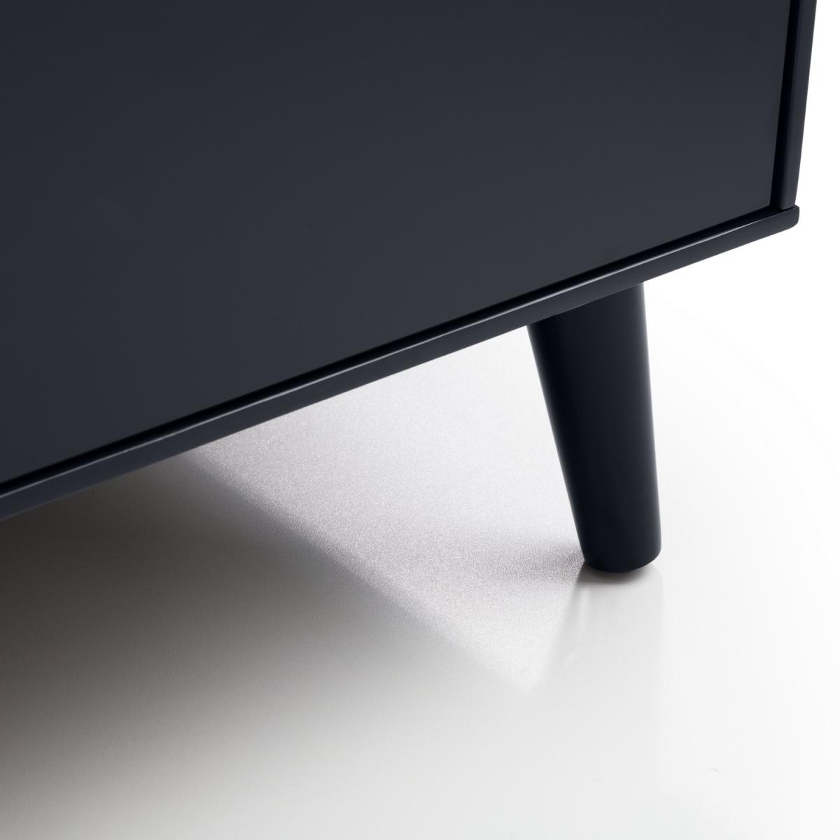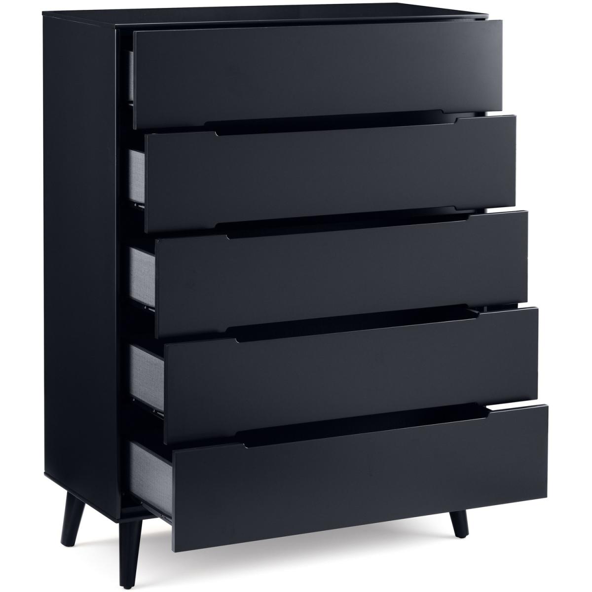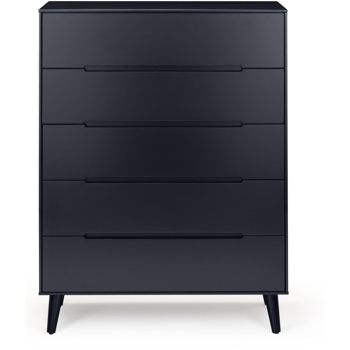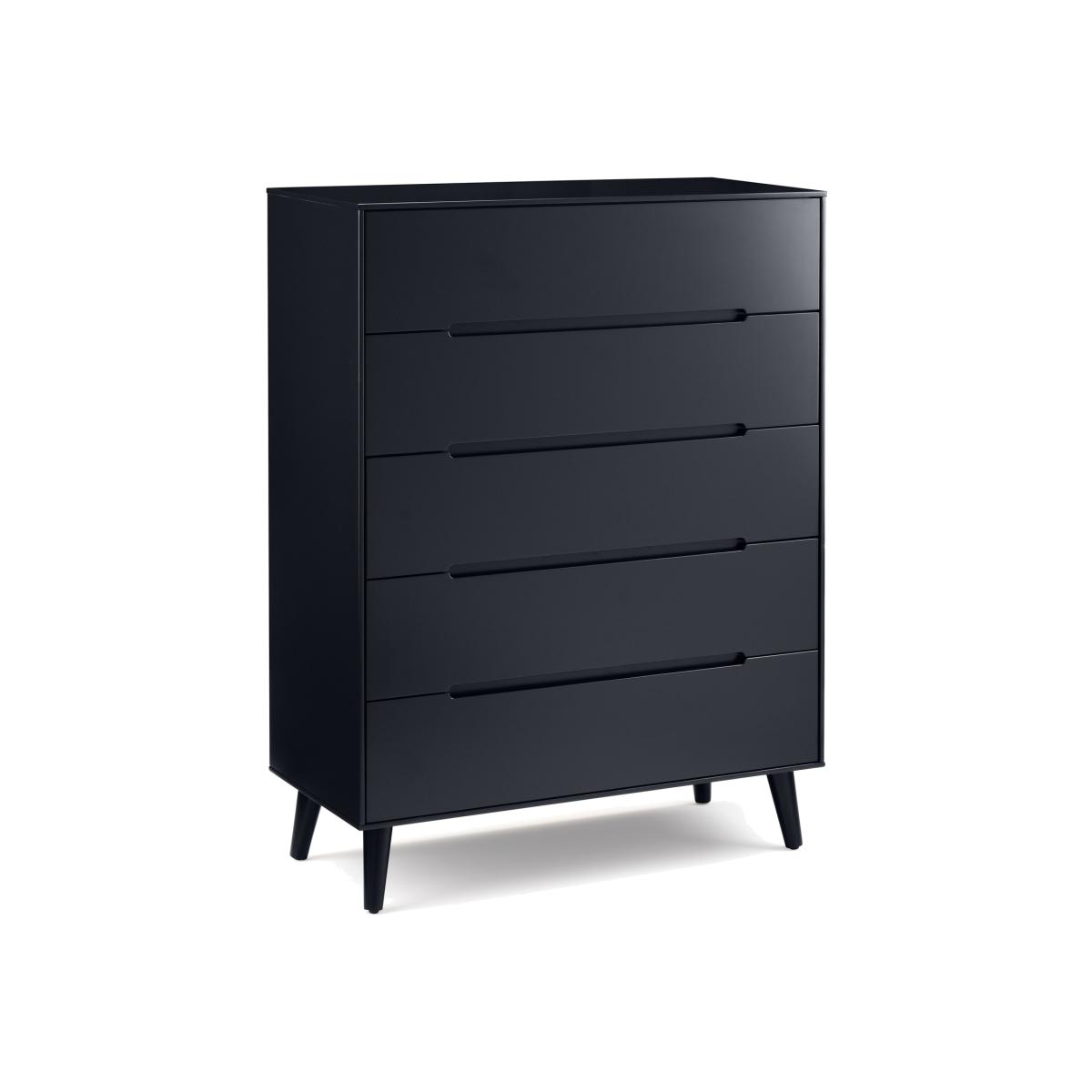 A stylish, retro-inspired chest with five large drawers in an immaculate matt anthracite lacquered finish, with complementary tapered oak finish legs and recessed handles to provide easy opening. The sleek Scandinavian feel fits beautifully with any dcor.