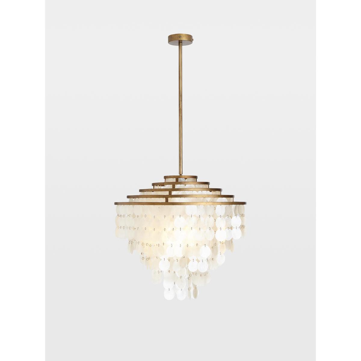The Alicia chandelier is a standout piece that will bring asense of decoration to hallways, landings or living rooms. Handmadein the Phillipines, the chandelier descends into a chevron form,with natural capiz shell discs that hang from a tiered, antiquebrass band. The pearlescent finish in the shell shimmers when itcatches the light. Place it above a dining table to mirror thevintage-style lighting at 180 House. Natural capiz shell discs. Pearlescent shimmer finish. Antique brass finish frame. Tiered chevron design. Fully assembled. Requires one x E27/ 60W bulb. Inspired by 180 House.
