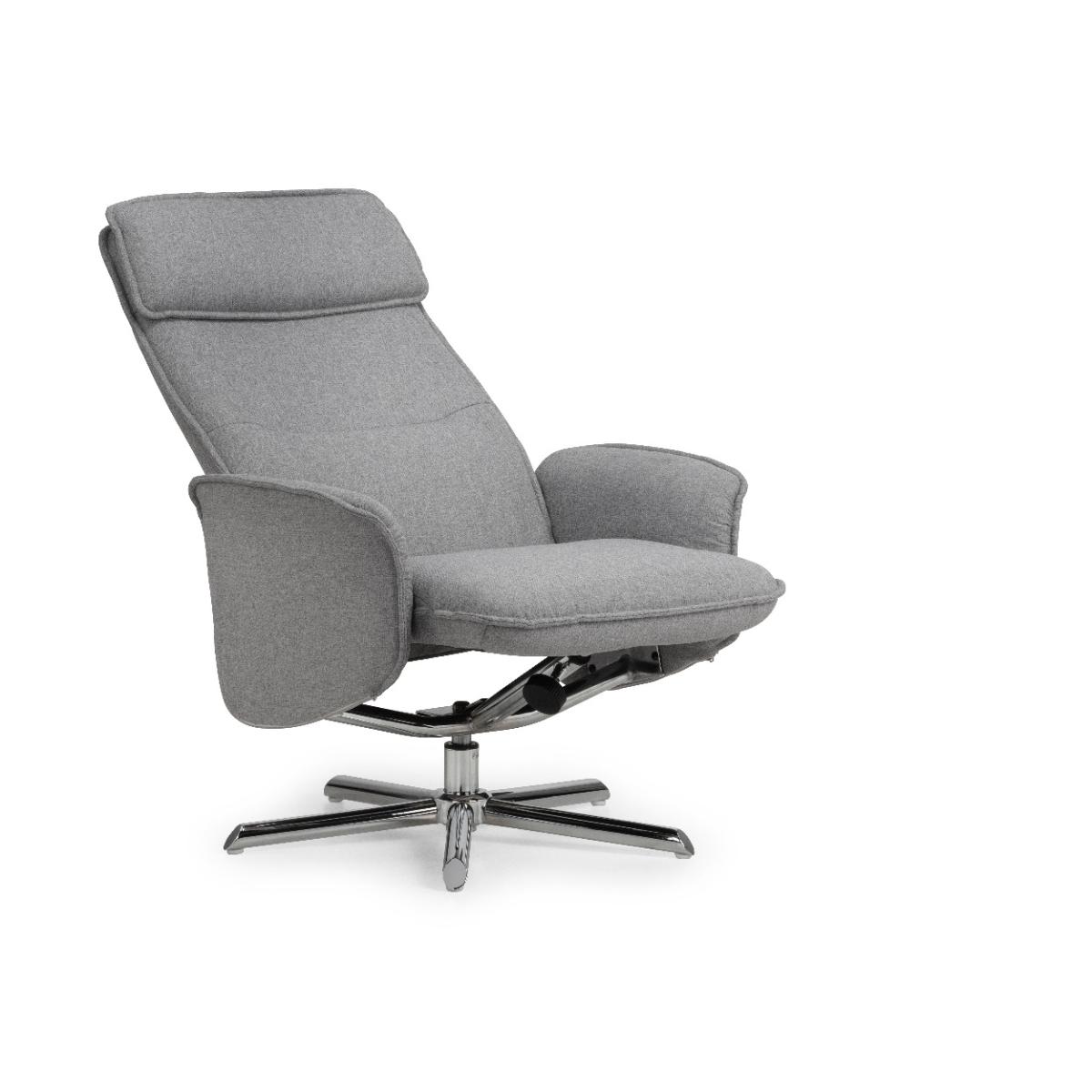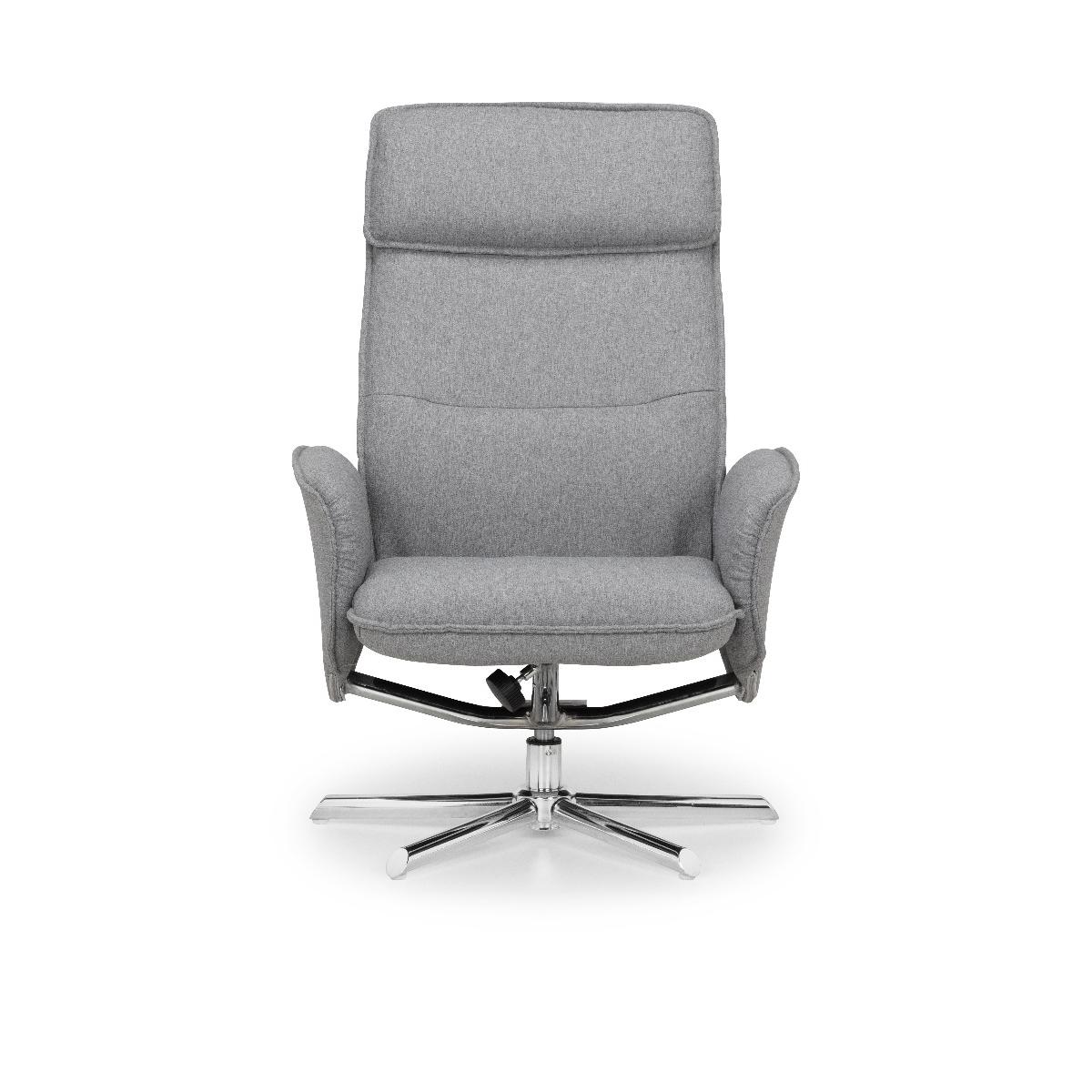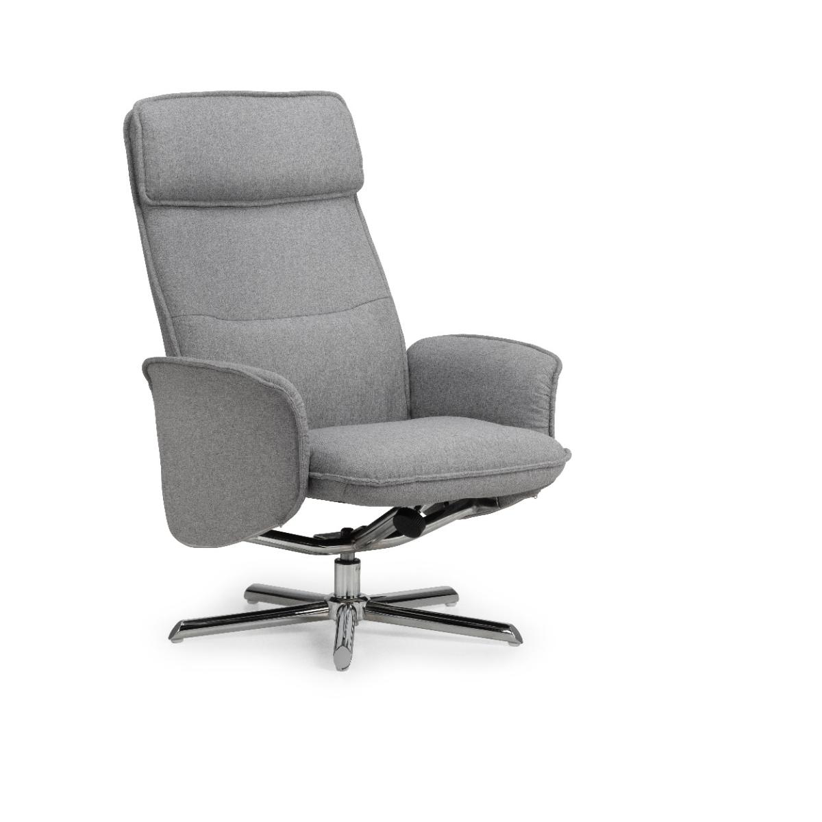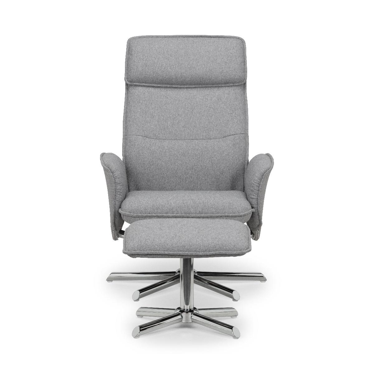 Sleek, modern and unbelievably comfortable, the stylish Alie Recliner features a light and versatile linen fabrication in a gorgeous grey, a plump and padded headrest and accompanying footstool, and a minimal design that will work within many styles of home. Shining silver chrome makes for a contemporary base, that not only allows you to recline, but also swivels for maximum movement and comfort Minimal in design, but offers maximum comfort Shining silver chrome legs add a contemporary touch Not only reclines, but swivels too Linen is soft, light and cool Comes with a matching padded footstool
