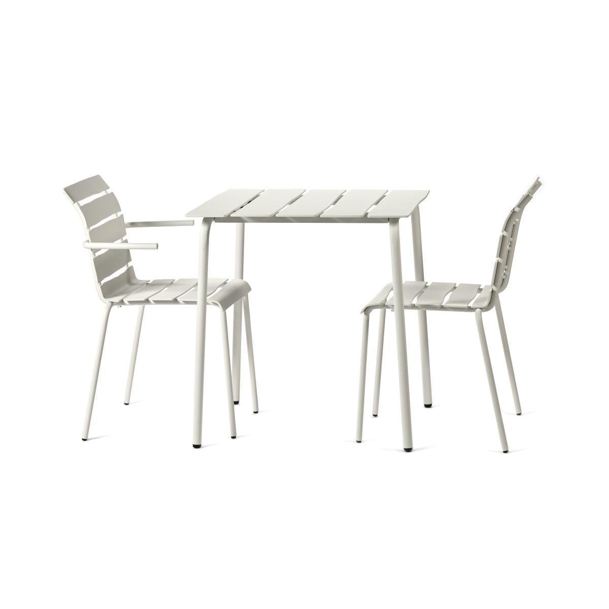 "Maarten Baas is one of the leading figures in Dutch design. Iconoclastic, subversive and brimming with fantasy, his creations sit at the crux of art and design. These are theatrical décor elements for everyday life: humorous furnishings with a rebellious edge. Through his controversial experimental work, Maarten Baas overturns preconceived ideas. He has forged his own world, happily pushing the boundaries of design to show another reality made up of strangeness, optical effects, illusion, play. After having created a tableware collection for valerie_objects, this time, Maarten Baas brings his vision of outdoor furnishings to the table, with his "Aligned" collection. This collection of outdoor tables and chairs revels in the concept of us all having an inner child, hidden away deep inside us. These creations contain a huge dose of spontaneity and naivety, translating a human touch into mechanically-produced objects. "The starting point was similar for each object that I create: creating a piece of design which is entirely functional and which appears to be hand-drawn", declared Baas. This way, Baas redefined outdoor furnishings, which are typically composed of metal frames and wooden slats, by designing the slats with pencil on paper, then by meticulously recreating them in reality using aluminium. "You can often find beauty in just a quick sketch", he explained. However, these spontaneous lines are also lost amidst an industrial process. This is how Maarten Baas adds organic shapes and irregular lines into a world of design centred around straight lines. "Although the underlying idea may seem simple, production is far from it", declares Baas. "Machines are truly gifted when it comes to creating straight lines. It's much harder to produce a twisted line". The result is "oh-so Maarten Baas": a design which appears to have been imagined by a child… The heat-lacquered aluminium slats contain slightly irregular and asymmetrical lines, deliberately and unapologetically imperfect. This playful and naive spirit is further reinforced by the small, forward-pointing armrests, which have an air of an outstretched arm and which give the seating a charismatic charm. ".