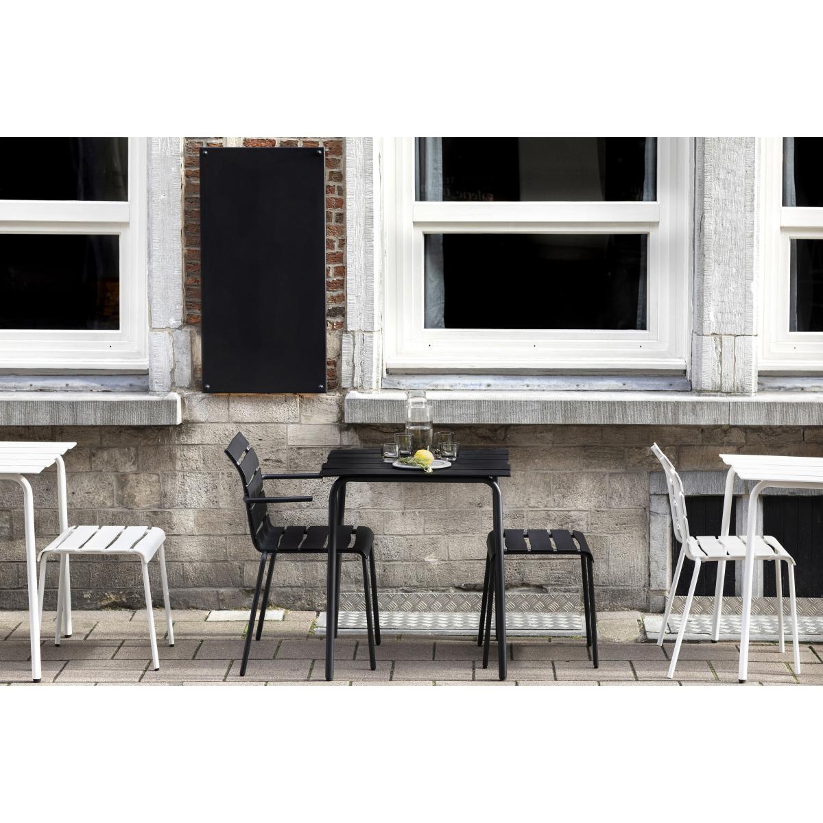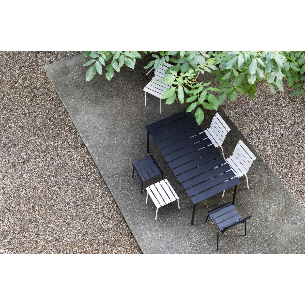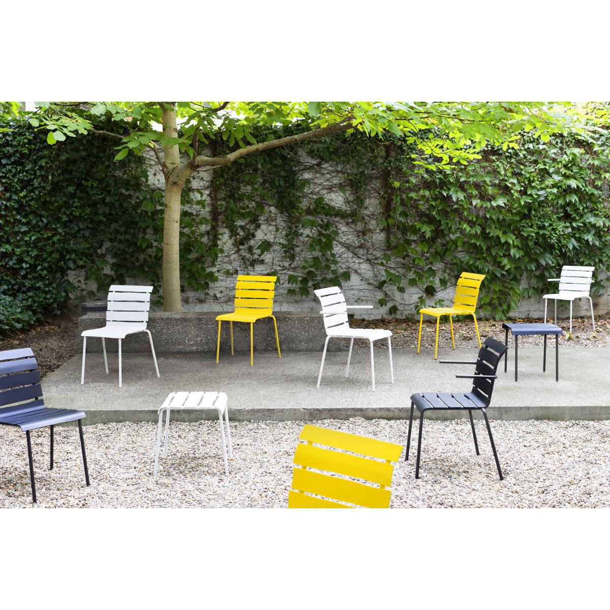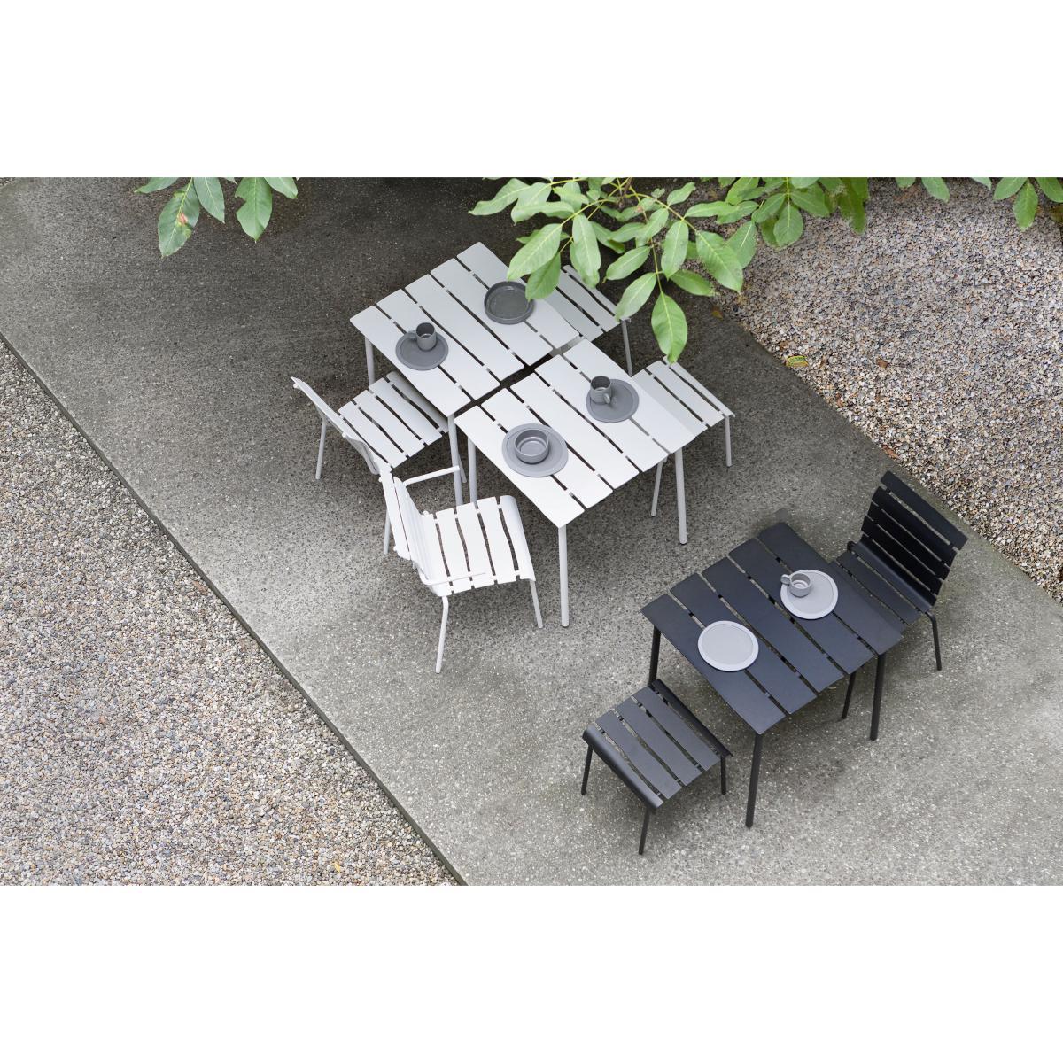 "Maarten Baas is one of the leading figures in Dutch design. Iconoclastic, subversive and brimming with fantasy, his creations sit at the crux of art and design. These are theatrical décor elements for everyday life: humorous furnishings with a rebellious edge. Through his controversial experimental work, Maarten Baas overturns preconceived ideas. He has forged his own world, happily pushing the boundaries of design to show another reality made up of strangeness, optical effects, illusion, play. After having created a tableware collection for valerie_objects, this time, Maarten Baas brings his vision of outdoor furnishings to the table, with his "Aligned" collection. This collection of outdoor tables and chairs revels in the concept of us all having an inner child, hidden away deep inside us. These creations contain a huge dose of spontaneity and naivety, translating a human touch into mechanically-produced objects. "The starting point was similar for each object that I create: creating a piece of design which is entirely functional and which appears to be hand-drawn", declared Baas. This way, Baas redefined outdoor furnishings, which are typically composed of metal frames and wooden slats, by designing the slats with pencil on paper, then by meticulously recreating them in reality using aluminium. "You can often find beauty in just a quick sketch", he explained. However, these spontaneous lines are also lost amidst an industrial process. This is how Maarten Baas adds organic shapes and irregular lines into a world of design centred around straight lines. "Although the underlying idea may seem simple, production is far from it", declares Baas. "Machines are truly gifted when it comes to creating straight lines. It's much harder to produce a twisted line". The result is "oh-so Maarten Baas": a design which appears to have been imagined by a child… The heat-lacquered aluminium slats contain slightly irregular and asymmetrical lines, deliberately and unapologetically imperfect. This playful and naive spirit is further reinforced by the small, forward-pointing armrests, which have an air of an outstretched arm and which give the seating a charismatic charm. ".