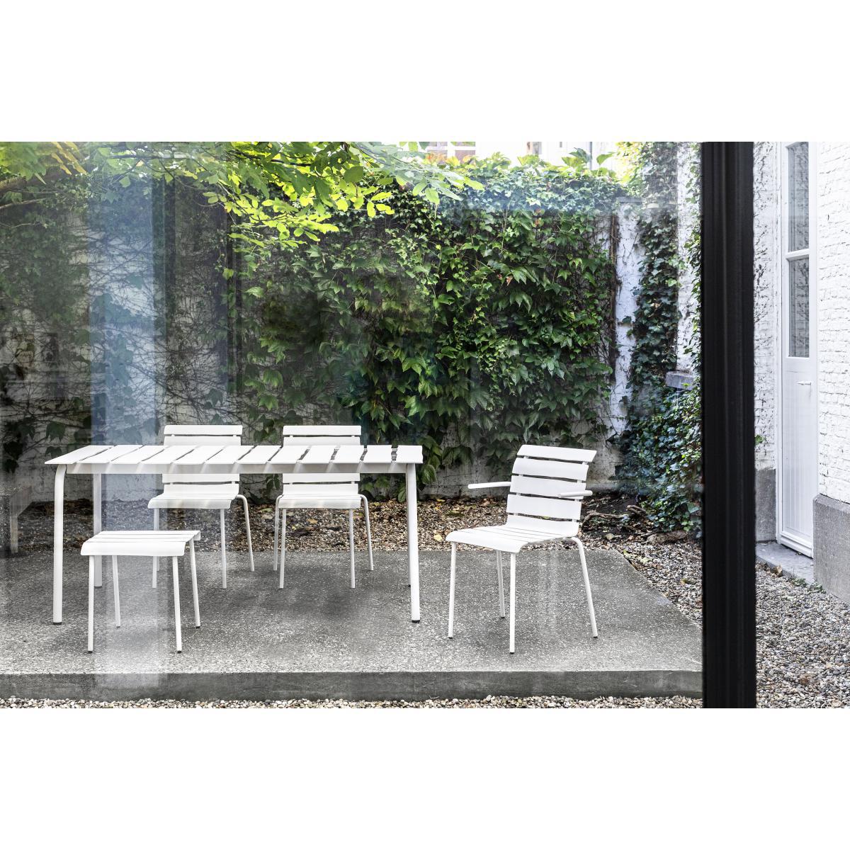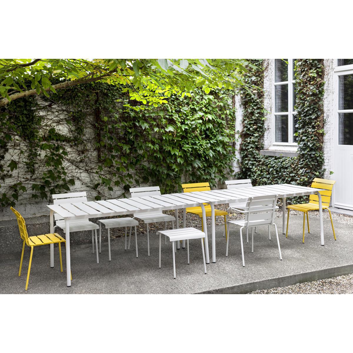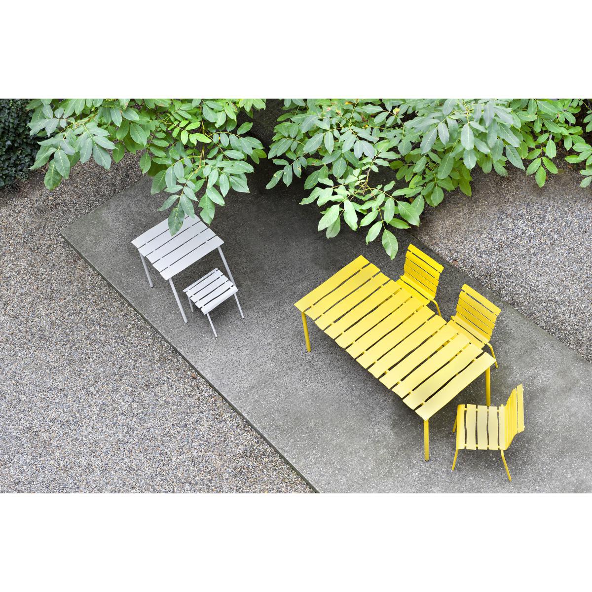 "Maarten Baas is one of the leading figures in Dutch design. Iconoclastic, subversive and brimming with fantasy, his creations sit at the crux of art and design. These are theatrical décor elements for everyday life: humorous furnishings with a rebellious edge. Through his controversial experimental work, Maarten Baas overturns preconceived ideas. He has forged his own world, happily pushing the boundaries of design to show another reality made up of strangeness, optical effects, illusion, play. After having created a tableware collection for valerie_objects, this time, Maarten Baas brings his vision of outdoor furnishings to the table, with his "Aligned" collection. This collection of outdoor tables and chairs revels in the concept of us all having an inner child, hidden away deep inside us. These creations contain a huge dose of spontaneity and naivety, translating a human touch into mechanically-produced objects. "The starting point was similar for each object that I create: creating a piece of design which is entirely functional and which appears to be hand-drawn", declared Baas. This way, Baas redefined outdoor furnishings, which are typically composed of metal frames and wooden slats, by designing the slats with pencil on paper, then by meticulously recreating them in reality using aluminium. "You can often find beauty in just a quick sketch", he explained. However, these spontaneous lines are also lost amidst an industrial process. This is how Maarten Baas adds organic shapes and irregular lines into a world of design centred around straight lines. "Although the underlying idea may seem simple, production is far from it", declares Baas. "Machines are truly gifted when it comes to creating straight lines. It's much harder to produce a twisted line". The result is "oh-so Maarten Baas": a design which appears to have been imagined by a child… The heat-lacquered aluminium slats contain slightly irregular and asymmetrical lines, deliberately and unapologetically imperfect. This playful and naive spirit is further reinforced by the small, forward-pointing armrests, which have an air of an outstretched arm and which give the seating a charismatic charm. ".