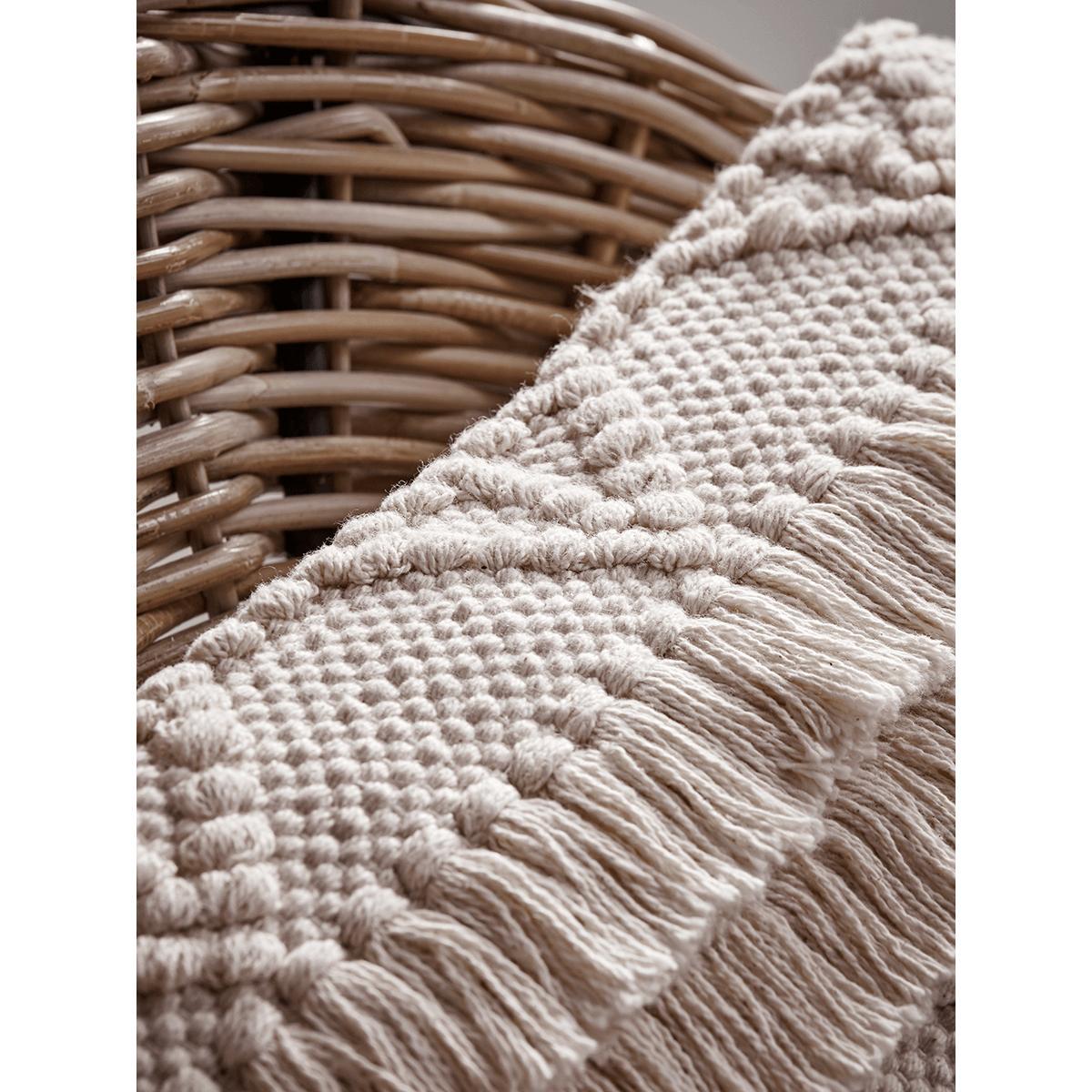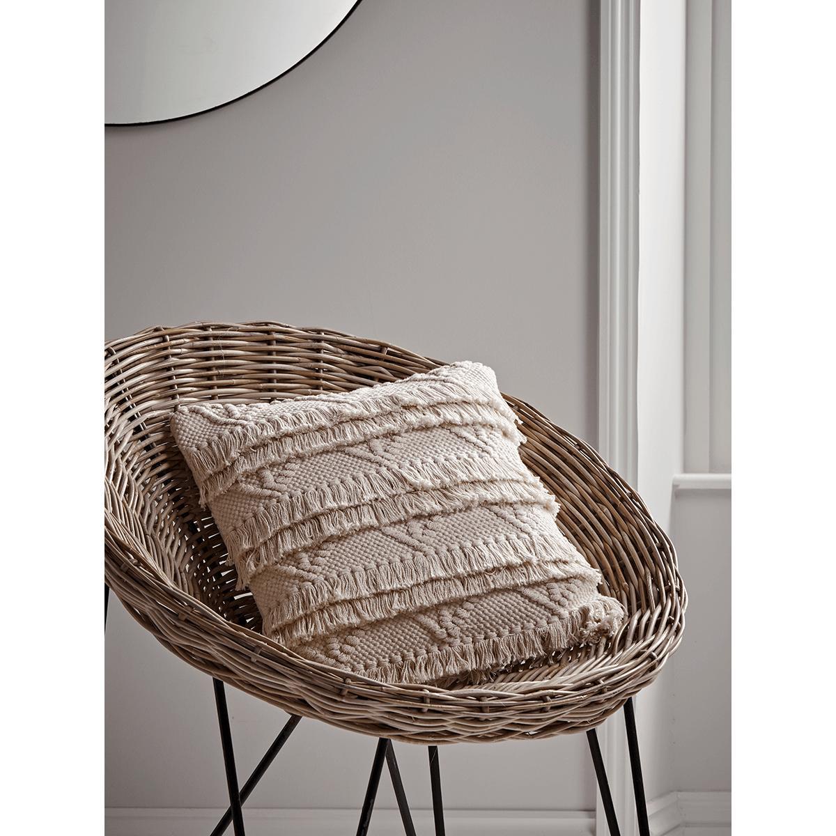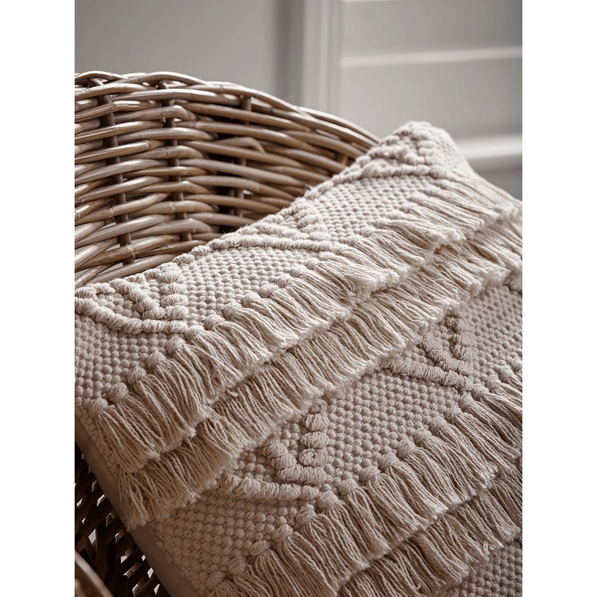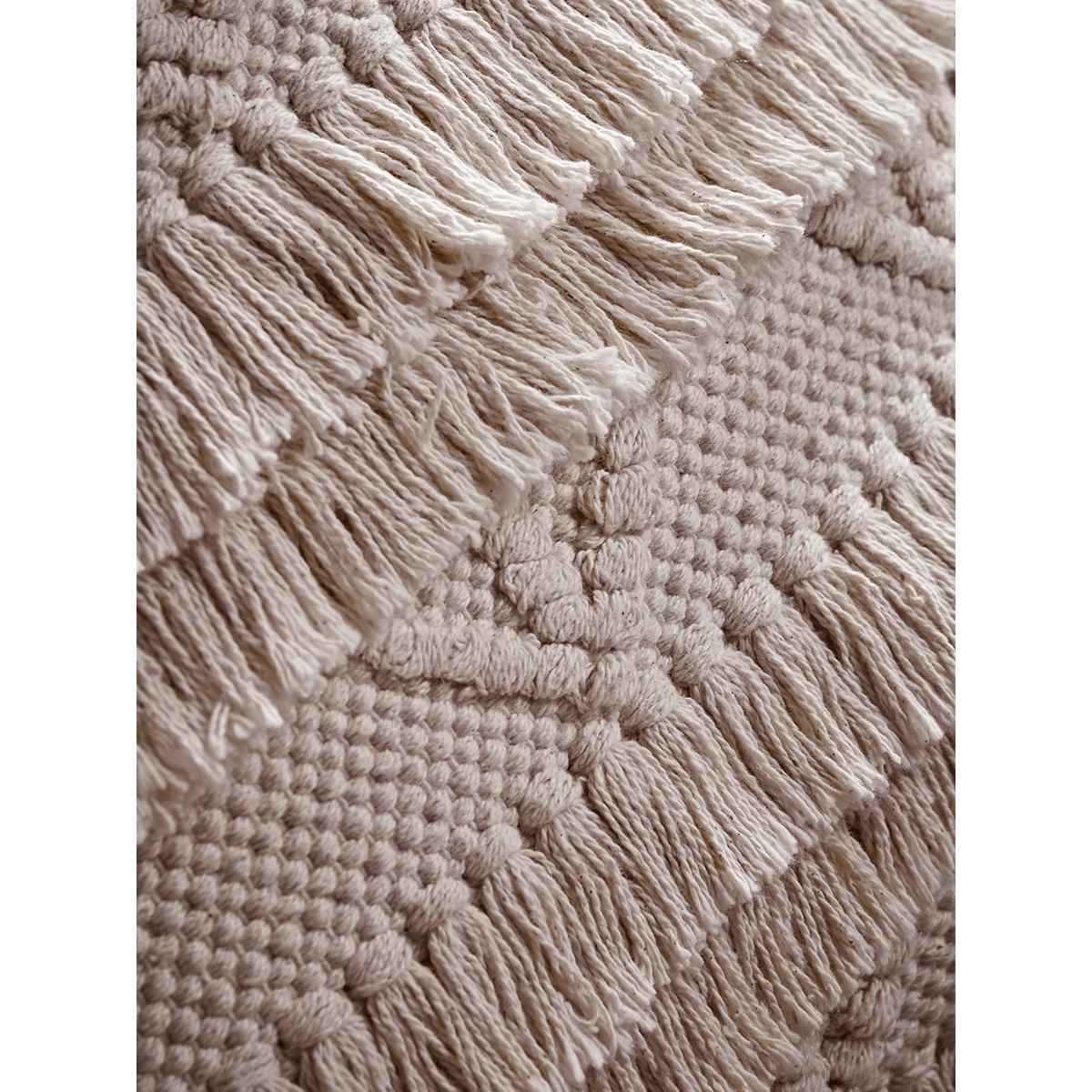 A cover in natural off-white cotton designed with macramé look by bands of fringing and tufting to effortless inject pattern to any neutral interior. Each cushion comes with a plump duck feather fill.