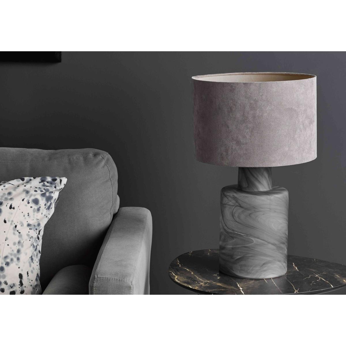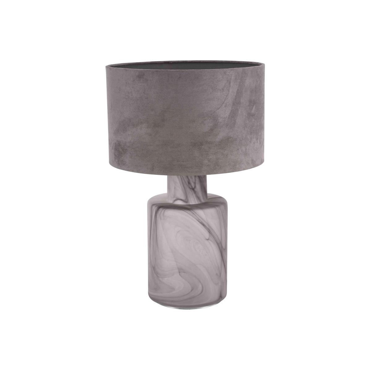 Elegant and modern, this table lamp features a rounded, frosted glass base embellished with smoky marble-effect patterning. We’ve paired it with a luxe velvet fabric shade. Why you'll love it Enjoy ambient light from this elegant modern table lamp. Smooth and tactile marble-effect frosted glass base. Polished chrome-effect fittings. Finished with a grey velvet drum-shaped lampshade. This glass table lamp is part of the Furniture Village lighting collection. What you need to know Glass base, fabric shade. Supplied with 150 cm cable. Requires 1 x E27 max. 60 W bulb (not included). Please do not exceed this wattage. To clean, wipe gently with a clean soft cloth. Be sure to disconnect from the power outlet before cleaning. Dimensions including shade Height: 52 cm (20 in). Diameter: 34 cm (13 in).