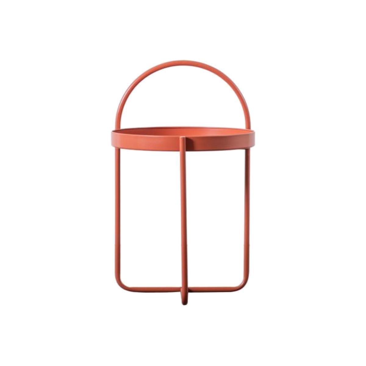 The stylish design of this unusual side table features a tray-style top, which lifts off for added practicality, and a continuation of one section of the base, up and over the table to create a ‘handle’ effect. Both the tray top and base are made from metal with a painted finish. Material: Iron. Colour/Finish: Red.