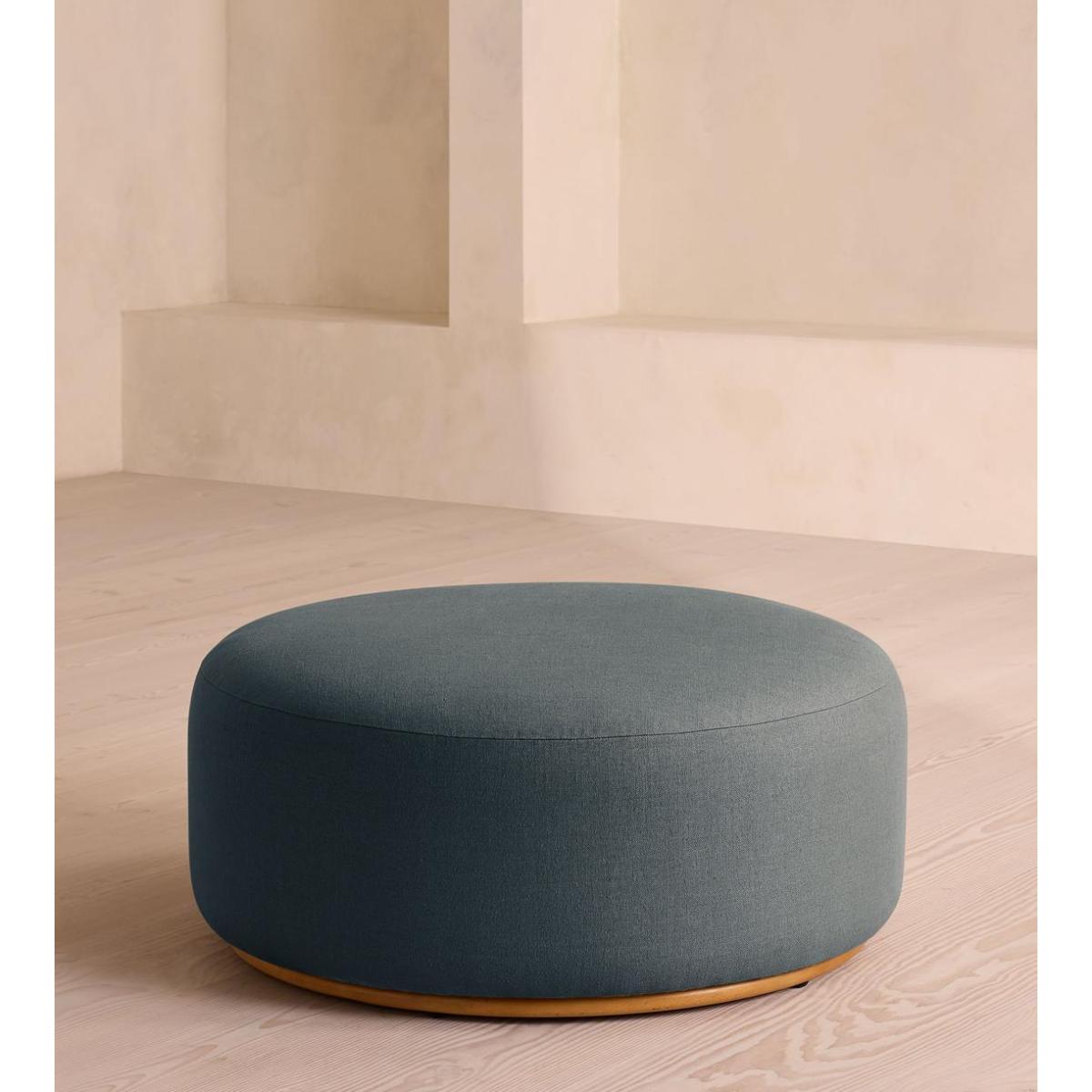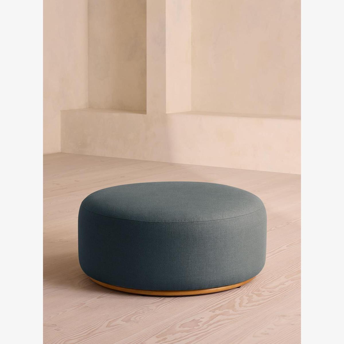 A large, curved silhouette upholstered in linen is spacious enough to let guests put their feet up, or provide extra seating in social spaces. The curved silhouette of the Aline ottoman is wrapped in linen in a range of bespoke colors to mirror the social seating areas seen in Soho House Stockholm.