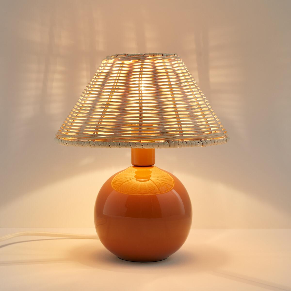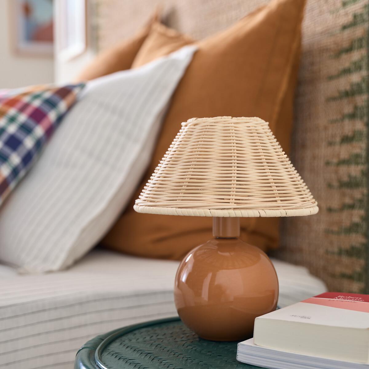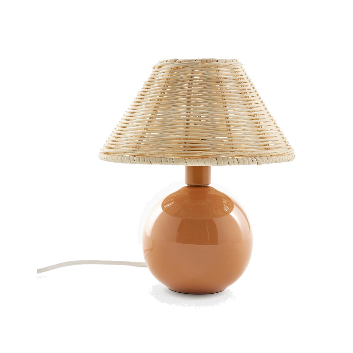 The essential little bedside lamp is reinterpreted in an '80s style. To place on a bedside table or a small piece of furniture, it has the charm of vintage style and the chic of the rattan/white ceramic combination. Alios offers diffused and warm lighting to create a real ambianceintimate and cosy. Product Details • Rattan shade • Ceramic lamp base • E14 socket for 25W max bulb (not included)Dimensions • Diameter: 21.5cm • Height: 24.7 cm • Lampshade: Diameter 7/21.5 x 11cm • Lamp base:Diameter 12.6 x H11.7cm Parcel dimensions and weight1 parcel • L24 x H29.5 x D24cm. 1.26kg