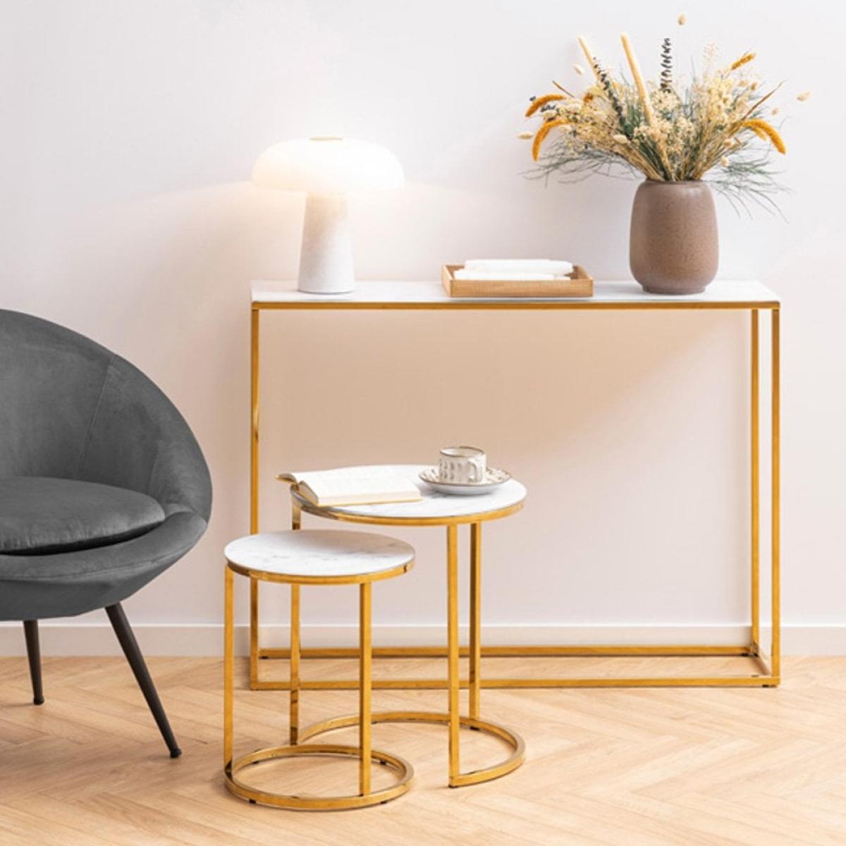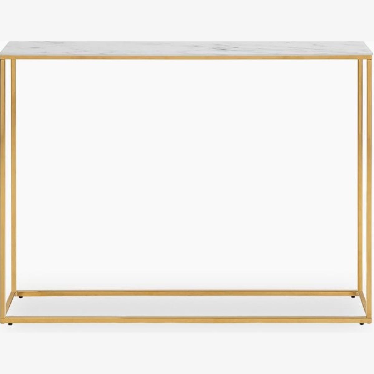 I love the look of this large console in a white marbled glass finish paired with brass - it feels sleek and contemporary but also versatile enough to work in more classic or eclectic interiors. It’s a particularly versatile piece, ideal for entryways, living rooms, or even as a subtle organisational station in a bedroom. For styling, try layering it with a few decorative objects such as vases, books, or sculptural pieces to add interest without clutter. Its clean lines and elegant material palette also mean it pairs well with both neutral and coloured schemes, making it a reliable addition that elevates any space.