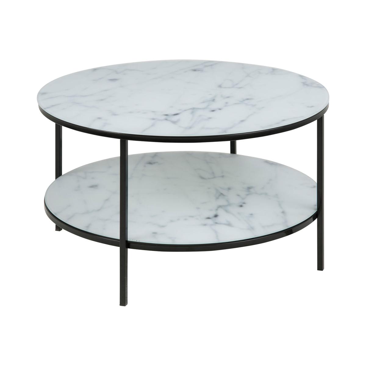 The Alisma Round Marble Coffee Table exudes luxury and stands out as an exceptional piece. It features a powder-coated metal base available in black or gold, paired with a frosted glass tabletop that showcases a classic marble appearance. This design adds both energy and elegance to any space. Crafted from low-maintenance materials, this table makes a bold statement in your living room with ease. Additionally, the inclusion of a shelf is ideal for storing essentials, such as remotes, helping to keep your home clutter-free.