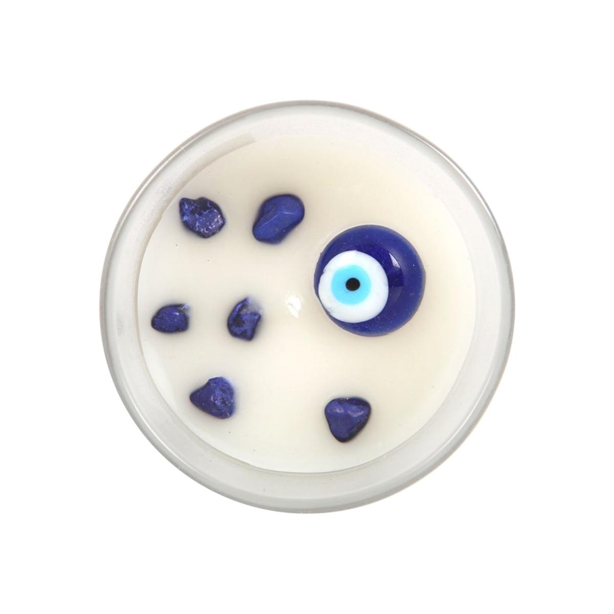 Ward off negative energies and protect against harm with this stunning White Sage fragranced candle. A frosted glass holder is accented by a scattering of sodalite crystal chips and a glass All Seeing Eye charm that can later be reused for a multitude of spiritual purposes. Paraffin wax. Crystals and charm will release from wax with use. Approximate burn time of 25 hours. Please practice caution when burning and never leave lit candle unattended.