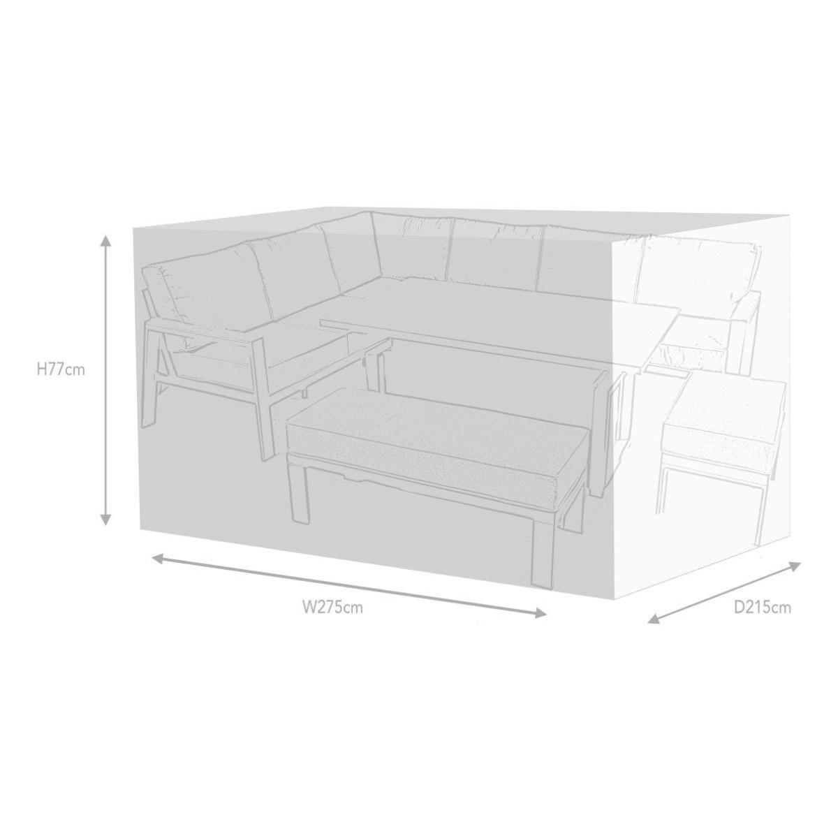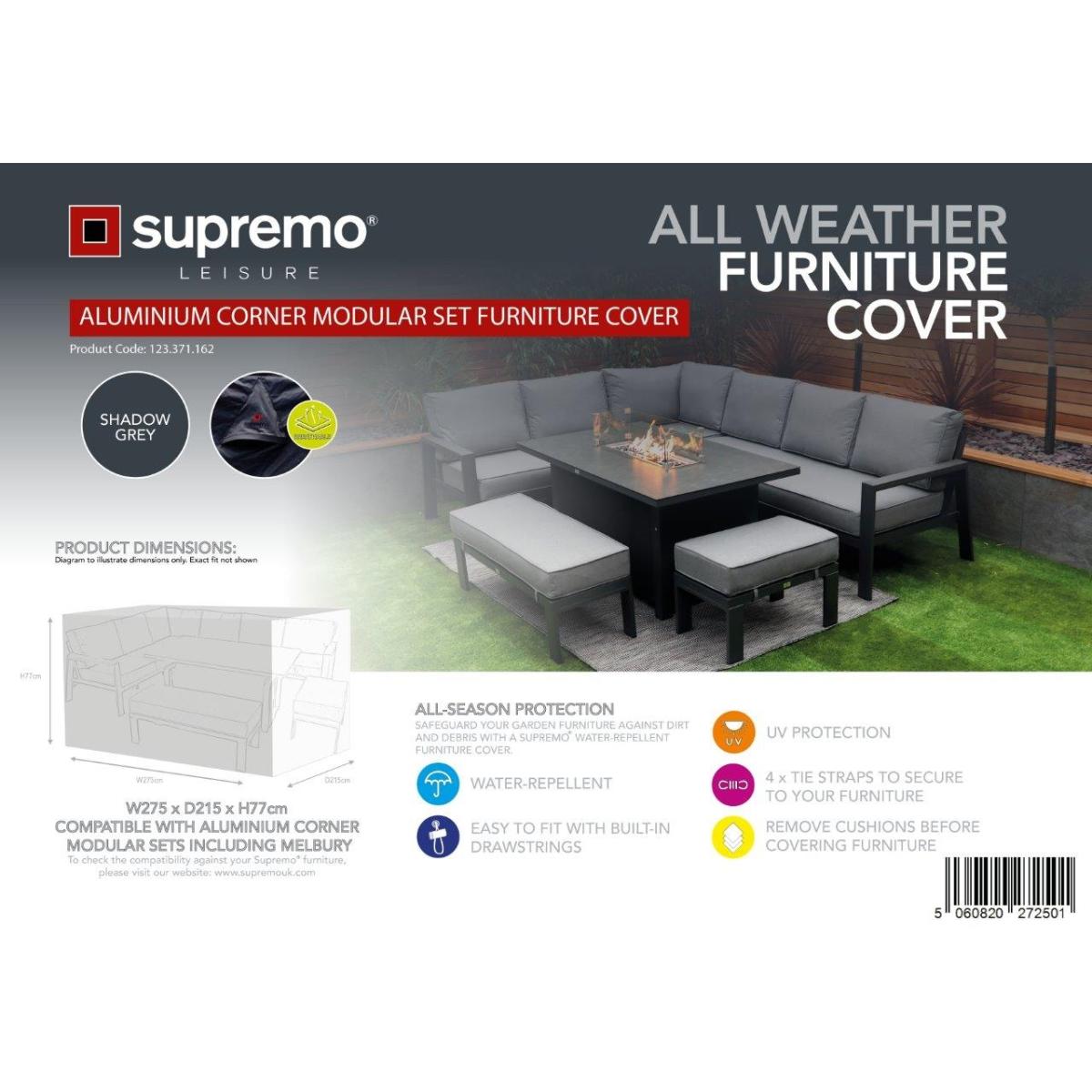 This cover is designed to fit the Supremo Melbury Corner Set With Recliner Chaise & Rectangular Adjustable Table. This Supremo all weather cover is UV resistant and waterproof making it suitable for use throughout every season. This shadow grey cover is modern and practical as it is fitted with discreet drawstrings making it effortless to fit. The fully breathable venting system within this cover guarantees the perfect preservation of your furniture. The 4 tie straps ensure the security of this outdoor cover to your garden set. Although the Supremo garden furniture is weather resistant, to prolong the life of your outdoor set it is important to cover & protect this from the changeable weather. KEY FEATURES: Fully breathable vent system Waterproof and UV resistant 4 tie straps for securing to set 1 year warranty Size - H 77cm x W 275cm x D 215cm Colour - Grey