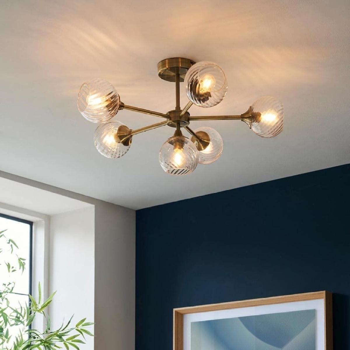 Allegra 6-light semi-flush ceiling light, featuring twisted glass shades and an antique brass finish. A dazzling fixture that combines vintage allure with contemporary flair, this semi-flush ceiling light features six twisted glass shades, exuding a captivating and dynamic aesthetic that adds texture and dimension to any room. The antique brass finish enhances the fixture's timeless appeal, infusing your space with a sense of sophistication and elegance. Ideal for living rooms, dining areas or entryways, the Allegra ceiling light provides ample illumination while serving as a stunning centerpiece in your decor. Its semi-flush mount design offers versatility, making it suitable for rooms with lower ceilings. Allegra 6-light semi-flush ceiling light, featuring twisted glass shades and an antique brass finish. A dazzling fixture that combines vintage allure with contemporary flair, this semi-flush ceiling light features six twisted glass shades, exuding a captivating and dynamic aesthetic that adds texture and dimension to any room. The antique brass finish enhances the fixture's timeless appeal, infusing your space with a sense of sophistication and elegance. Ideal for living rooms, dining areas or entryways, the Allegra ceiling light provides ample illumination while serving as a stunning centerpiece in your decor. Its semi-flush mount design offers versatility, making it suitable for rooms with lower ceilings.