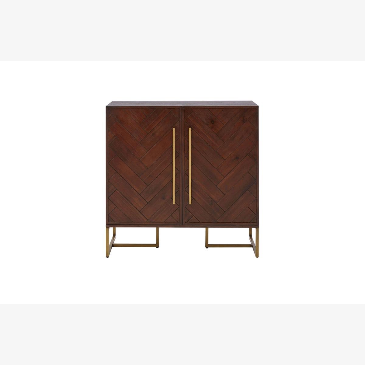 Oozing elegance, finesse and flair, our Allegra collection boasts a striking combination of rich, dark wood and warm metallics for a sleek and contemporary finish. Featuring an alluring angular herringbone pattern carved from acacia wood veneer, each piece enjoys slender metallic legs and handles with an antique brass finish. Available as a drinks cabinet, media unit, console table, side table, shelving unit, and coffee table, complete the look by indulging in the entire Allegra collection.