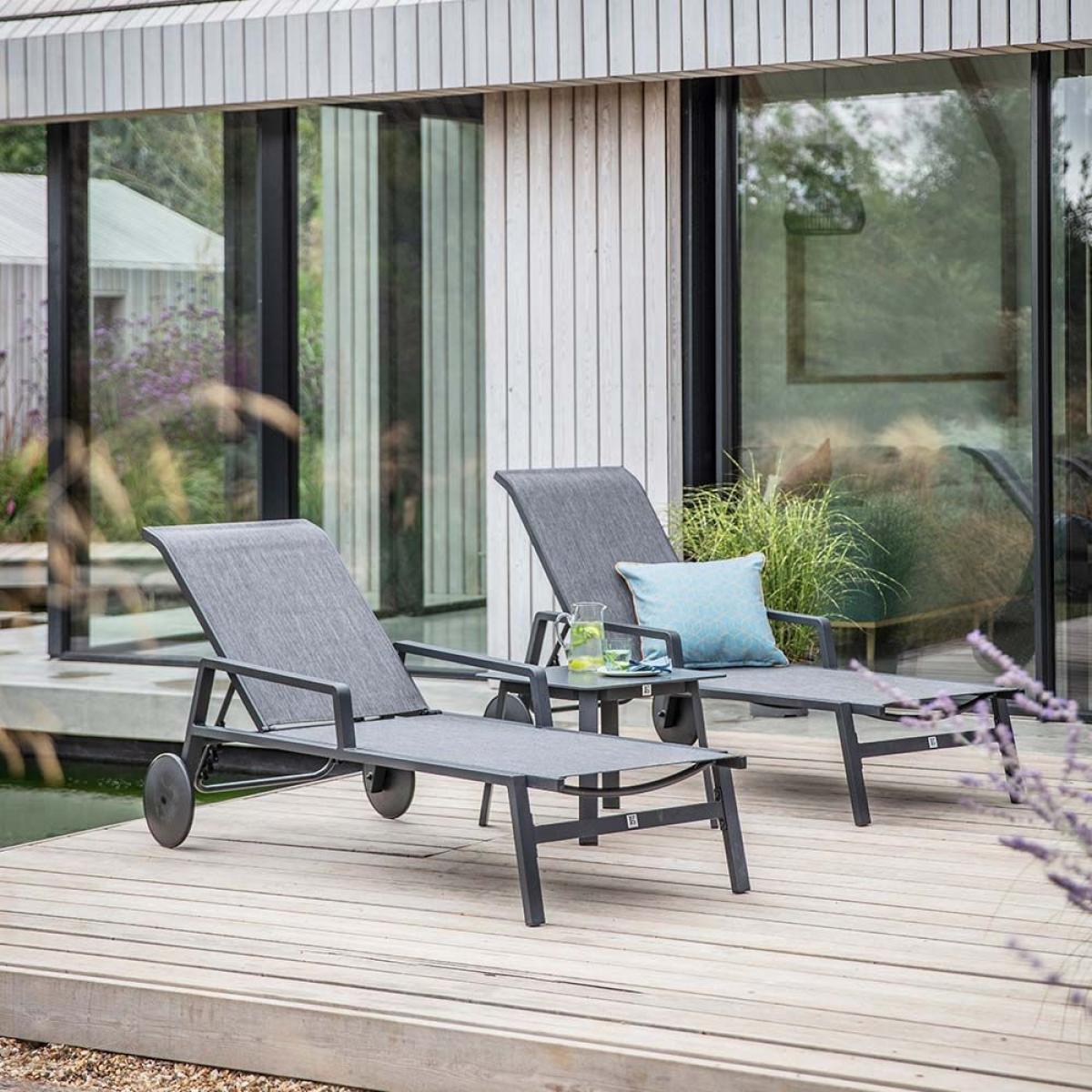 Lie back and relax on our modern and maintenance-free all-weather Allegra Sunloungers and Side Table. Featuring a high back and contemporary design, these reclining sunloungers are ultra-comfortable. Our set includes 2 sunloungers and a table. The table has a contemporary slatted aluminium tabletop so it matches wonderfully and is also lightweight and easy to move. Perfect poolside as well as for patios, terraces, courtyards, decking and balconies. Our Allegra range is sleek, streamlined and contemporary. Modern and maintenance-free, it’s also lightweight and weatherproof so will look good for years to come. The Texteline design is comfortable and easy to move around while the graphite grey aluminium frames are rust-resistant and complement the slatted and hand-brushed wood-effect tabletops beautifully.