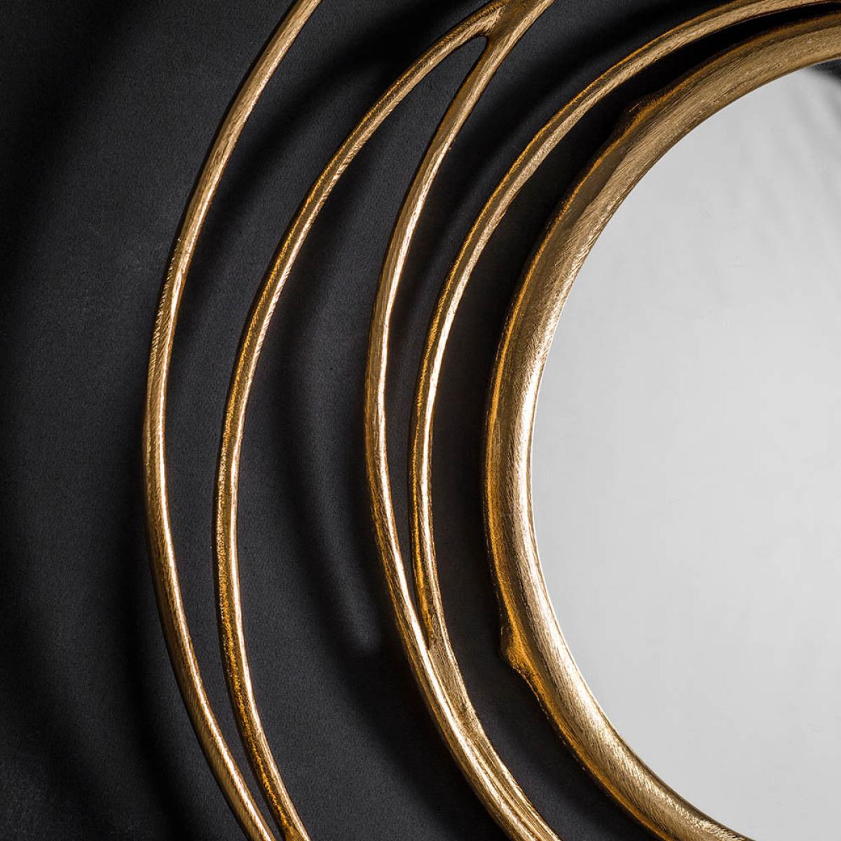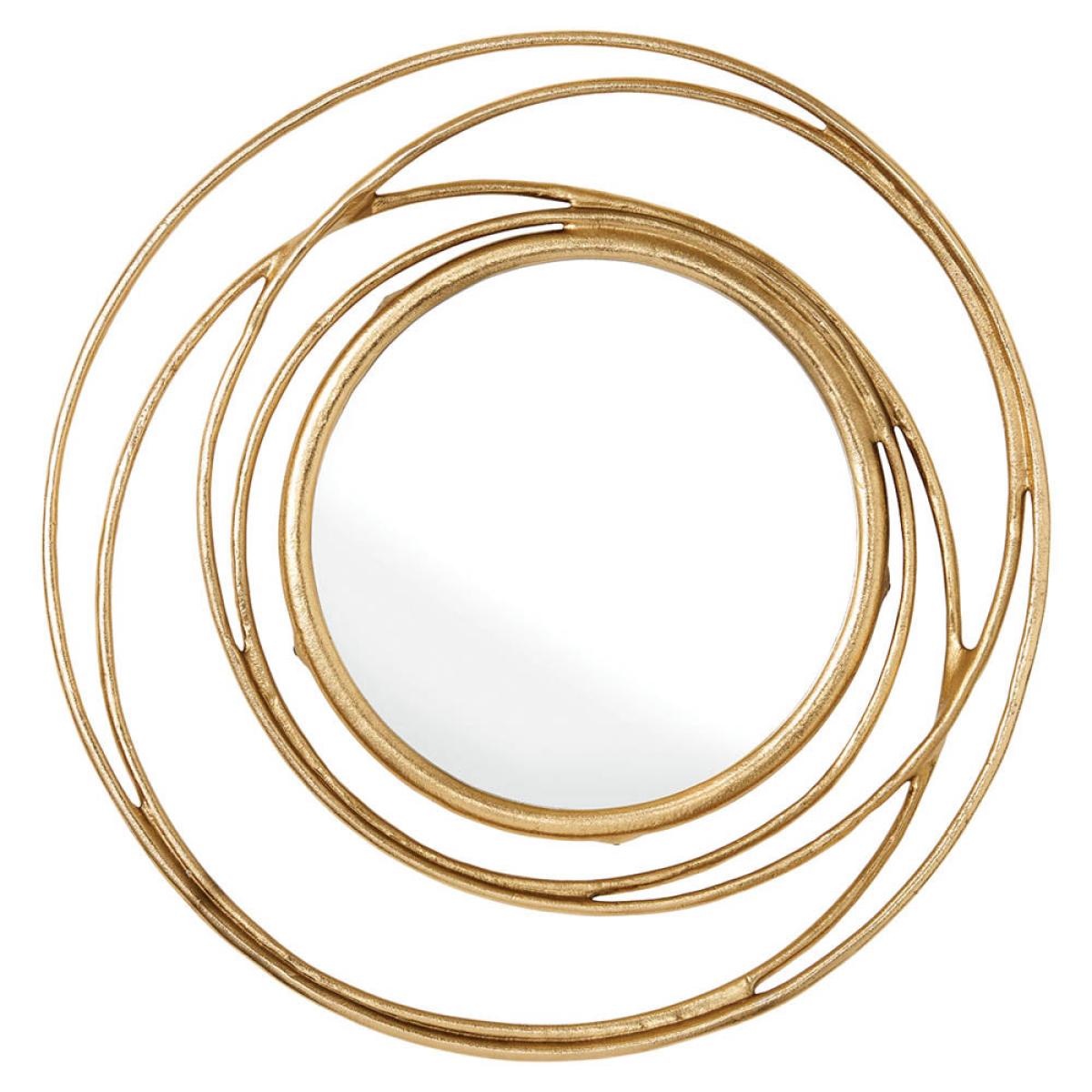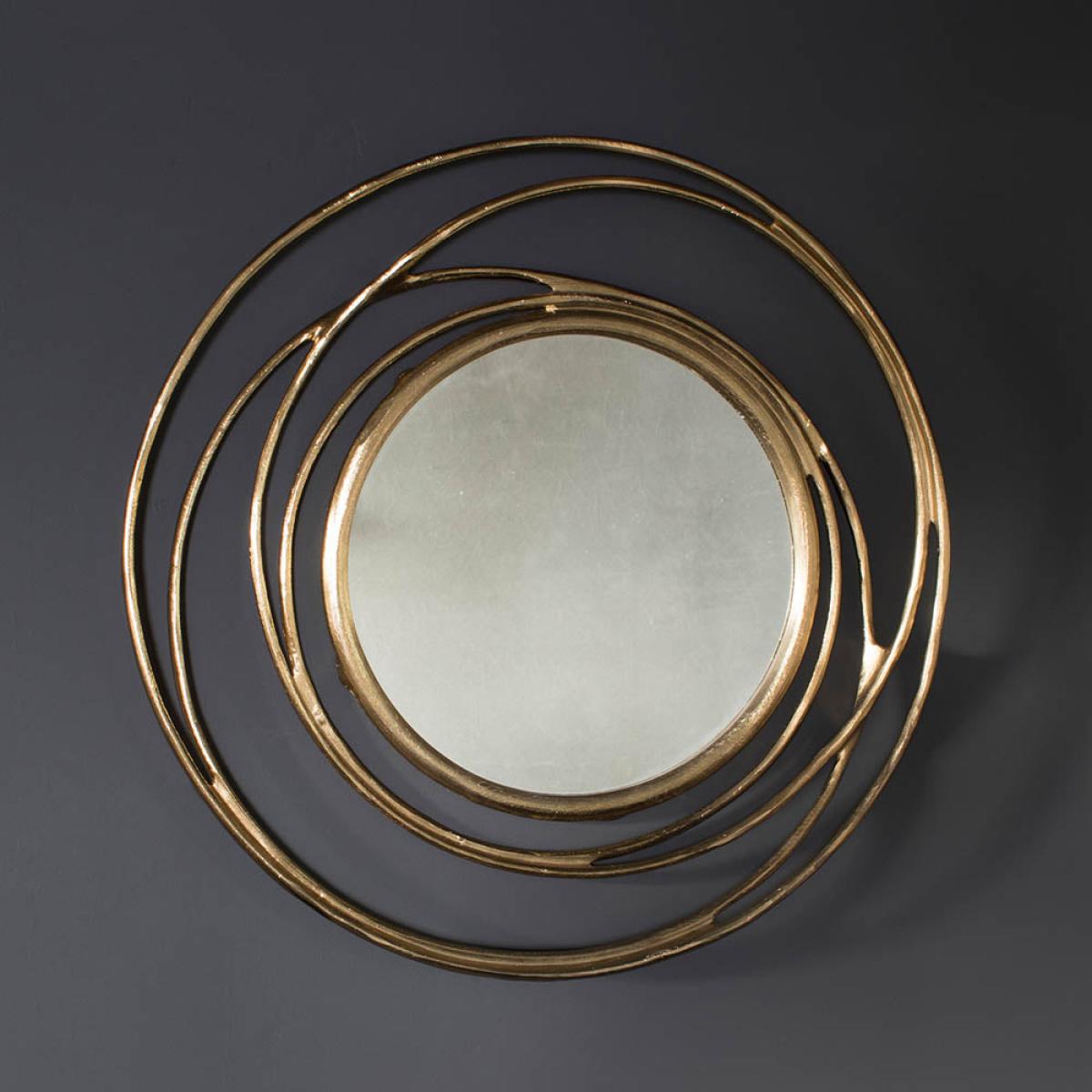 This usual mirror has an elegant satin gold frame with a looping circular design. This simplistic, decorative mirror is an eye-catching feature for any home.