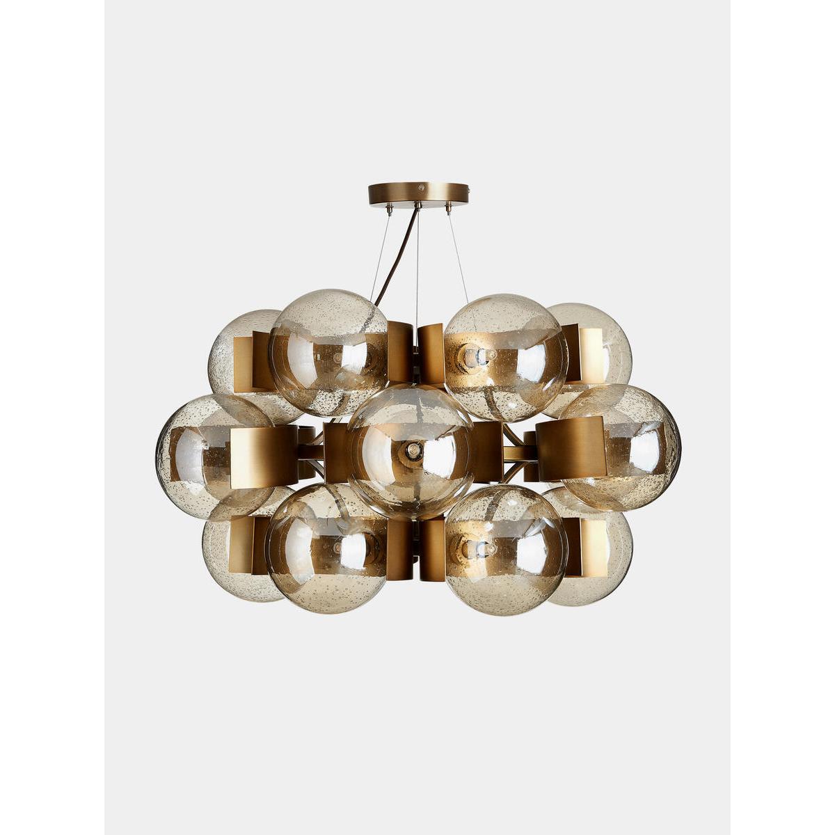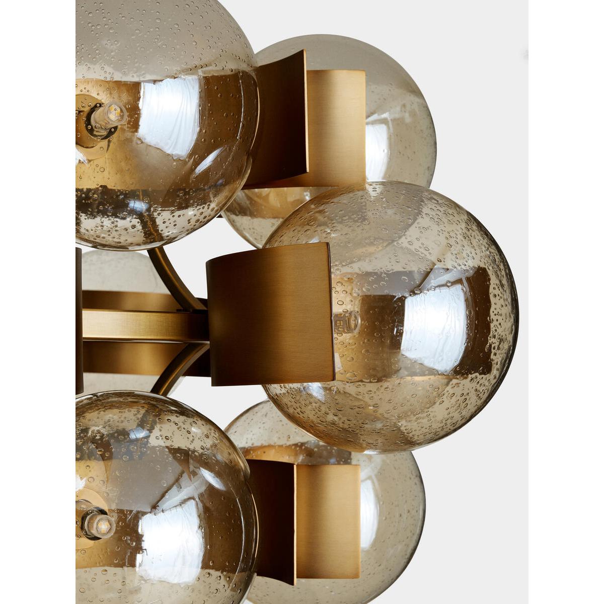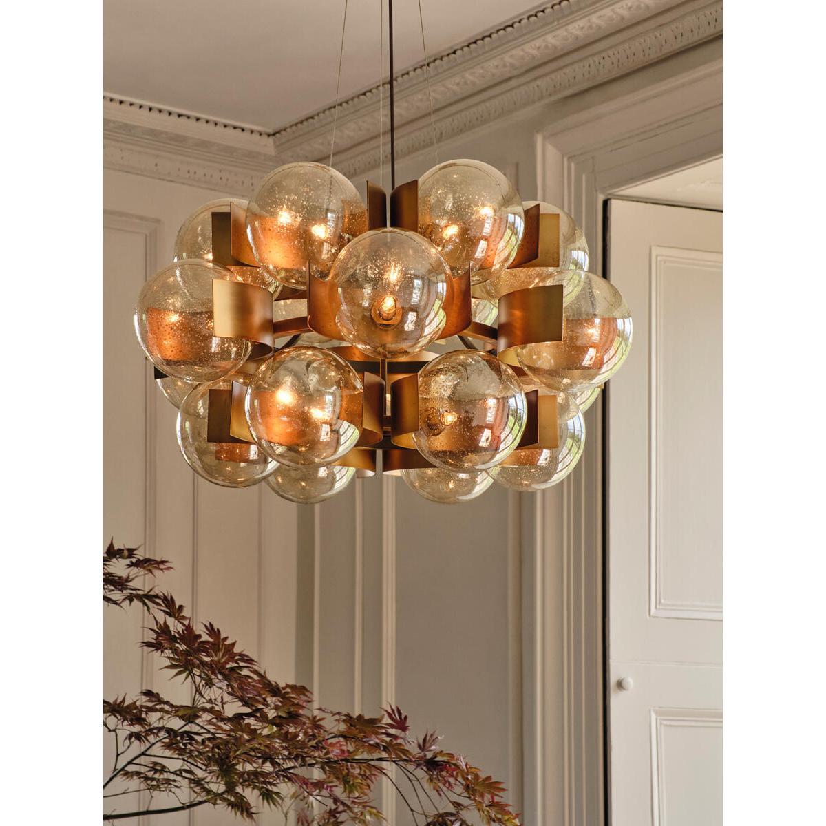 Featuring 18 tinted glass globes on an antique brass frame, the Allis large chandelier is our rendition of the vintage-style lighting in The Allis restaurant at White City House. Antique brass-plated metal frames elevate the champagne-tinted glass globes, which feature tiny bubbles that cast shadows and create subtle texture. Large pendant light with 18 glass globes Champagne-tinted globes with bubbles throughout the glass Antique brass metal frames behind globes Adjustable height Requires 18 x G9 / 28W max bulbs Inspired by the lighting at White City House