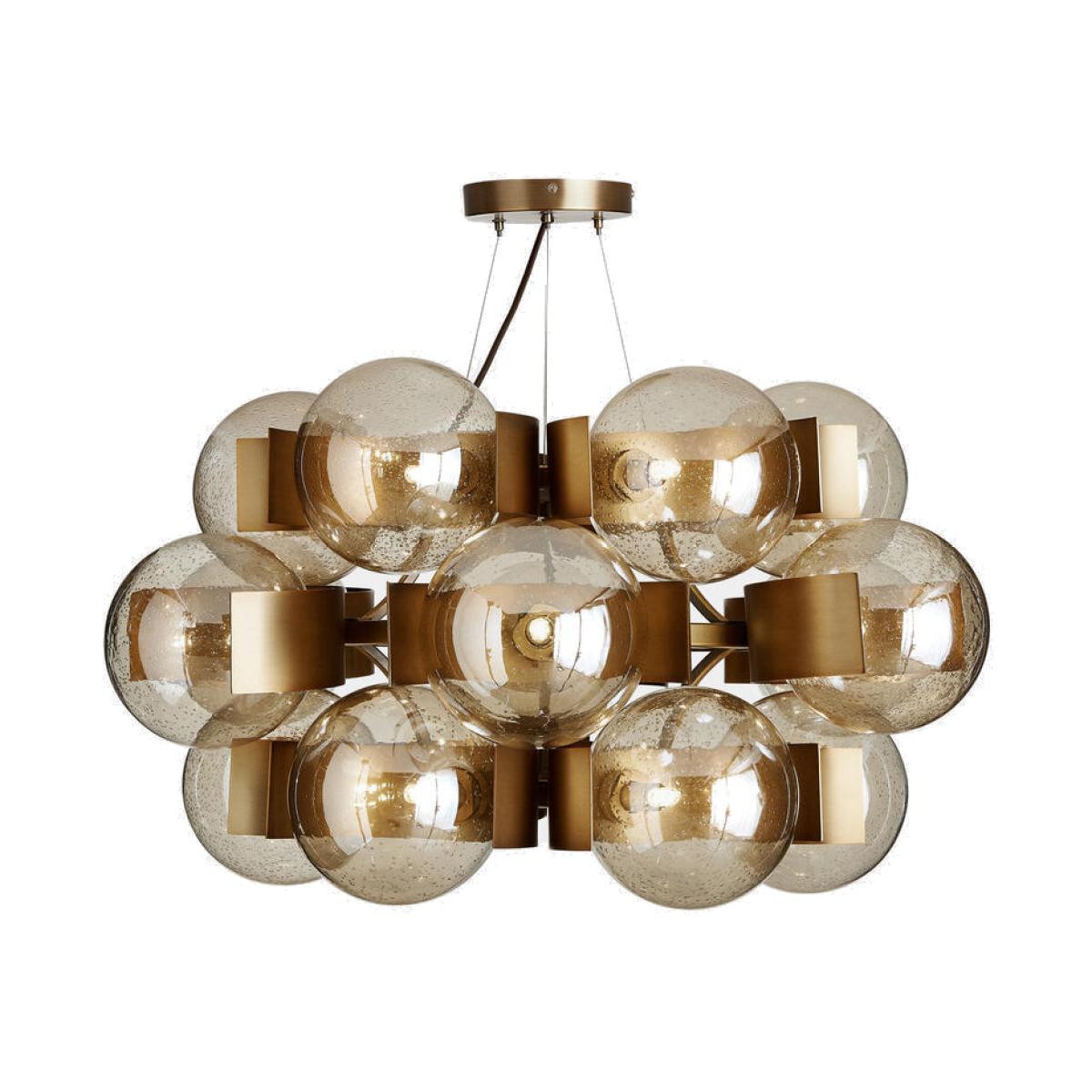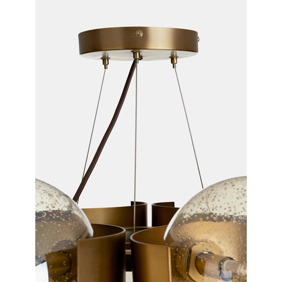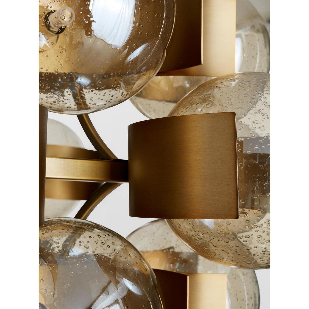 Featuring 18 tinted glass globes on an antique brass frame, the Allis large chandelier is our rendition of the vintage-style lighting in The Allis restaurant at White City House. Antique brass-plated metal frames elevate the champagne-tinted glass globes, which feature tiny bubbles that cast shadows and create subtle texture. Large pendant light with 18 glass globes Champagne-tinted globes with bubbles throughout the glass Antique brass metal frames behind globes Adjustable height Requires 18 x G9 / 28W max bulbs Inspired by the lighting at White City House