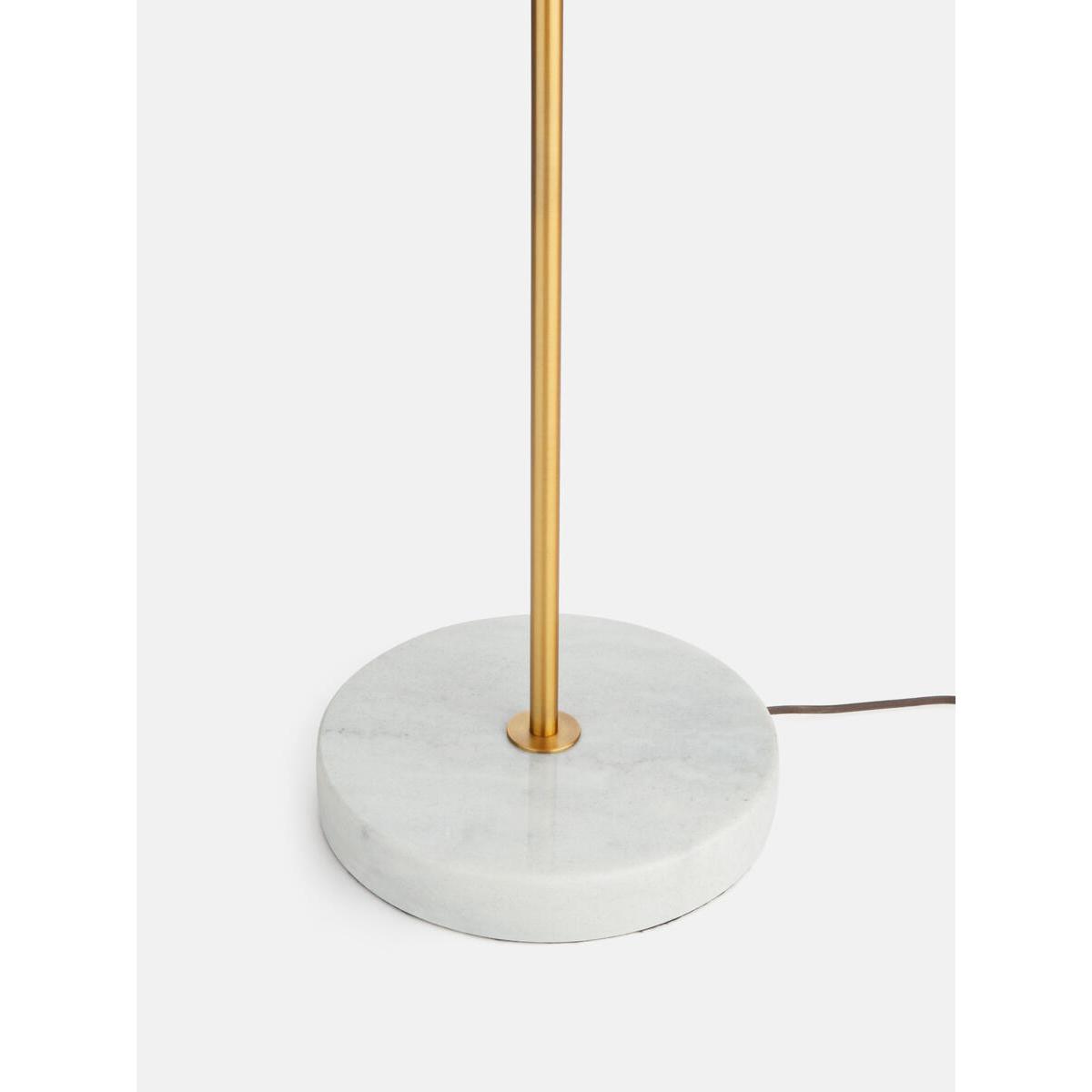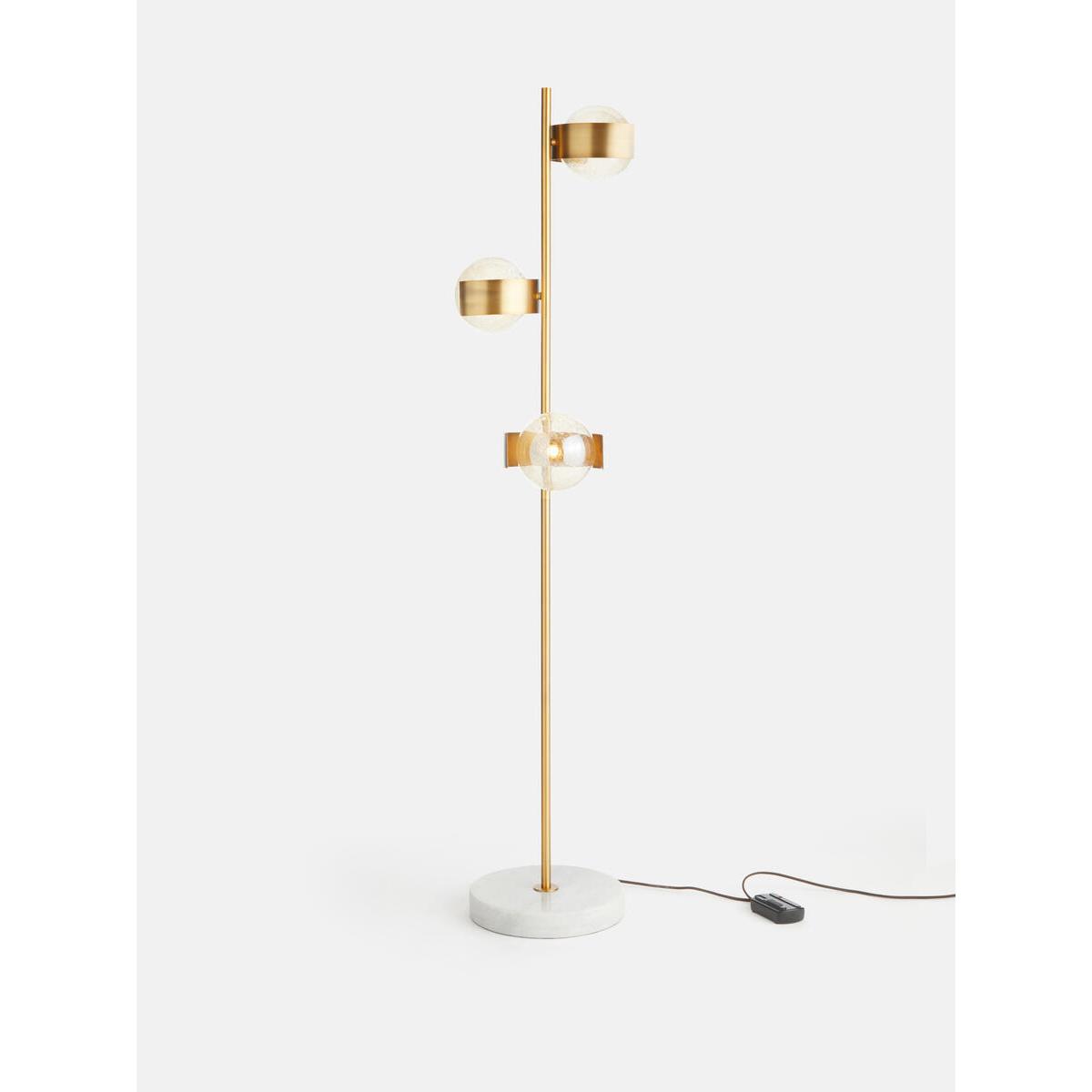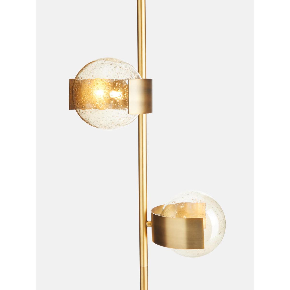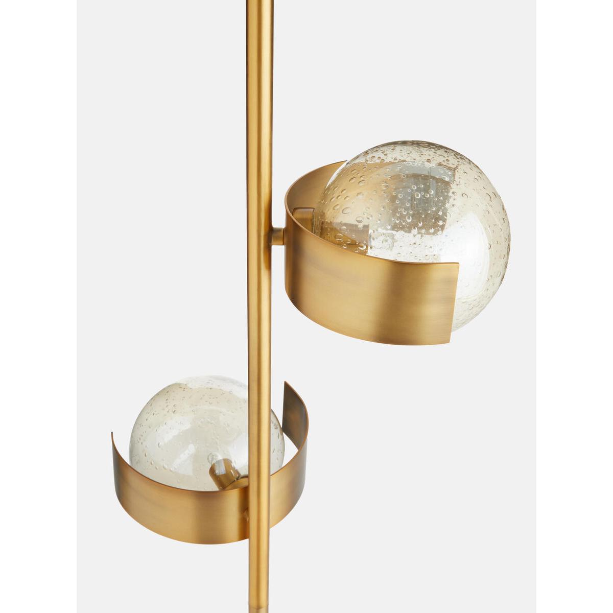 Featuring three tinted glass globes on an antique brass frame, the Allis floor lamp is our rendition of the vintage-style lighting in The Allis restaurant at White City House. A brass-plated metal frame and white marble base elevate the champagne-tinted glass globes, which feature tiny bubbles that cast shadows and create subtle texture. Also available as a chandelier style. Floor lamp with three glass globes Champagne-tinted globes with bubbles throughout the glass Brass-plated metal finish White marble base Available as a chandelier style Inspired by the lights in The Allis at White City House