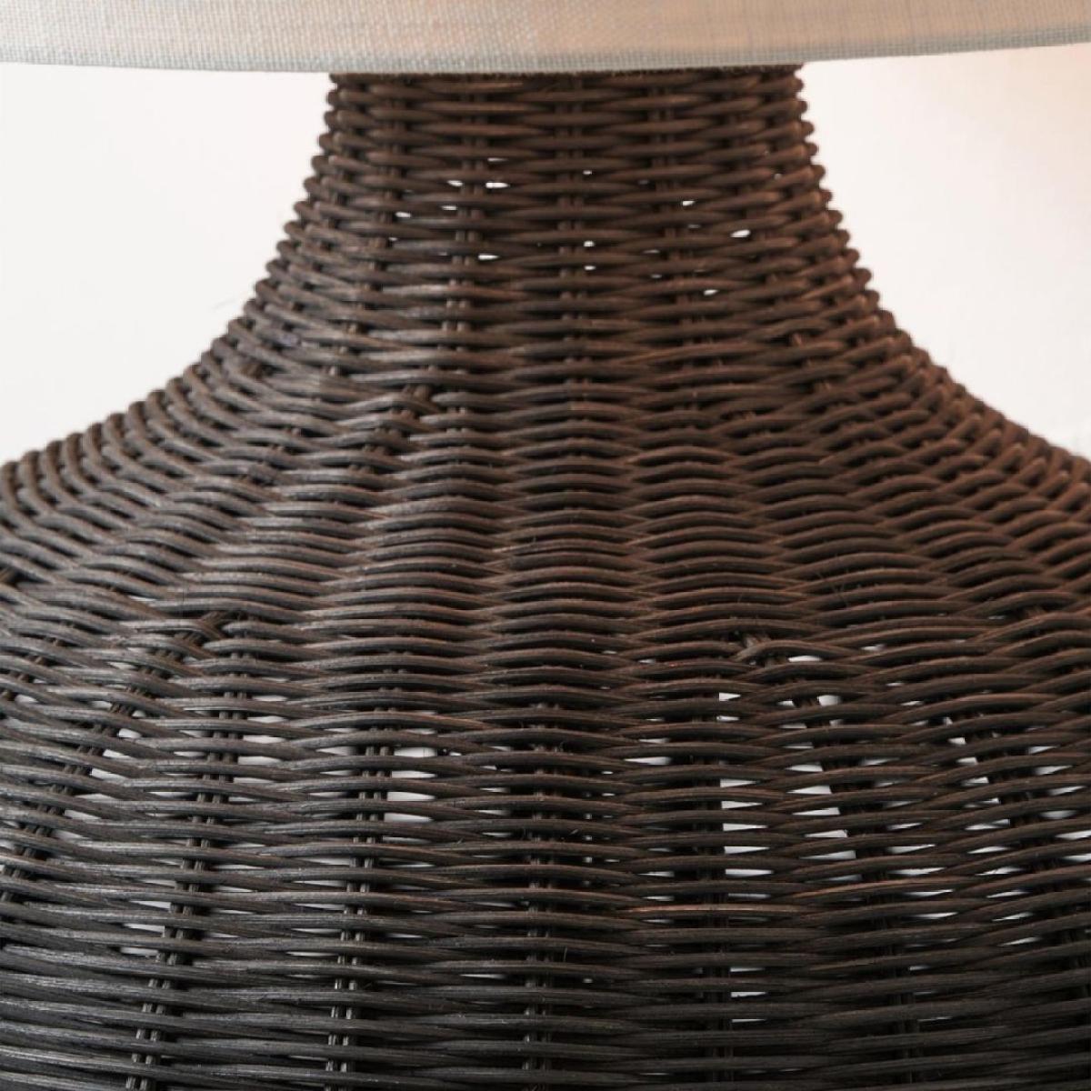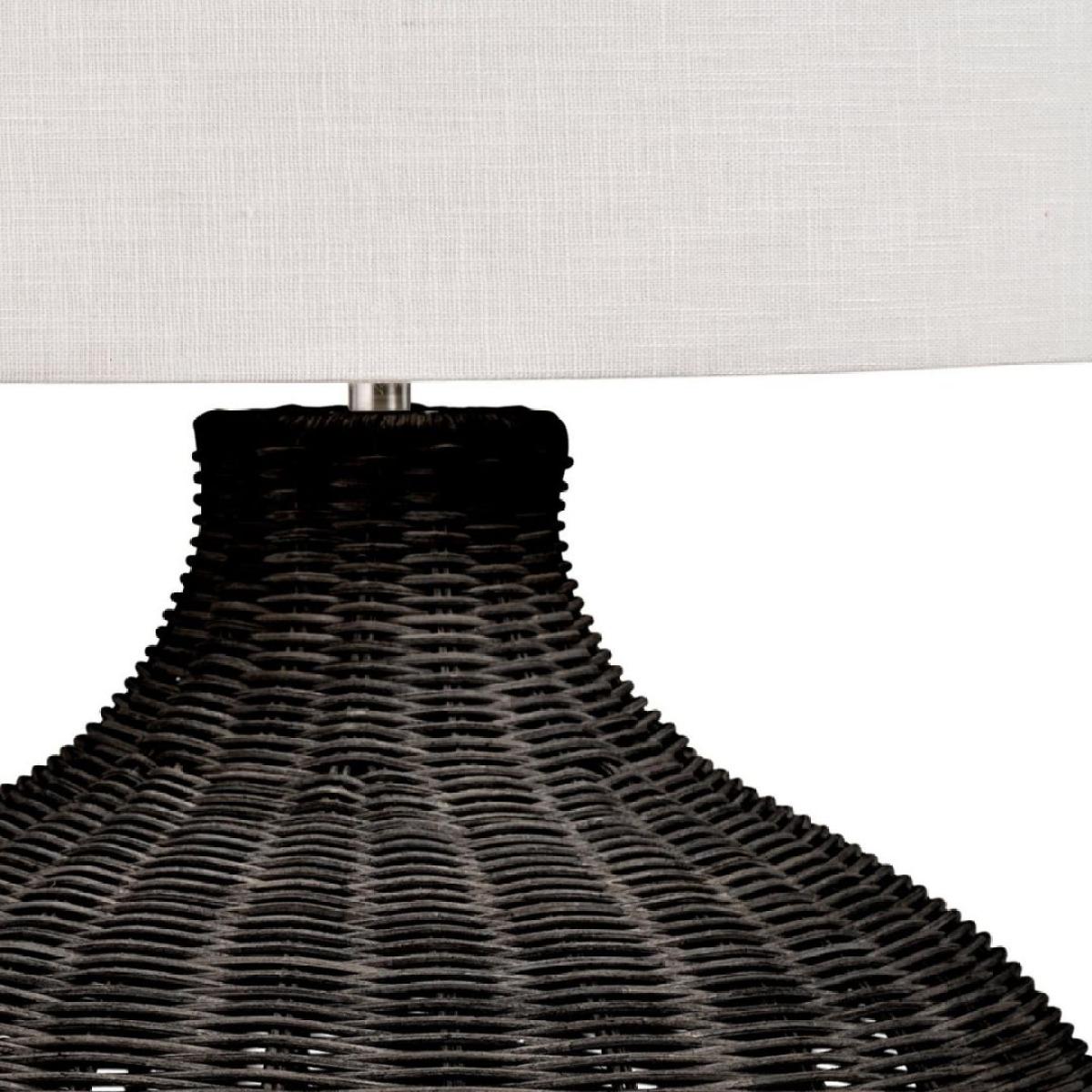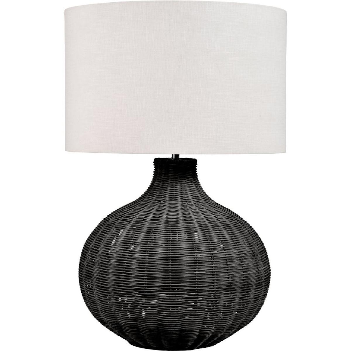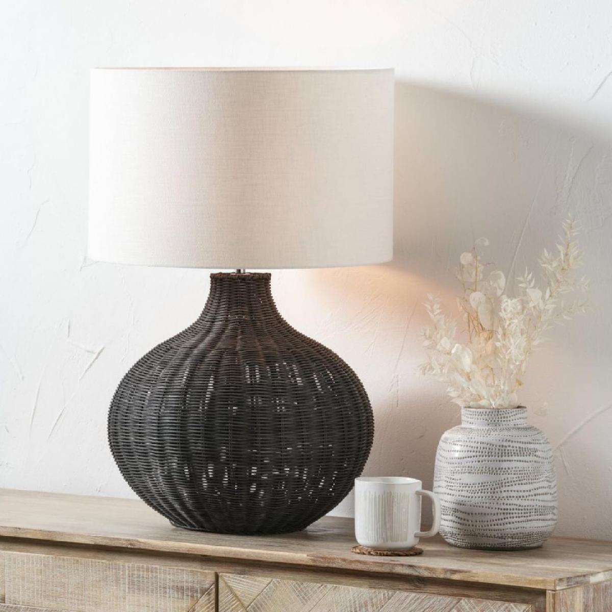 Allona 1-light table lamp, featuring a curved, black rattan base and a lined, white linen drum shade. Effortlessly combining natural texture with modern design, the Allona table lamp makes a stunning addition to any room. Its unique black rattan base brings a sense of organic elegance and a touch of bohemian design. The intricate weave of the rattan adds depth and character, creating a captivating focal point whether the lamp is on or off. Complementing the striking base is a lined, white linen drum shade that softens the light for a warm, inviting ambiance. The clean lines of the shade contrast beautifully with the curved shape of the base and natural texture of the rattan, balancing rustic charm with contemporary sophistication. Perfect for living rooms, bedrooms or hallways, the Allona table lamp is a versatile piece that adds both style and warmth to your space. Allona 1-light table lamp, featuring a curved, black rattan base and a lined, white linen drum shade. Effortlessly combining natural texture with modern design, the Allona table lamp makes a stunning addition to any room. Its unique black rattan base brings a sense of organic elegance and a touch of bohemian design. The intricate weave of the rattan adds depth and character, creating a captivating focal point whether the lamp is on or off. Complementing the striking base is a lined, white linen drum shade that softens the light for a warm, inviting ambiance. The clean lines of the shade contrast beautifully with the curved shape of the base and natural texture of the rattan, balancing rustic charm with contemporary sophistication. Perfect for living rooms, bedrooms or hallways, the Allona table lamp is a versatile piece that adds both style and warmth to your space.