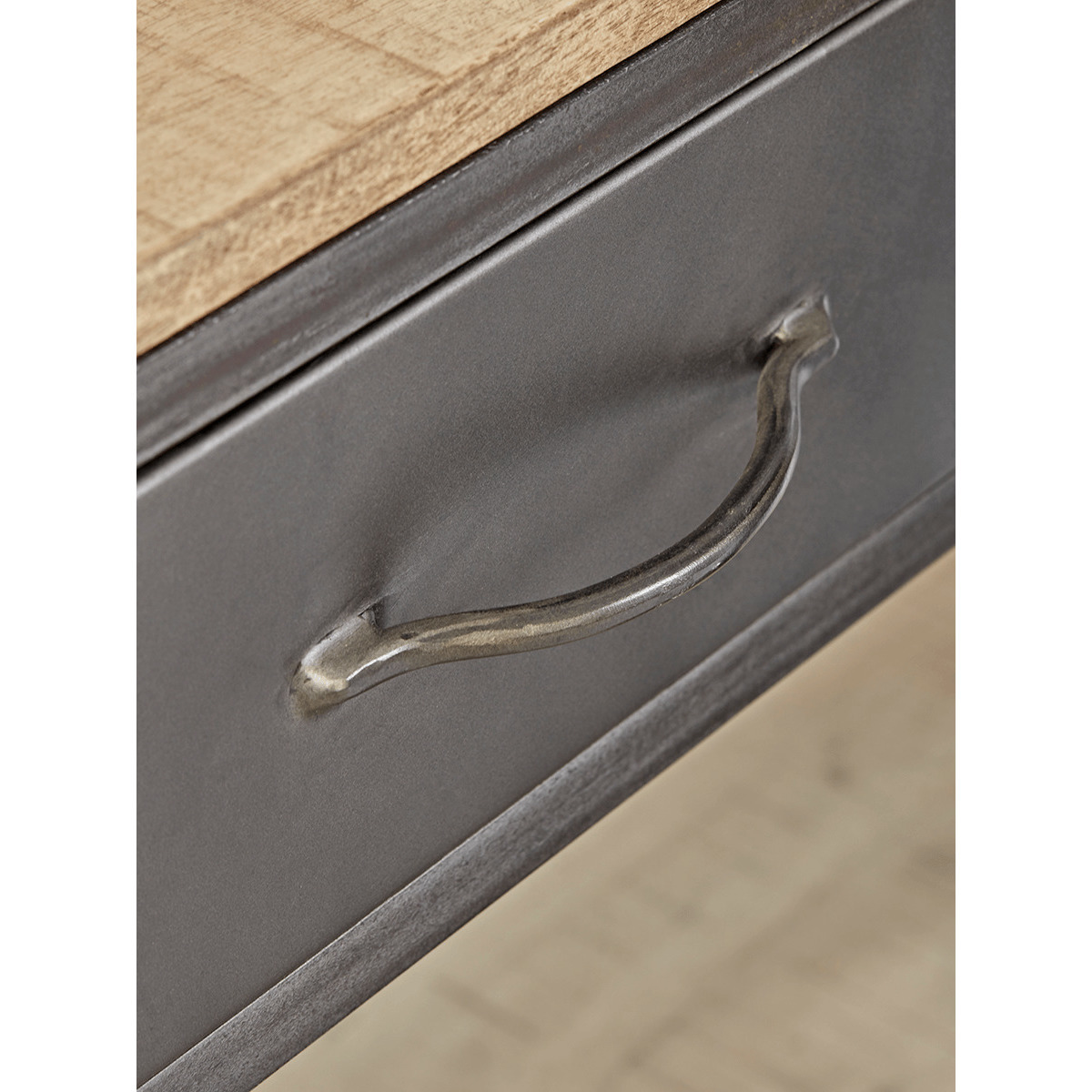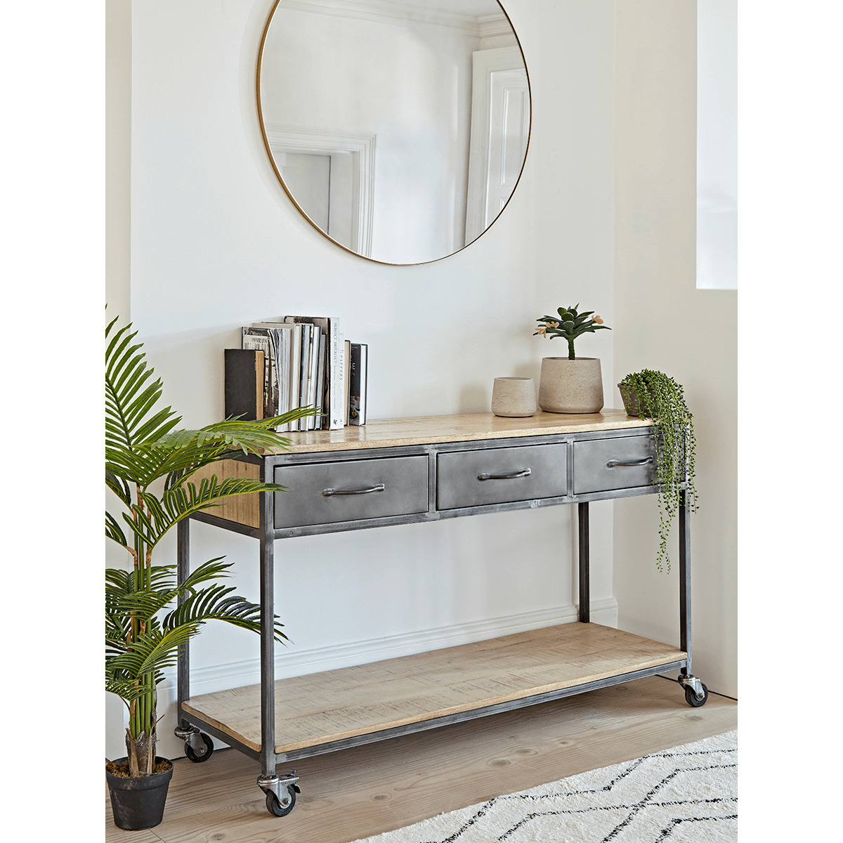 Our generously sized console with three large drawers has a lighter contemporary appearance because of the contrast materials of wood and metal, and the large open form. Simple shaped metal handles feature on each drawer and the open metal frame and castor legs add to the industrial tone. A practical and stylish solution to dress your hallway both for surface to hold decorative accents and for storage to stow those everyday items.