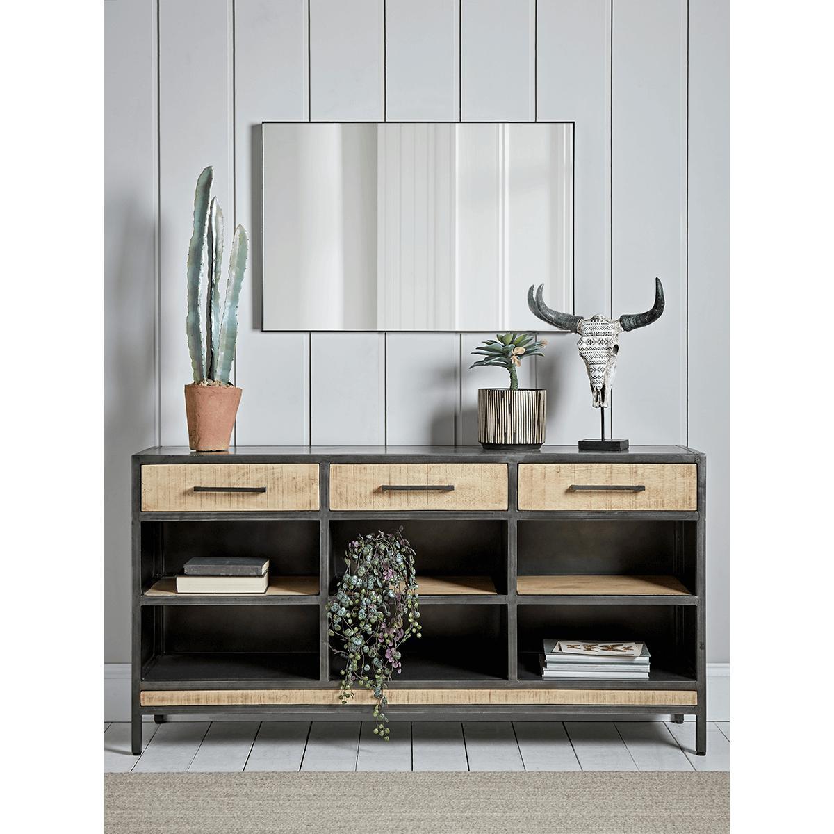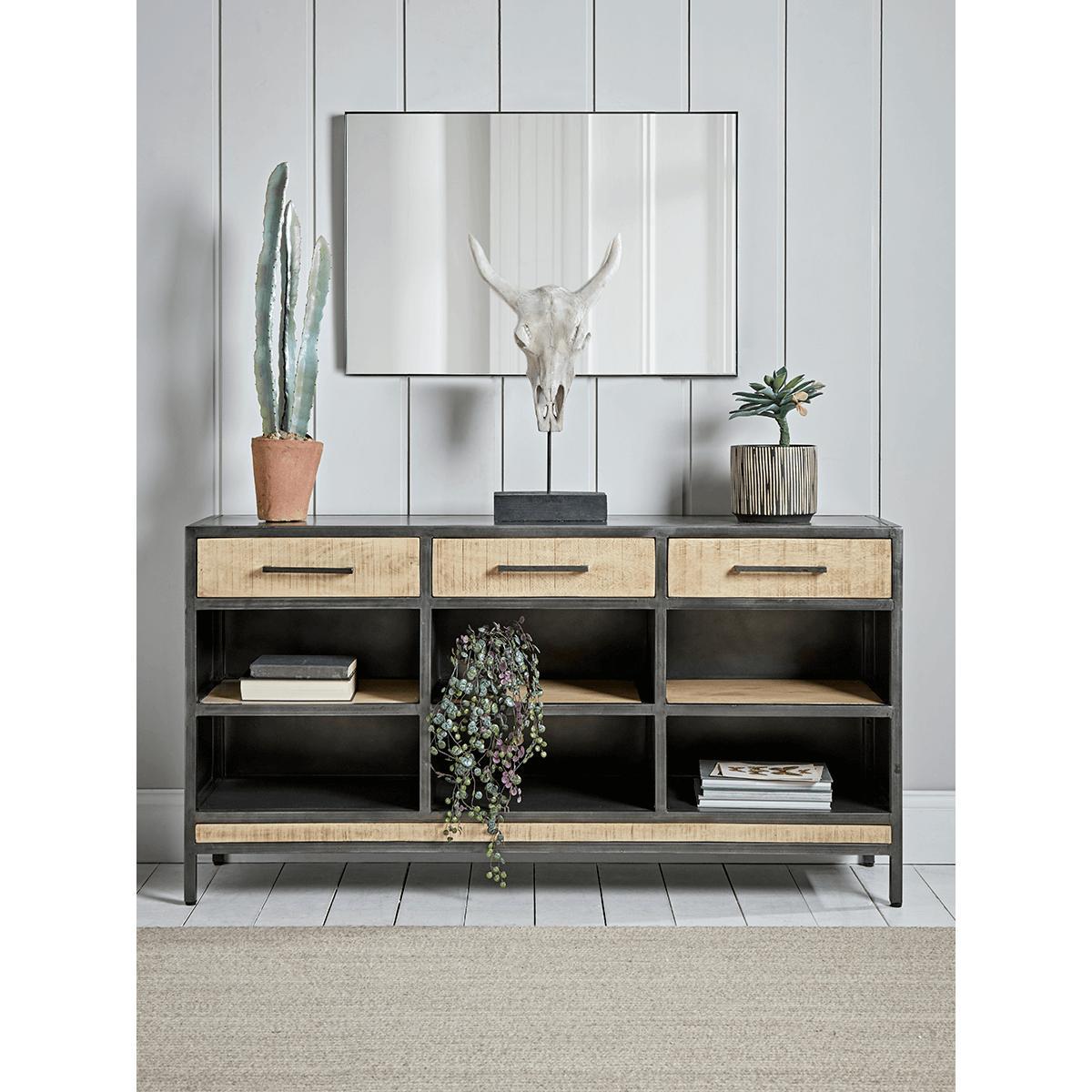Our Allston Storage Console is beautifully crafted from natural toned wood, with visible wood grain details, with a stylishly simple and dark toned frame to highlight the form. Our console has three drawers to stow, and six open shelves to display books, magazines and those objet we wish to show. Ample surface provides a surface over which to hang a mirror, or on which to display a feature accessory, a truly fantastic addition to the home. A versatile piece of design; its clean proportions and the slender lines of its frame are well suited to a Nordic scheme, whilst the use of hardworking materials pairs it easily to an industrial look.