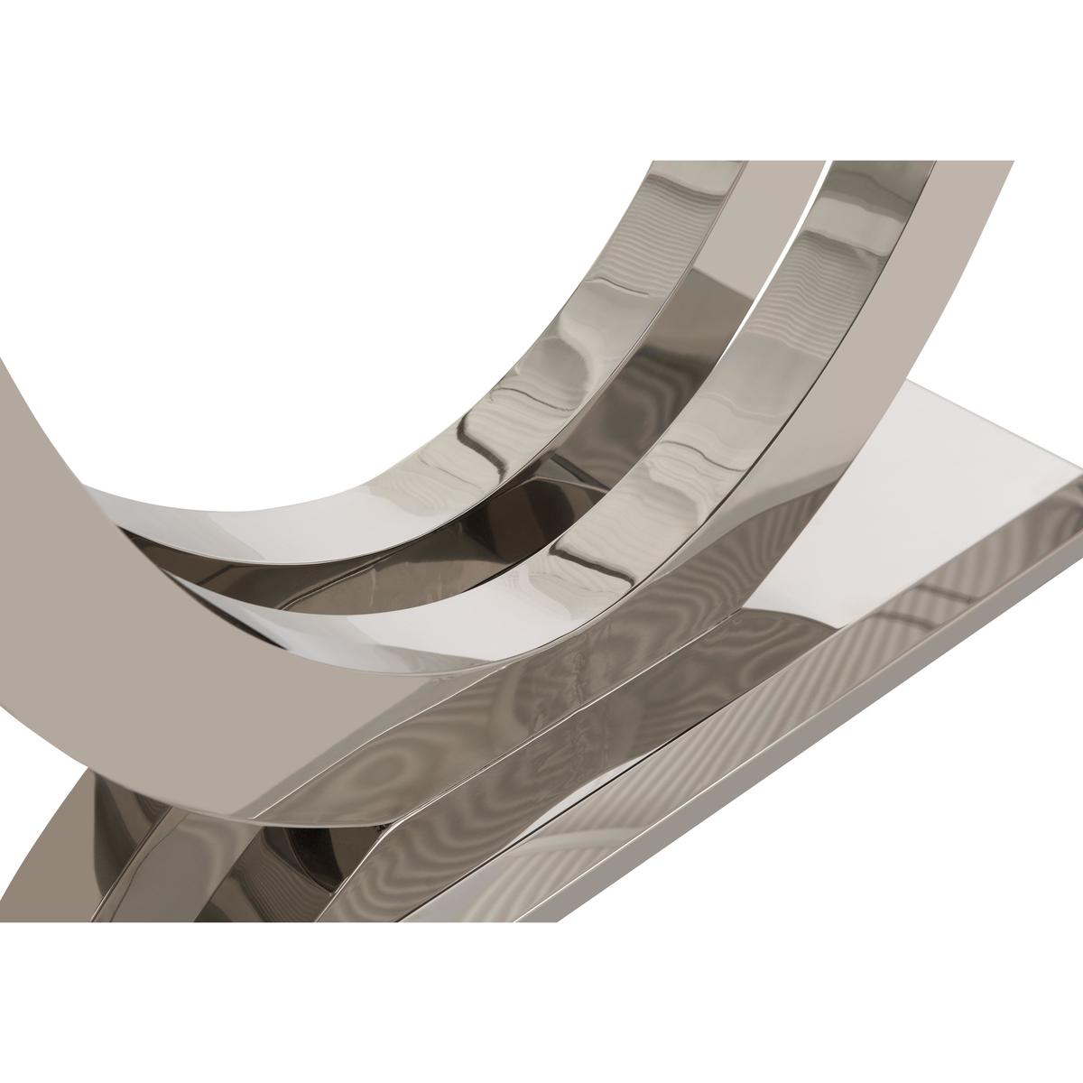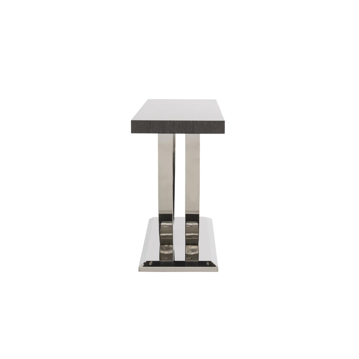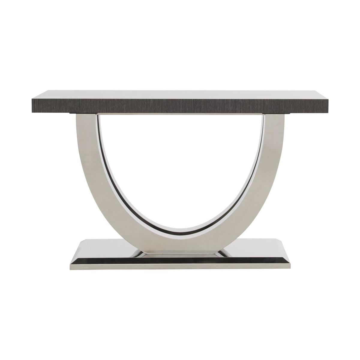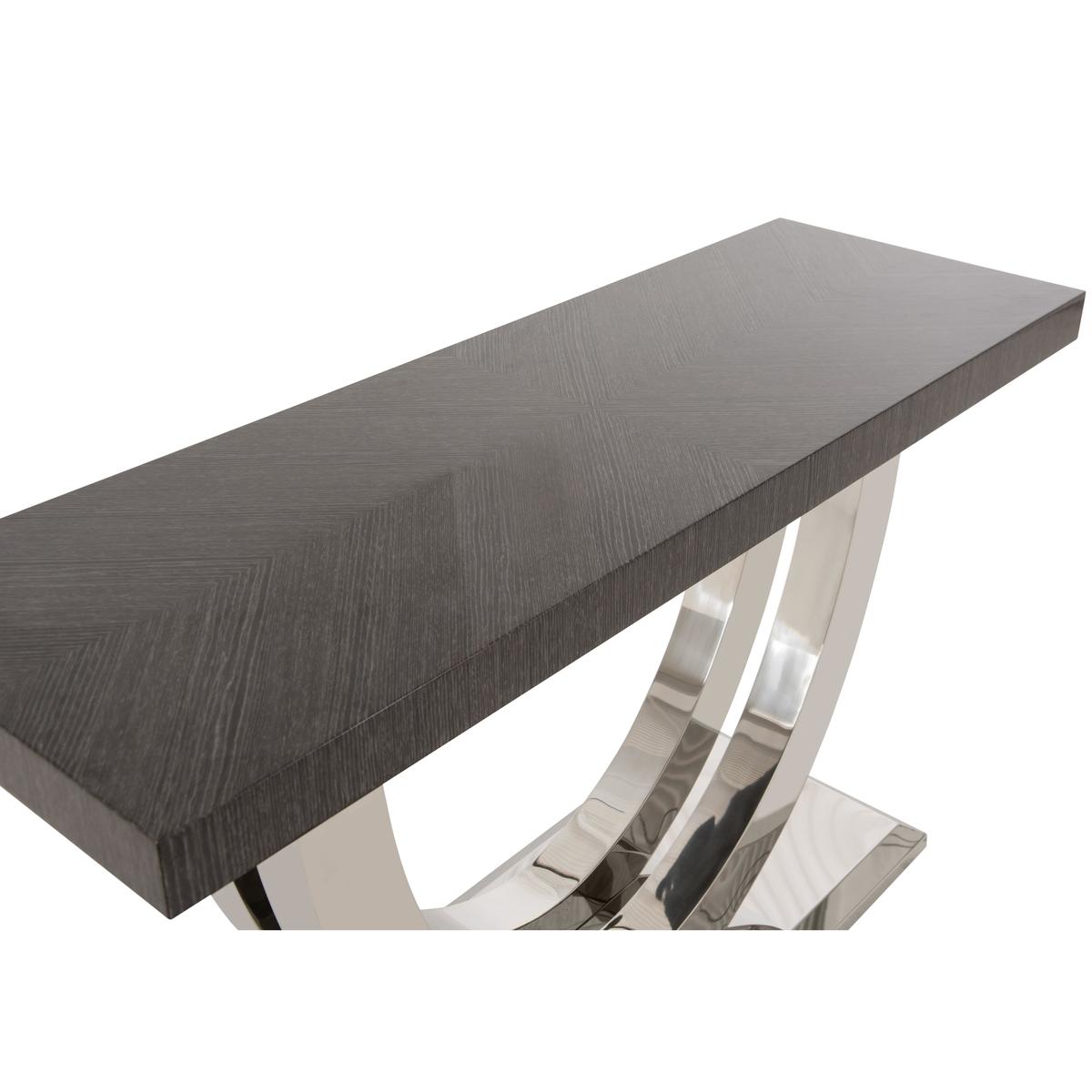 Striking and glamorous console table. Top is beautiful, dark grey patterned veneer. With a high-gloss lacquered finish. Elegantly curved base and stand made of shiny stainless steel. Unique and original design makes a statement in any home. Sleek and contemporary living room style. Did you know? Hairline marks are a natural feature of a lacquered finish. As such, no two pieces are exactly the same.