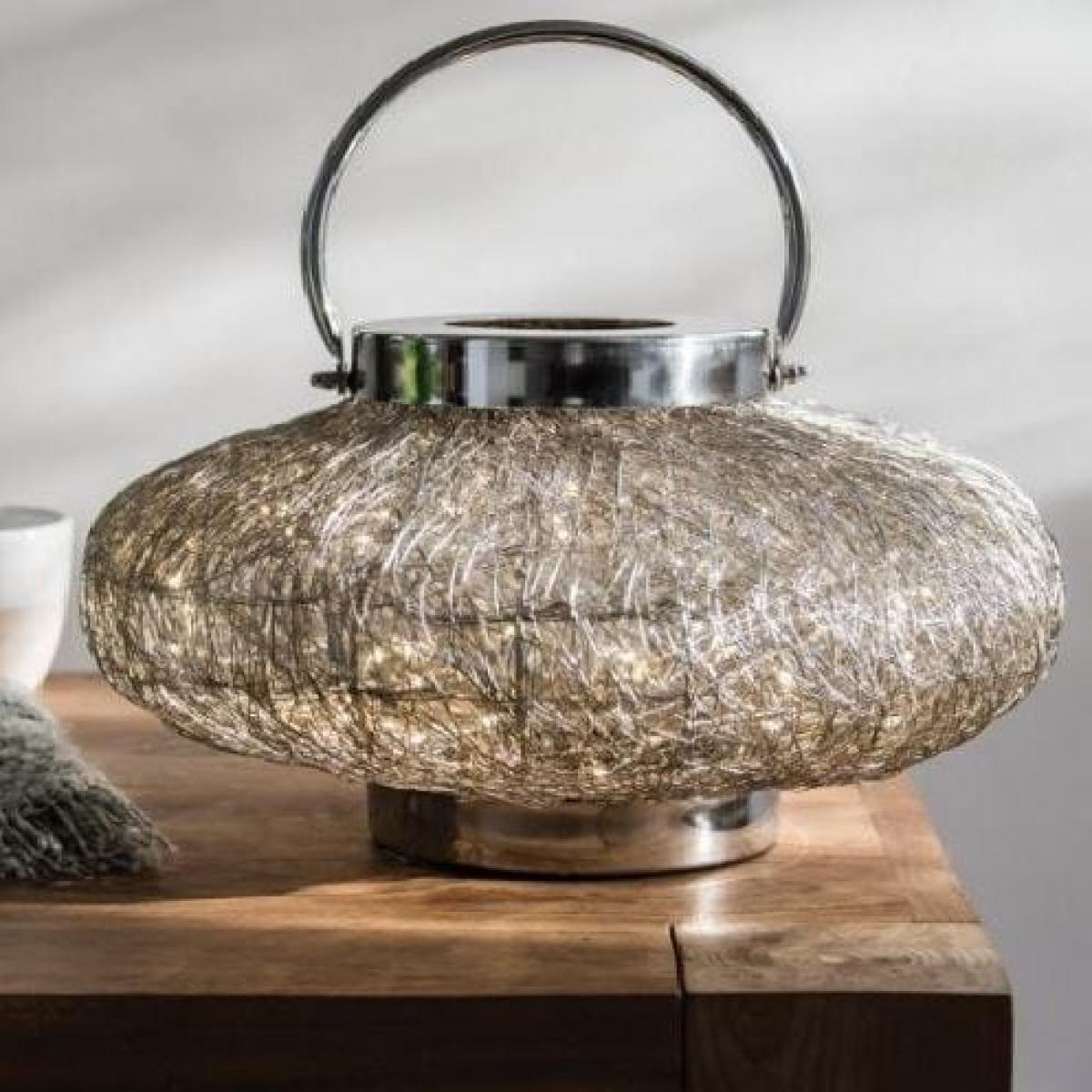 A lamp can bring so much more than light to a room our Wire weave lamp does just that. Nickel plated mesh-wire weaved with fairy lights combind to create these alluring and highly original lamps. They are stylish by day and even more so by night. The fairy light strings should 'twinkle' for around 2500 hours. W38cm D38cm H24cm Supplied with bulbs Modern design