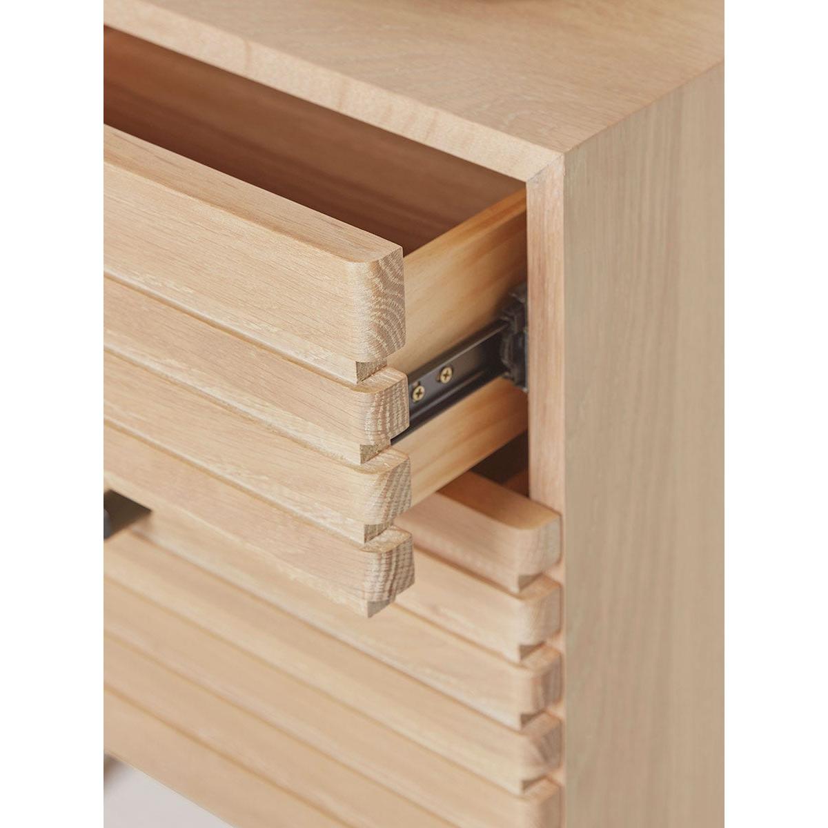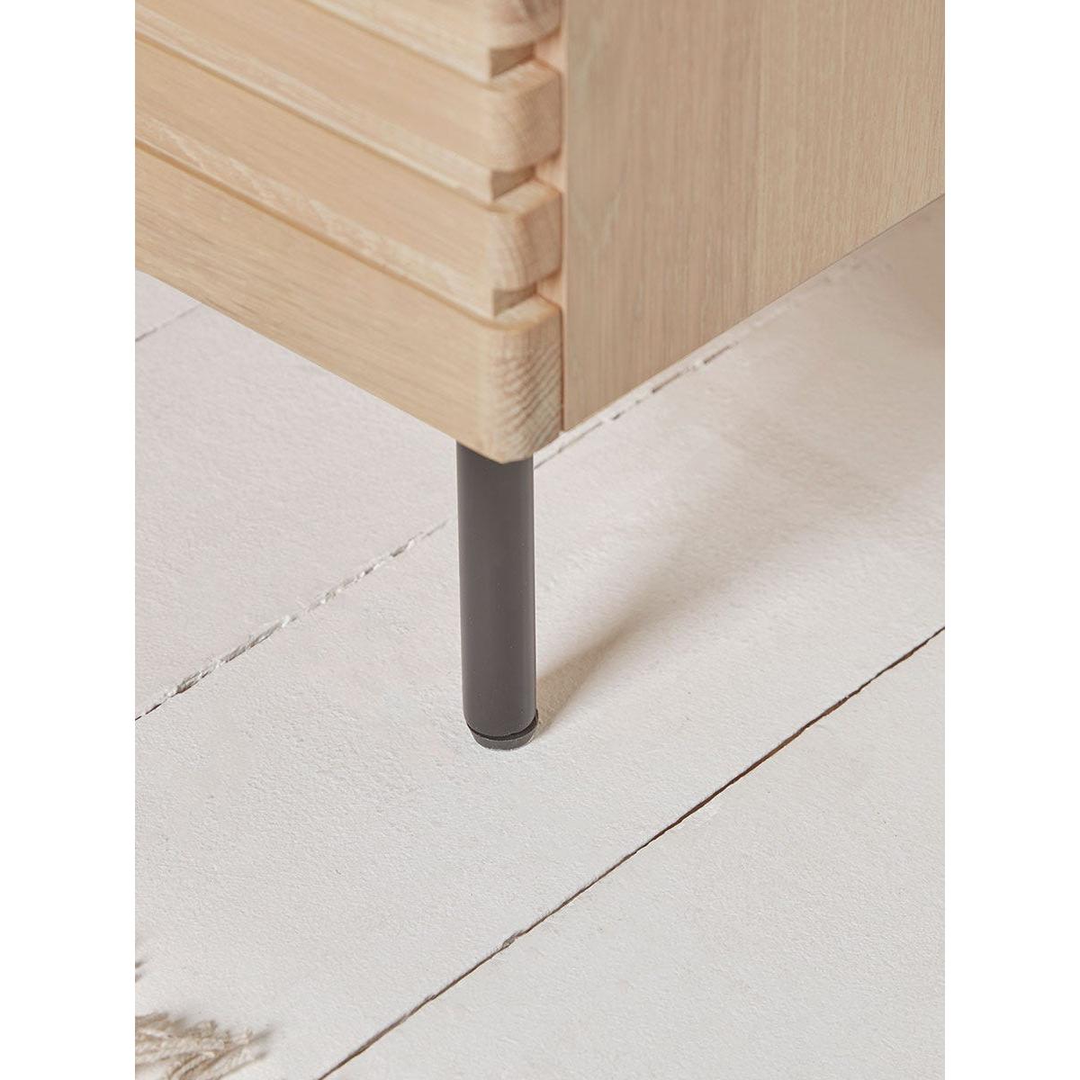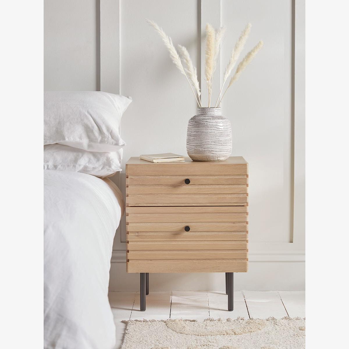 Filled with the texture and warmth of real oak, our Alma Bedside Table is a stylish addition to a neutral scheme where the natural beauty of the wood can shine. A simple boxy shape is enhanced with slatted front panels to the two drawers and the whole piece is set on slim metal legs for a clean finish. An Alma Clothes Rail is also available.