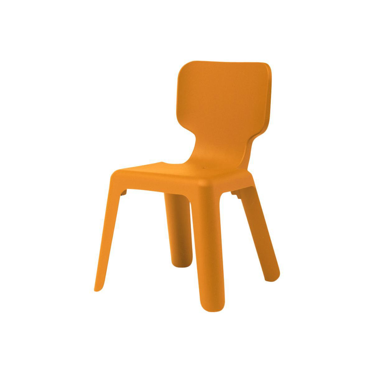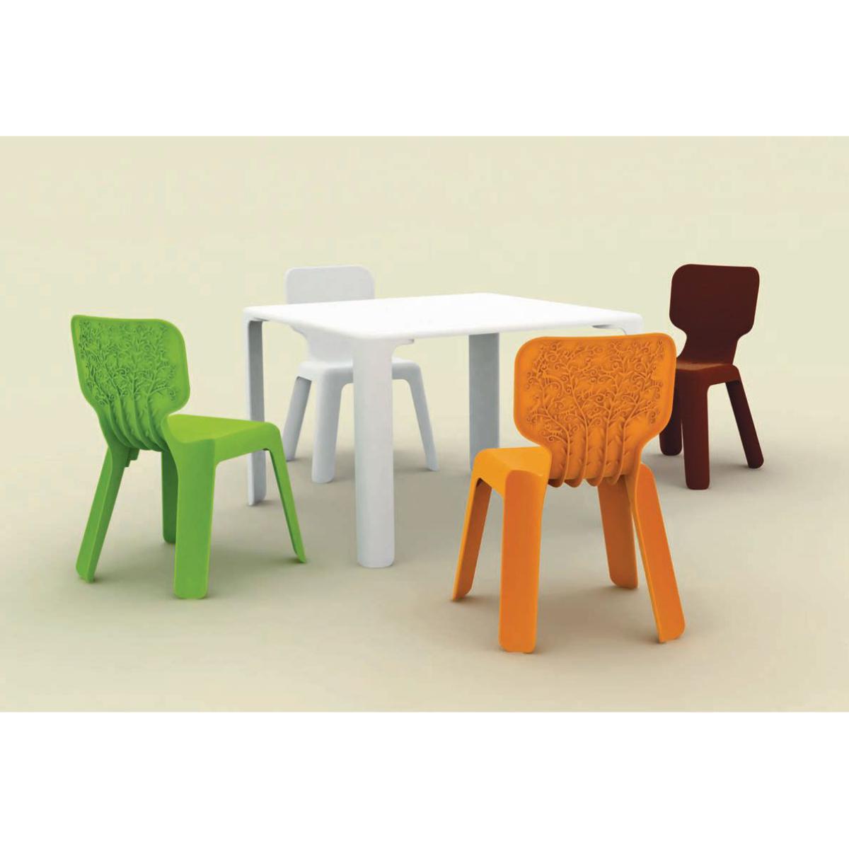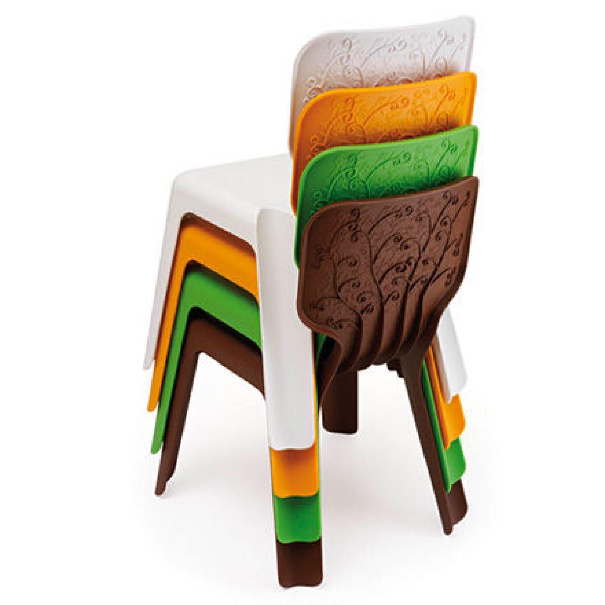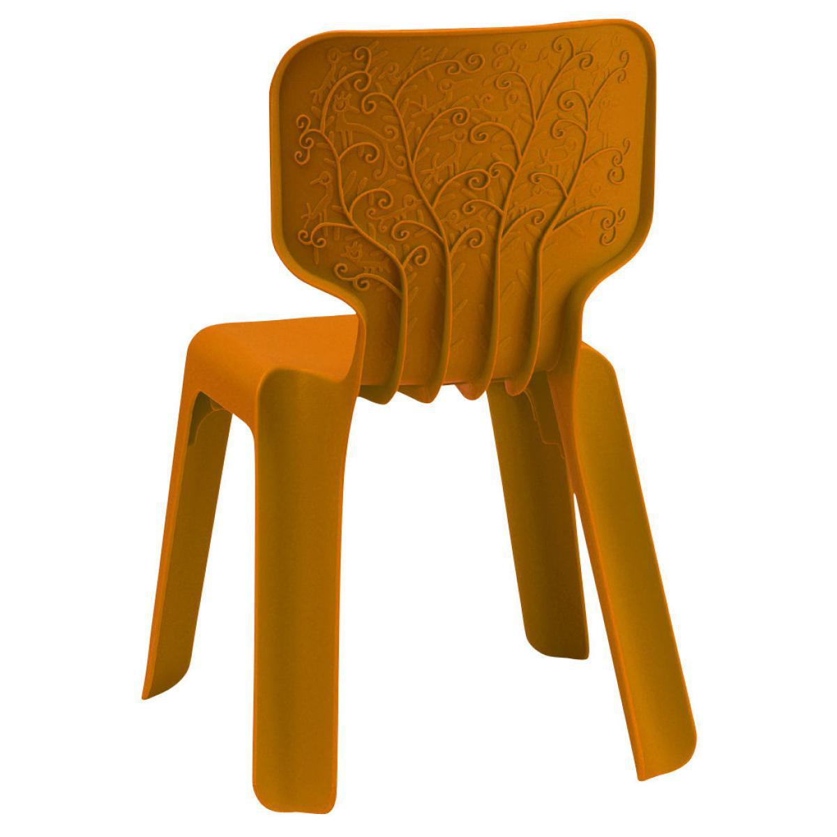 Design Javier Mariscal. A chair for children, made in fibreglass-reinforced polypropylene, standard injection moulding. The heart of the chair lies in the ribbing of the backrest. Structurally necessary, it was resolved without using the usual geometric patterns, but by making the branches of a tree, upon which Mariscal's creative impetus accordingly perched some little birds here and there. It comes in four colours that best represent the different seasons: green (spring), orange (summer), brown (autumn) and white (winter).