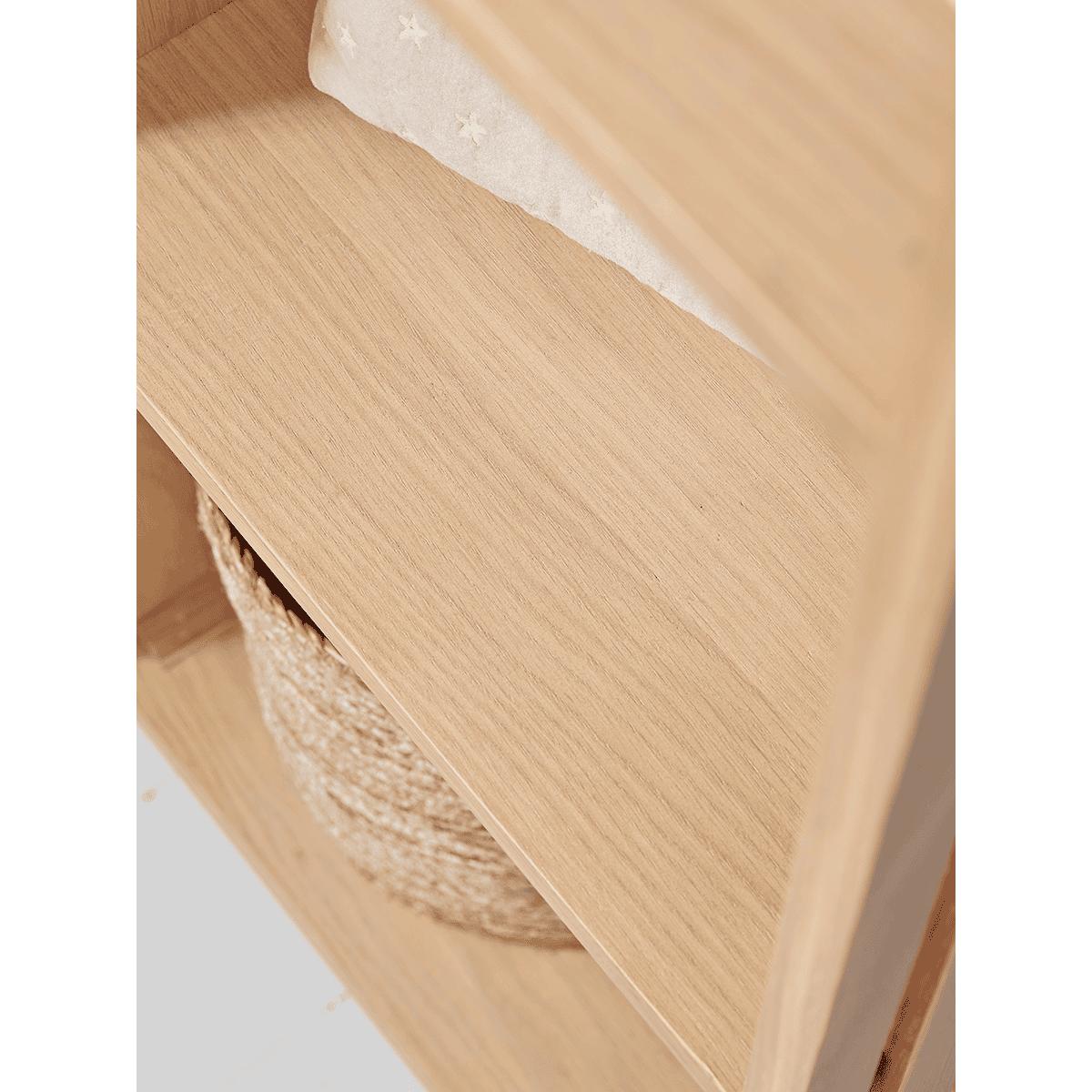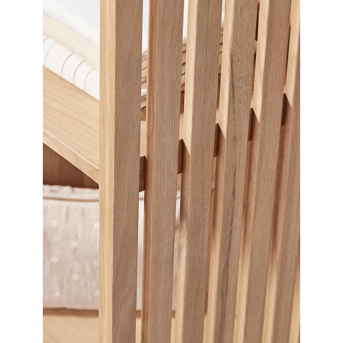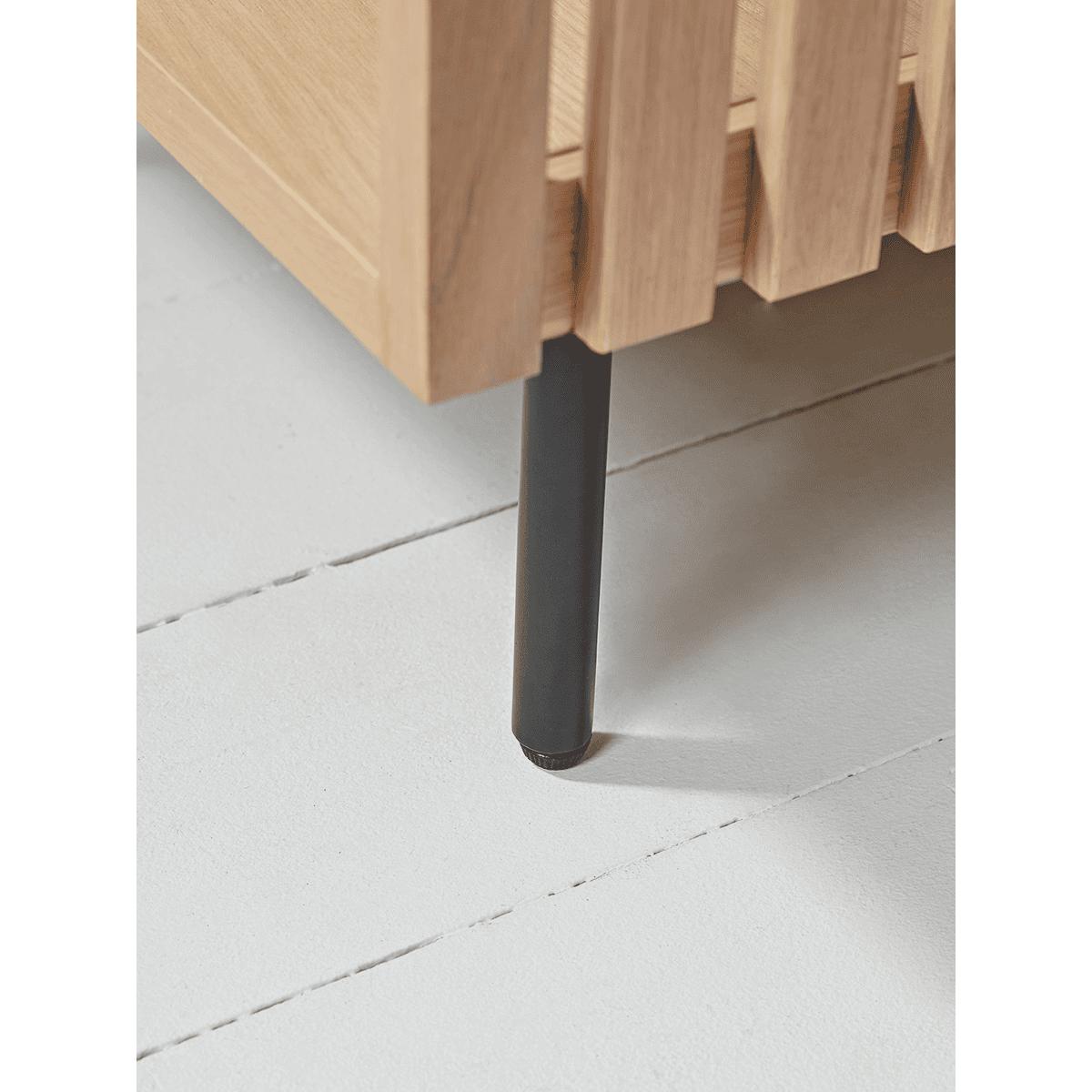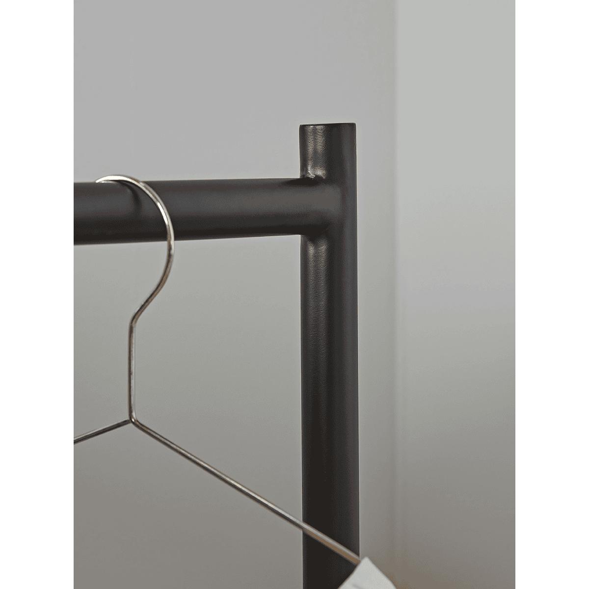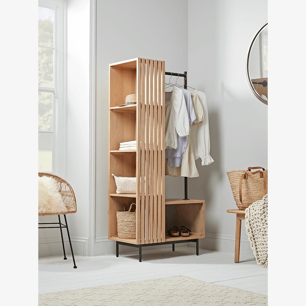 A minimalist storage option that’s perfect for small spaces or guest rooms, our Alma Clothes Rail doesn’t skimp on style or charm. The slatted end panel keeps the look airy and the warm tones of the oak contrasts effectively with the black metal rail and legs. The slats conceal four open shelves and there is a further storage shelf beneath the clothes rail.