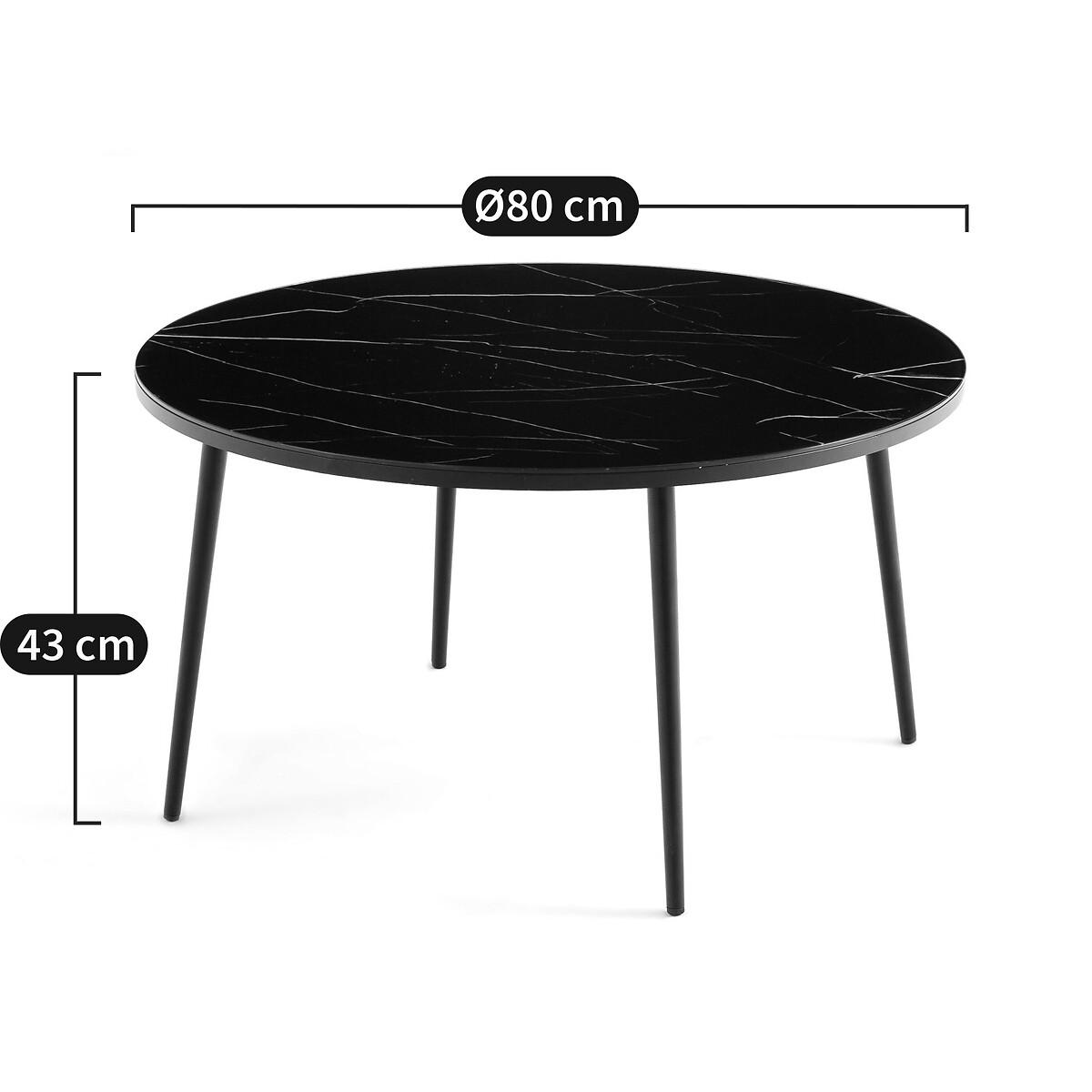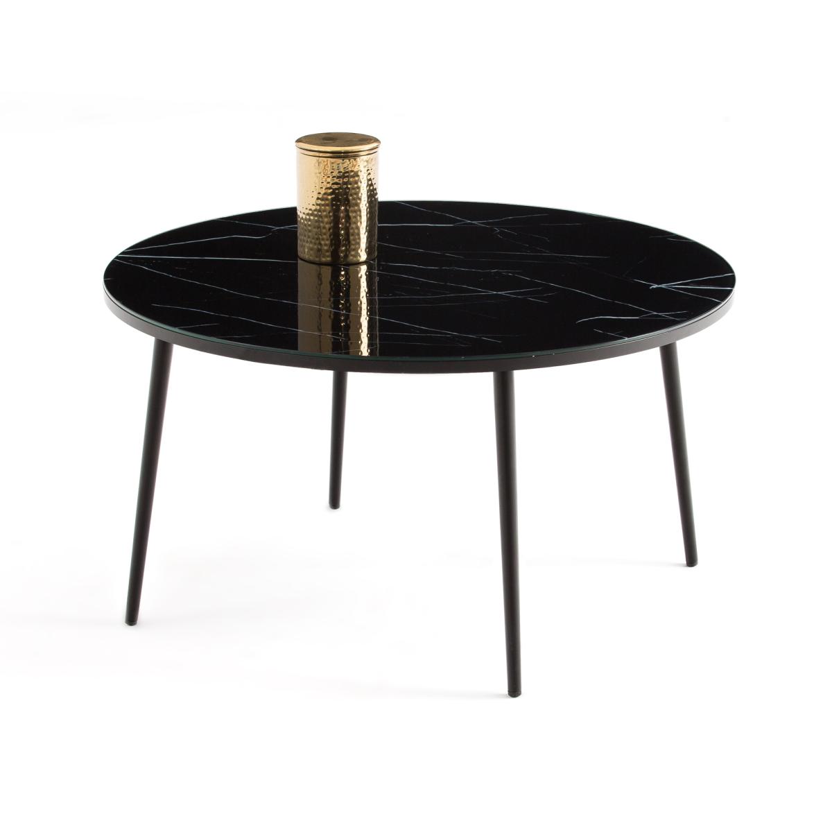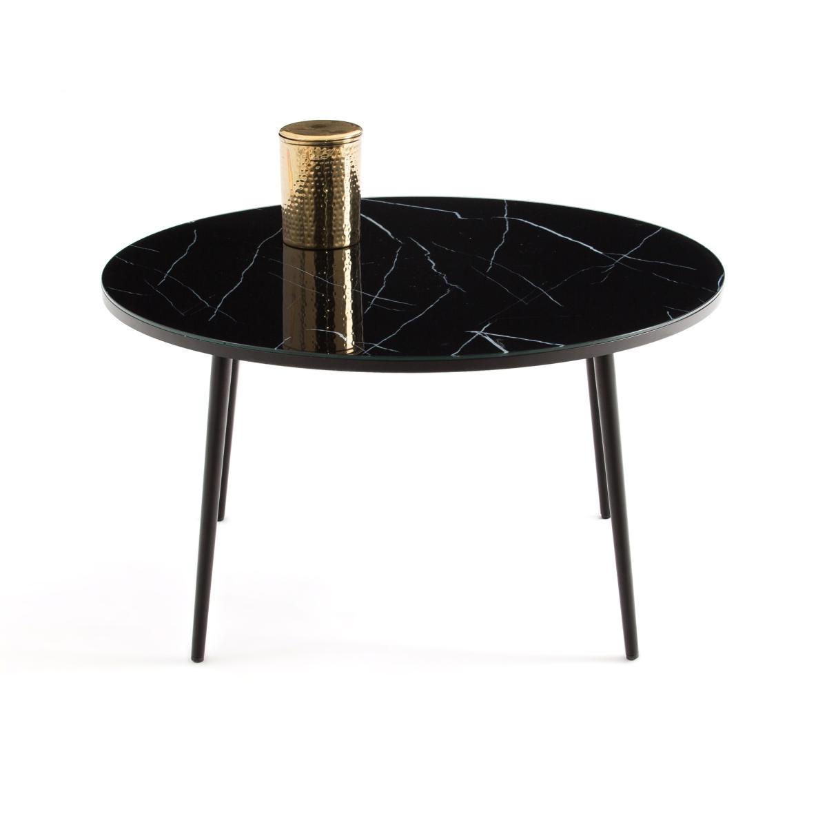 Is your living room in need of an upgrade?. Give it an instant uplift with this smart and polished coffee table topped with tempered glass: on this magnificent coffee table, marble effect... Its tapered ”stillo” style legs give it lightness and style. Product Details • Marble effect tempered glass top on melamine MDF support (not visible) • Belt and tapered legs in black epoxy painted steel • Plastic feet on legs. Dimensions • Diameter: 80cm • Height: 43cm. Delivery:This product is sold for self-assembly. It will be delivered to your door. Note! Please check that all access points are large enough to accommodate your delivery (doors, stairs, lifts).Parcel dimensions and weight: • 1 parcel • L102 x H10.5 x D94cm • 16kg.