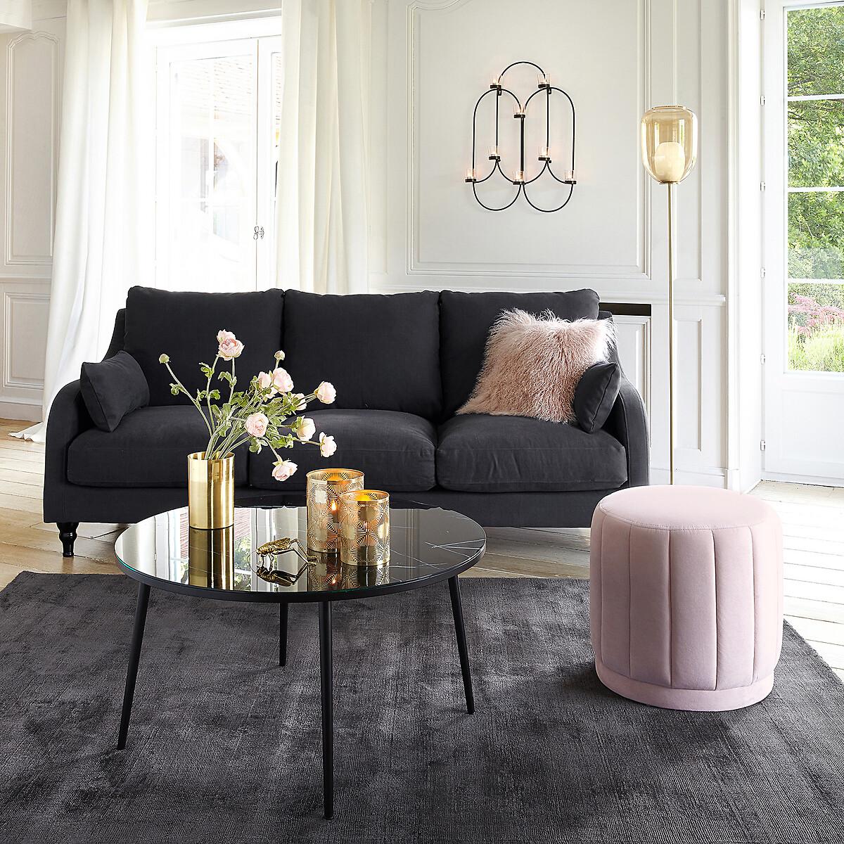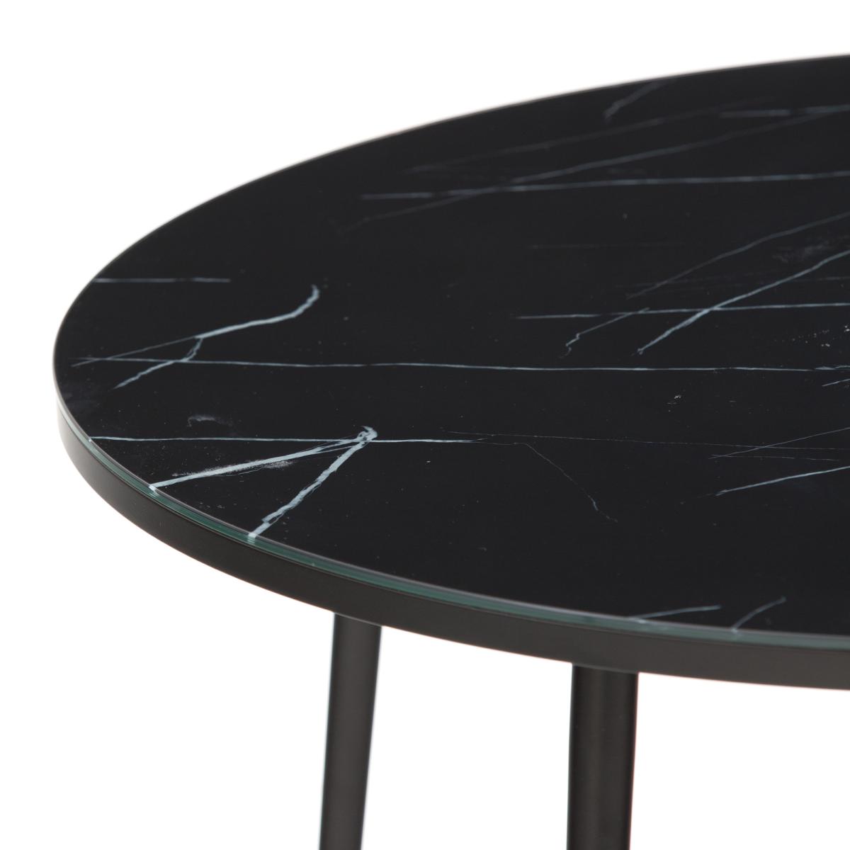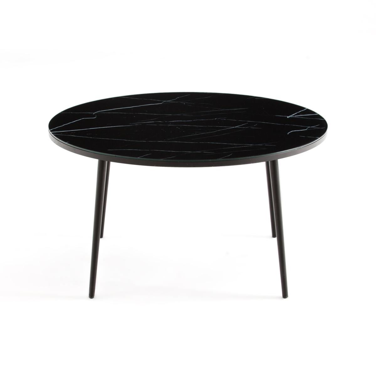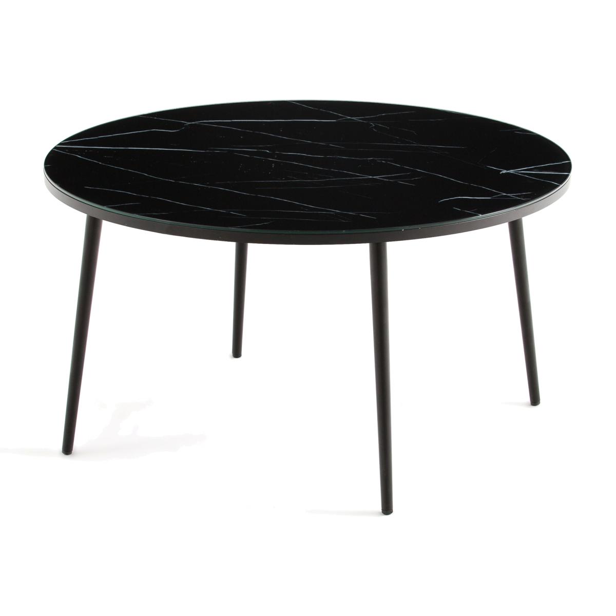 Is your living room in need of an upgrade?. Give it an instant uplift with this smart and polished coffee table topped with tempered glass: on this magnificent coffee table, marble effect... Its tapered ”stillo” style legs give it lightness and style. Product Details • Marble effect tempered glass top on melamine MDF support (not visible) • Belt and tapered legs in black epoxy painted steel • Plastic feet on legs. Dimensions • Diameter: 80cm • Height: 43cm. Delivery:This product is sold for self-assembly. It will be delivered to your door. Note! Please check that all access points are large enough to accommodate your delivery (doors, stairs, lifts).Parcel dimensions and weight: • 1 parcel • L102 x H10.5 x D94cm • 16kg.