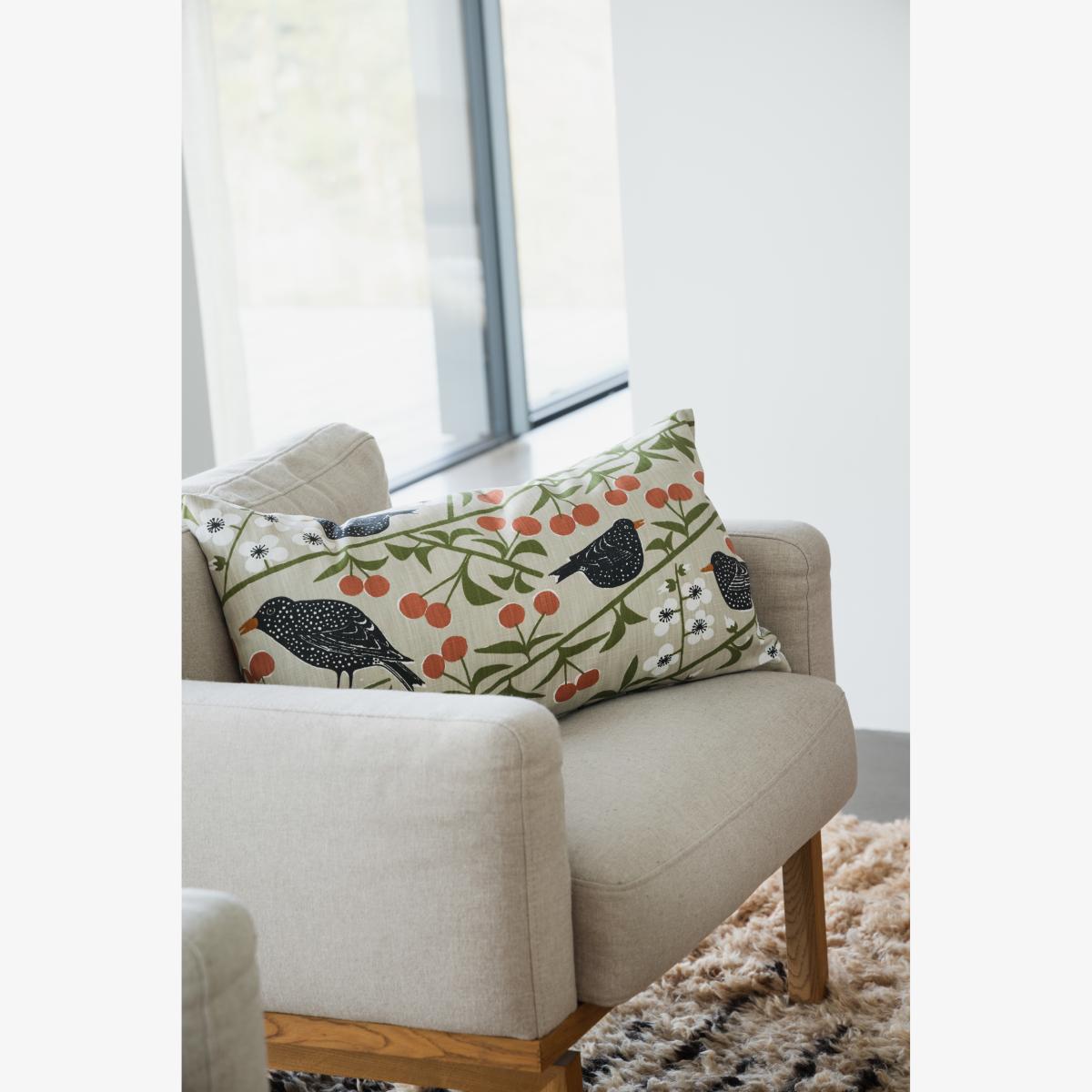 The Cherry Orchard cushion cover from Almedahls is a long, narrow cotton cover adorned with Marianne Westman's classic motif. The organic shapes with flowers and fruit bring both life and calm to the sofa or bed. The slim model works well as a lumbar cushion or a decorative detail along the backrest.