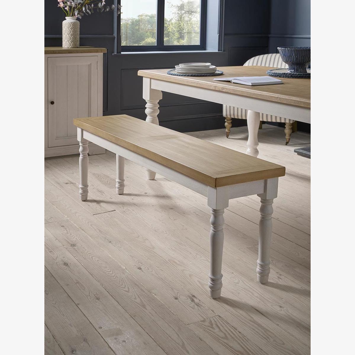 The perfect pairing to our Almelo Dining Table, our Almelo Bench offers a calming dining experience for you and your guests. With delicately carved legs crafted from new pine, painted white, the bench top shows off the natural patina of the wood, creating a laid-back and minimalist style that embraces some traditional elements.
