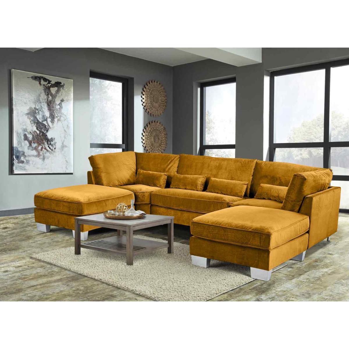 Almora Full Back Corner U Shape Sofa Velour Fabric with 2 Footstools - Gold