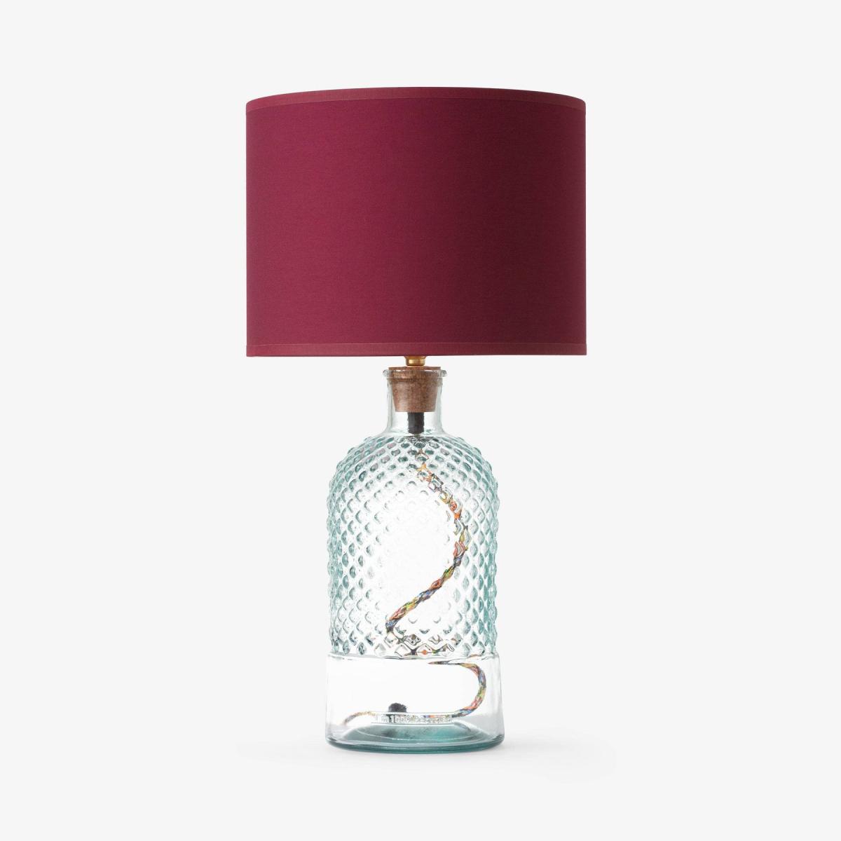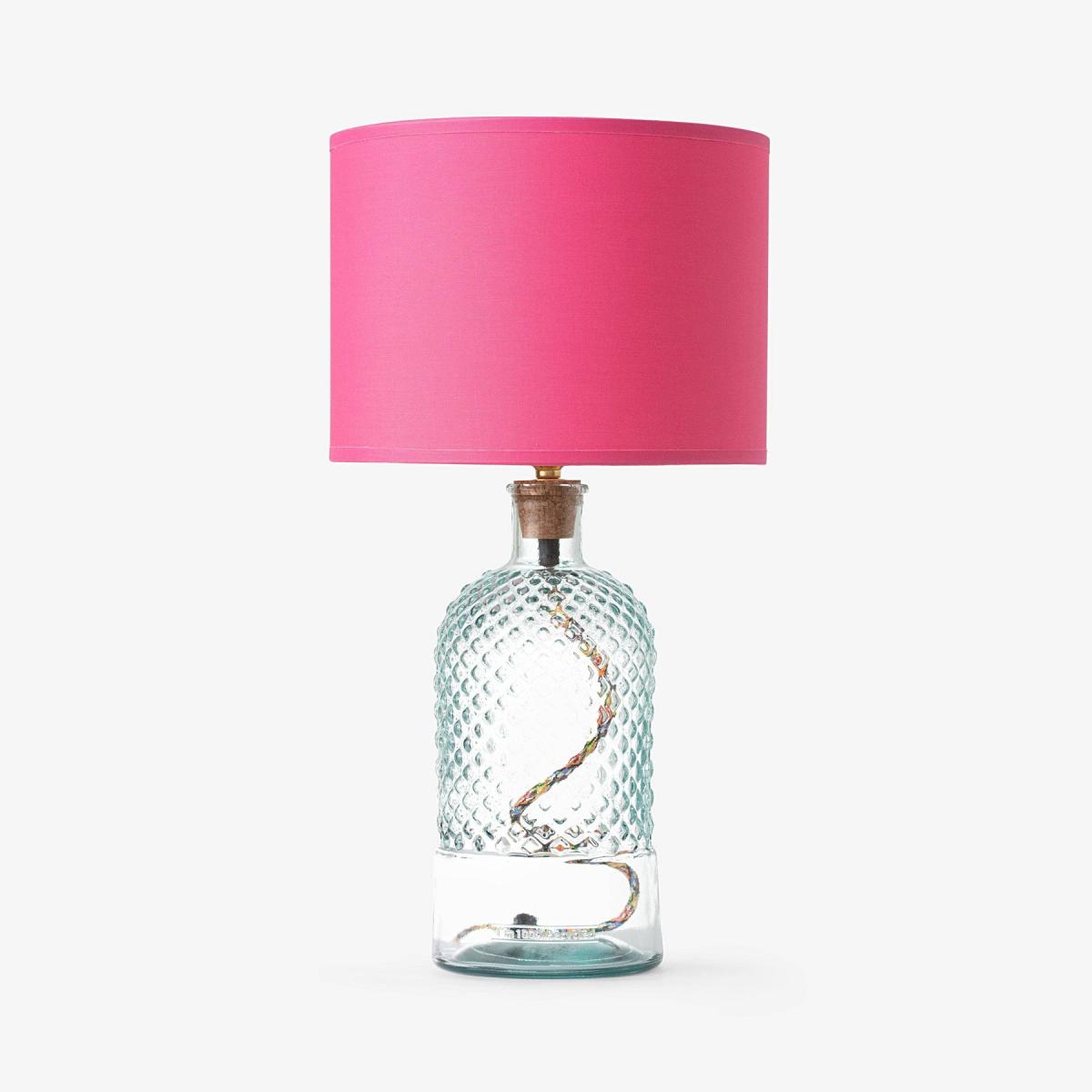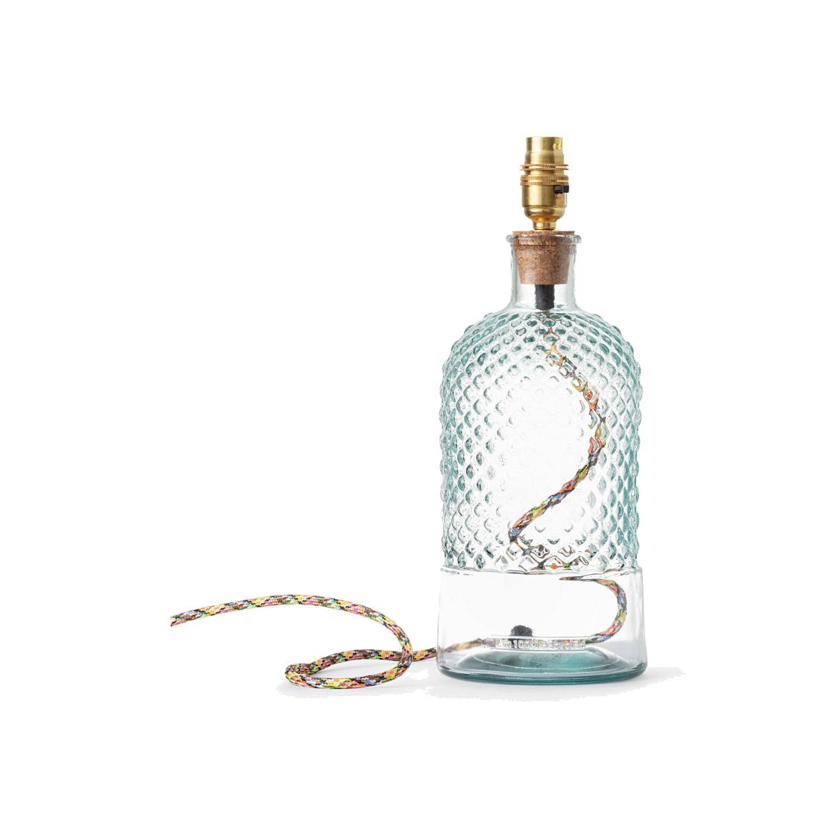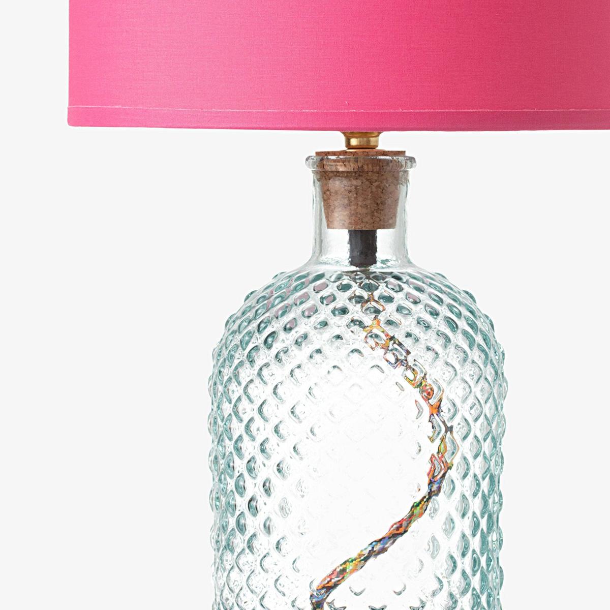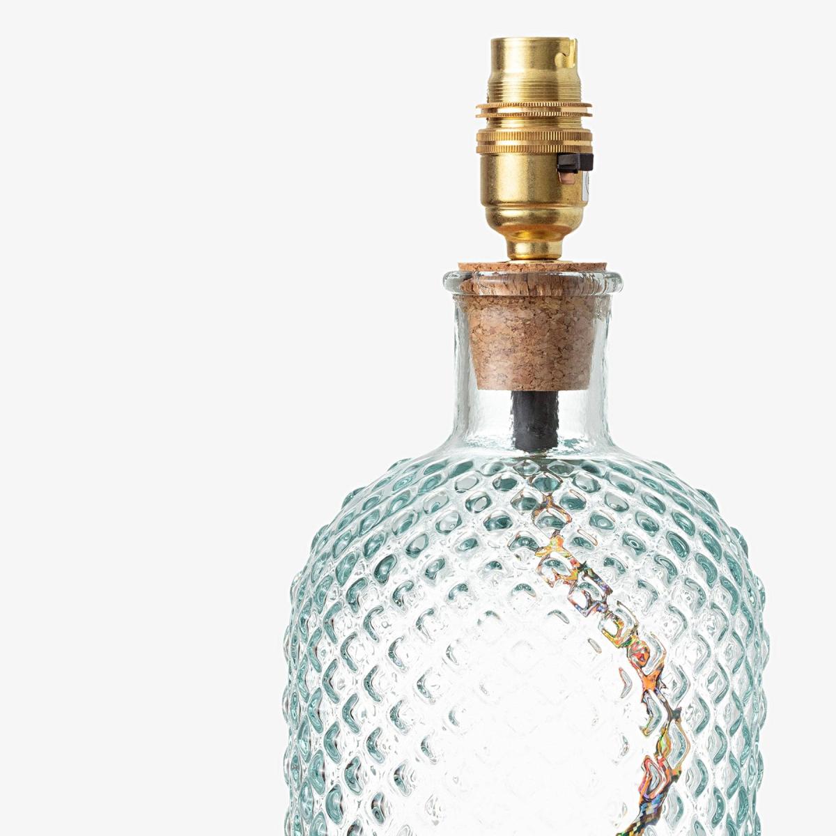 Create a warm ambience in any room with our fun and sophisticated coloured glass table lamp in clear, these handblown glasses adds an artistic touch to any décor and will complement an array of many house décor styles to inject a pop of colour for a showstopping piece. More than just an eye pleaser, its ethically made using eco-friendly 100% recycled glass to add extra charm. The coloured glass is made in Spain, cork stopper is made in Portugal, while the brass table lamp/fitting components are made in the UK. A fixed cork stopper supports the bulb holder. All the coloured lamps are wired, assembled and tested in a Somerset workshop. Sold without a shade, will complement our Dahlia and Dakota shade collections to add a neutral or bold statement to the room. Also comes in more colourful glass colours and vases. Recommended shade size : 25.5 cm Dakota Drum shade
