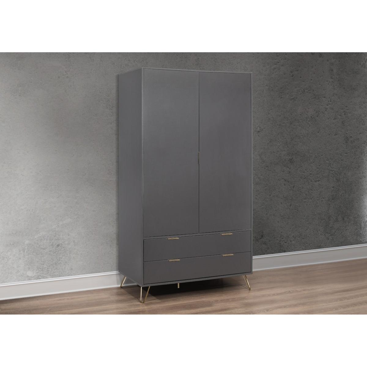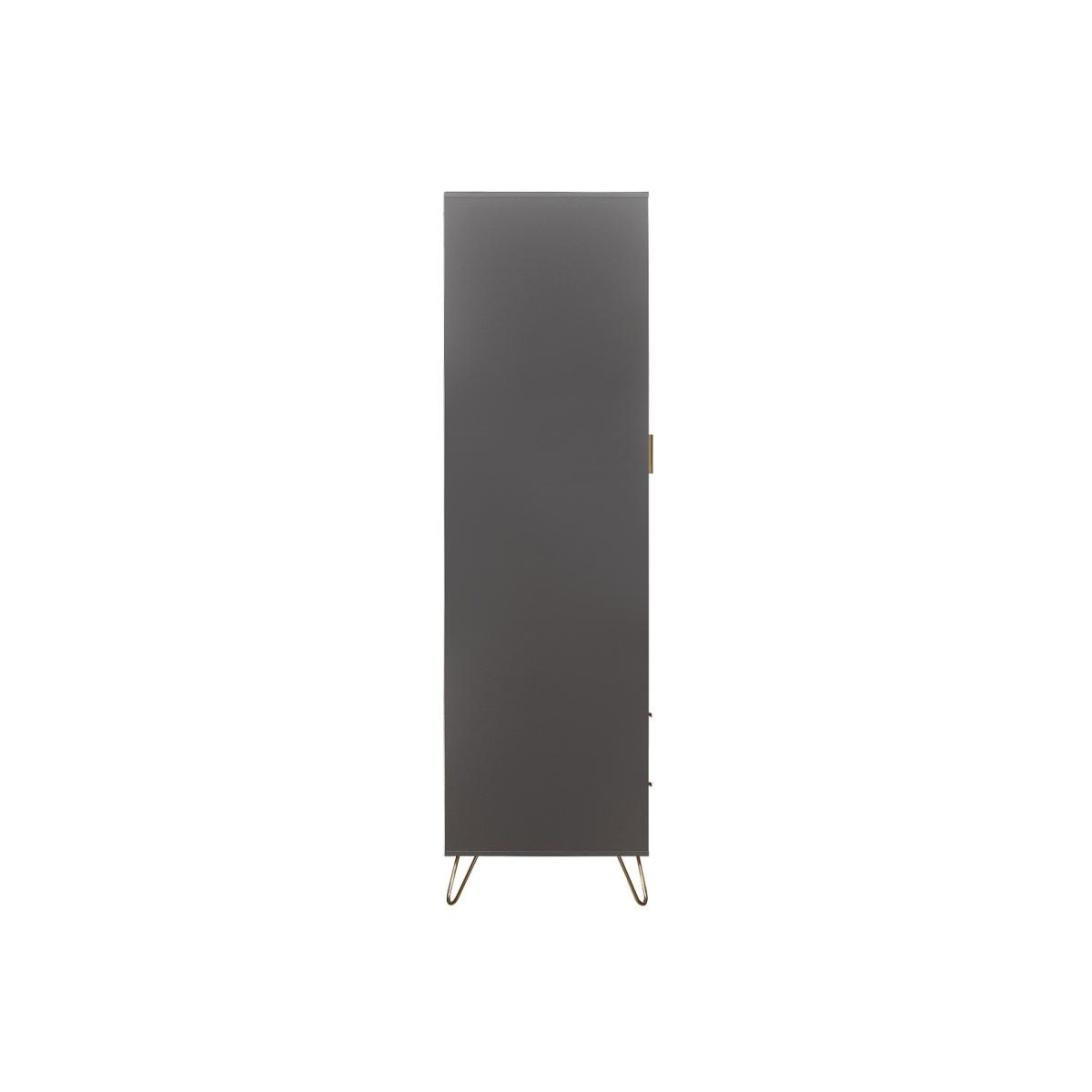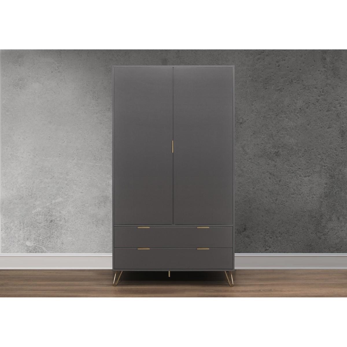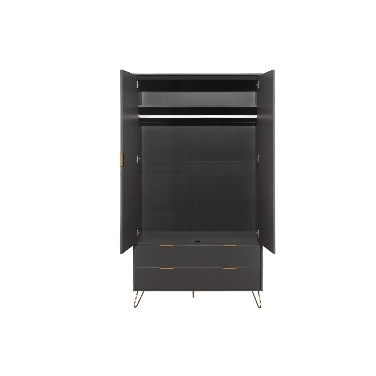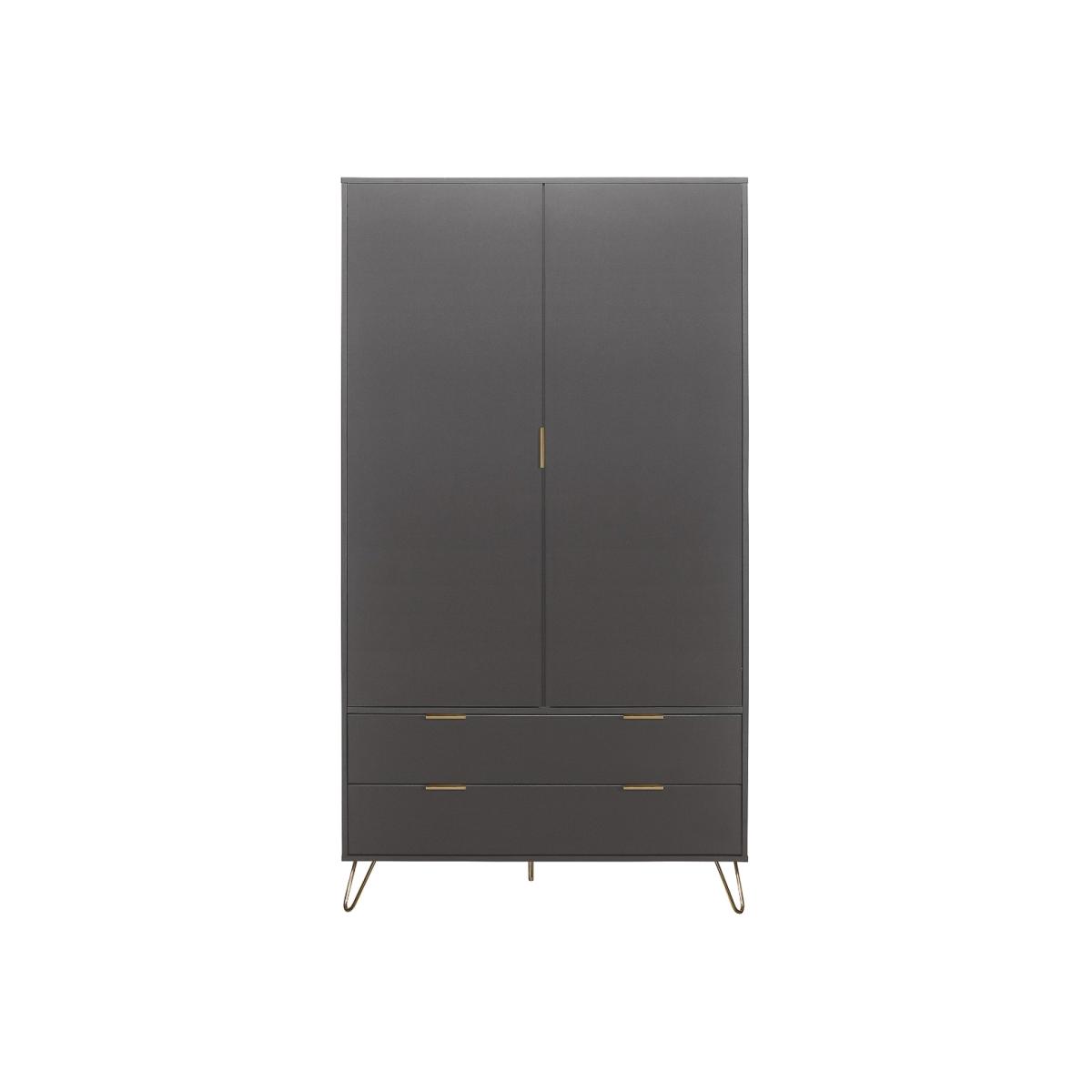 The Alo collection radiates contemporary finesse. Sleek lines with gold handles and hairpin legs make a statement wardrobe to admire. With plenty of hanging room and storage areas, your clothes enjoy space and style. Expertly-designed metal frame with premium particle board A double hanging rail, shelf and two drawers. Gold accent handles and hairpin legs. An on-trend matt grey finish. Easy self-assembly