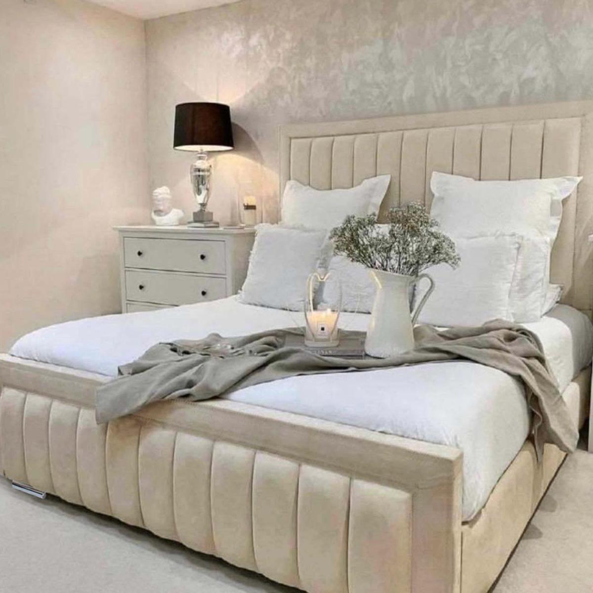 This bed is created in regards to modern style and gives you a look of latest trends to decorate your bedroom. The patterns created on this bed are based on unique but exquisite longitudinal margins that creates a graceful appearance. Furthermore, these elegant patterns are craved out on finest quality of velvet that enhance the aesthetic aspect of this bed. In addition, this bed also features a sublime experience of softness and coziness to offer you with a sound sleep that you have yearned for decades. Succinctly, our beds are the kinds of bed that you dream to possess and experience a relaxing slumber to eradicate all the tired of the weary days. Headboard Height 125cm