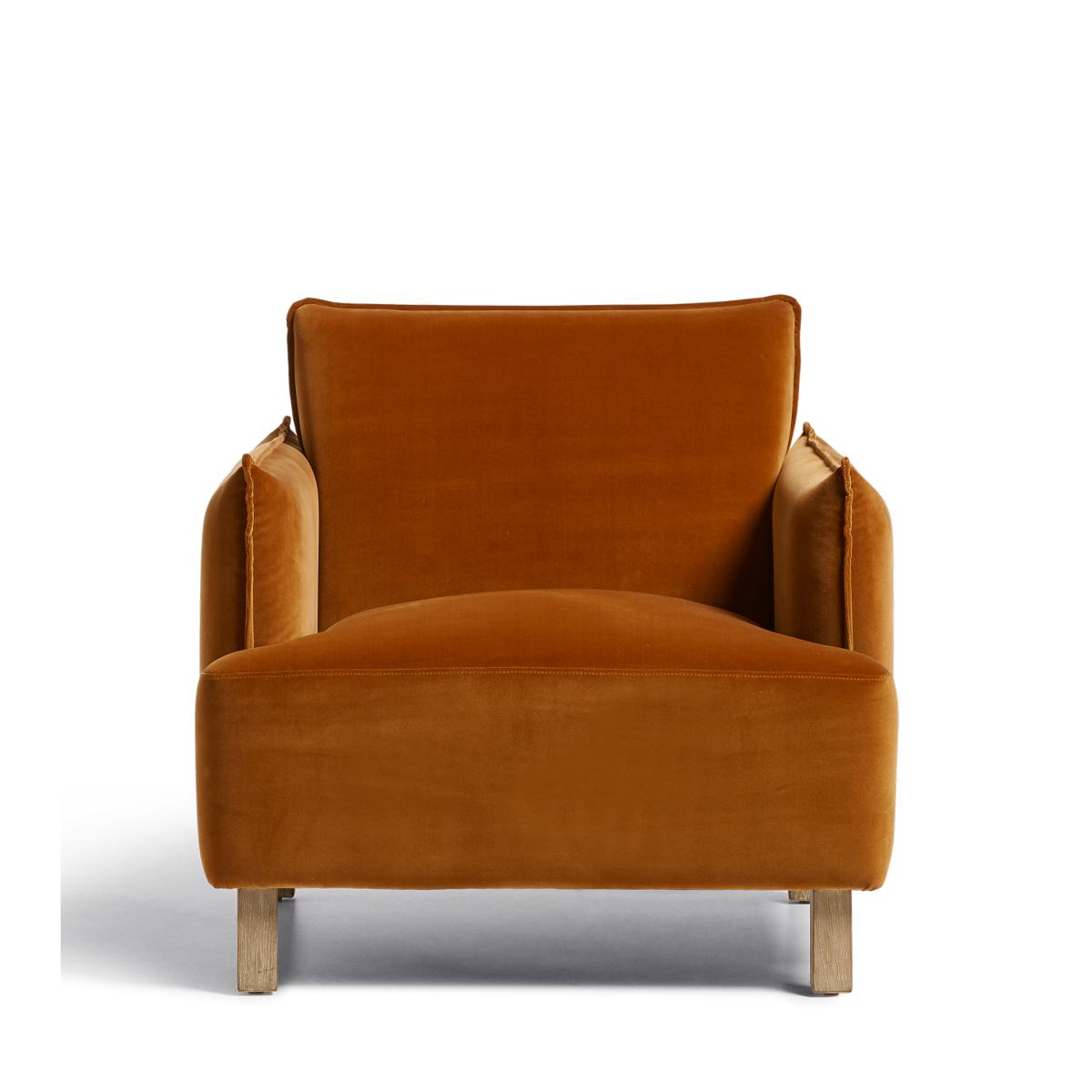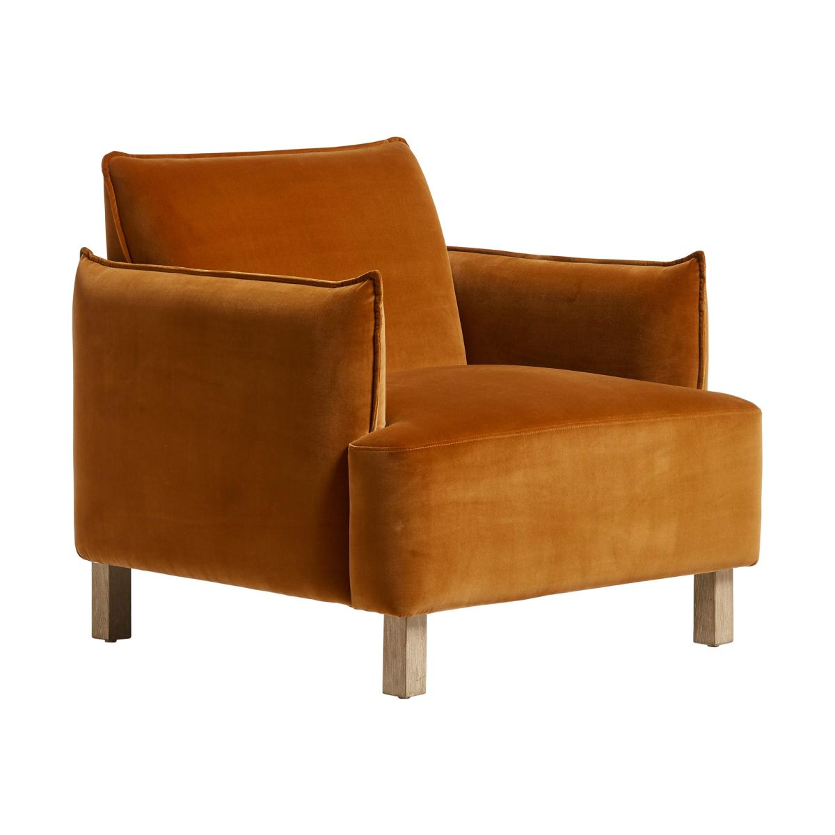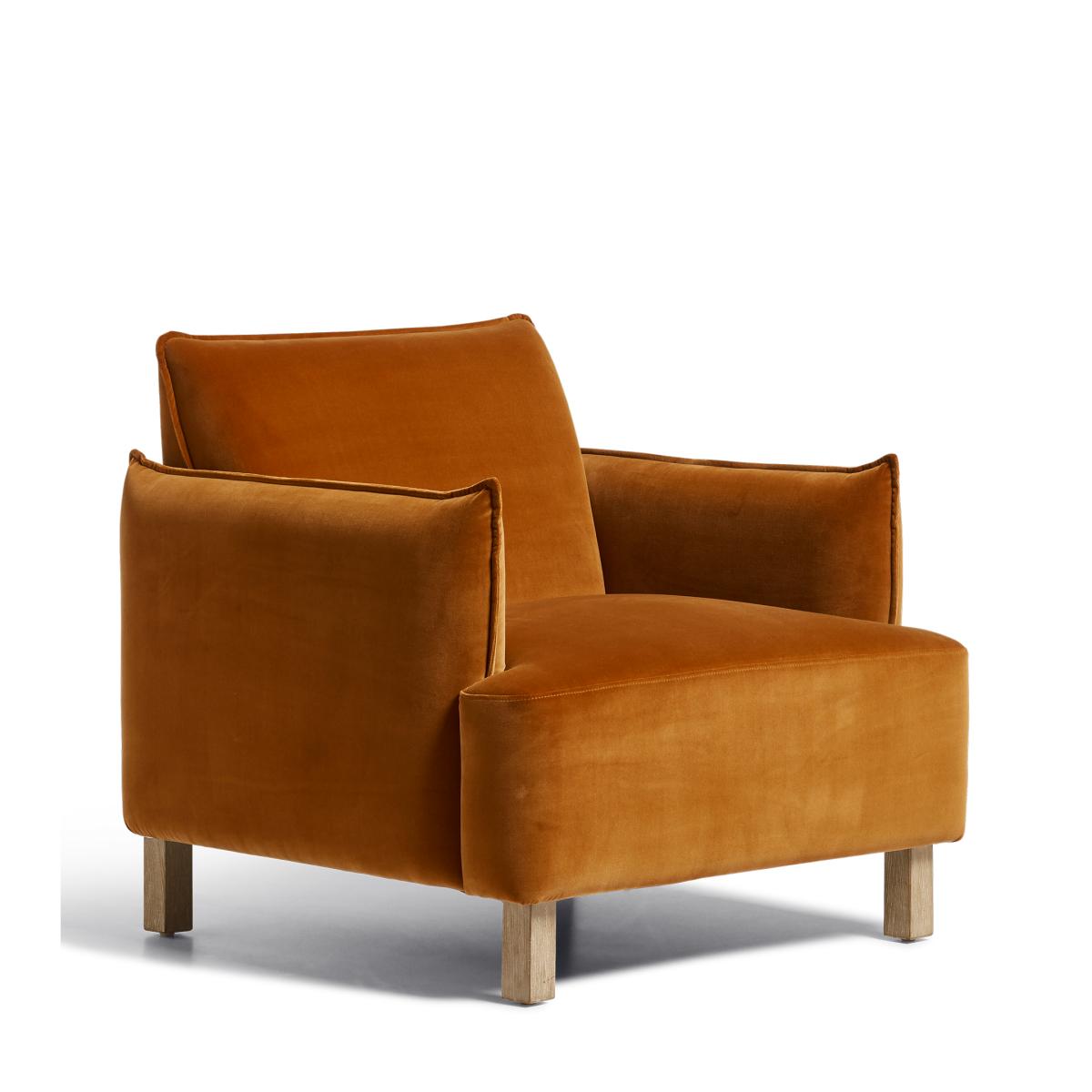 Alora, a name of Latin origin meaning ‘dreamer’, is named for her pillowlike arms and backrest, the shapes of which are accentuated by matching piping. The Dirty Orange velvet upholstery adds to the seat’s softness, with the large square shape offering an inviting spot to relax.