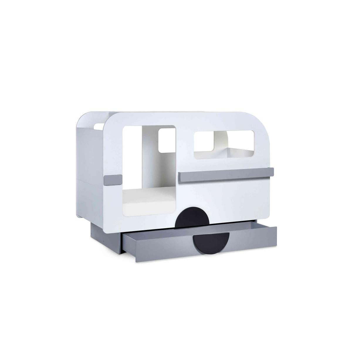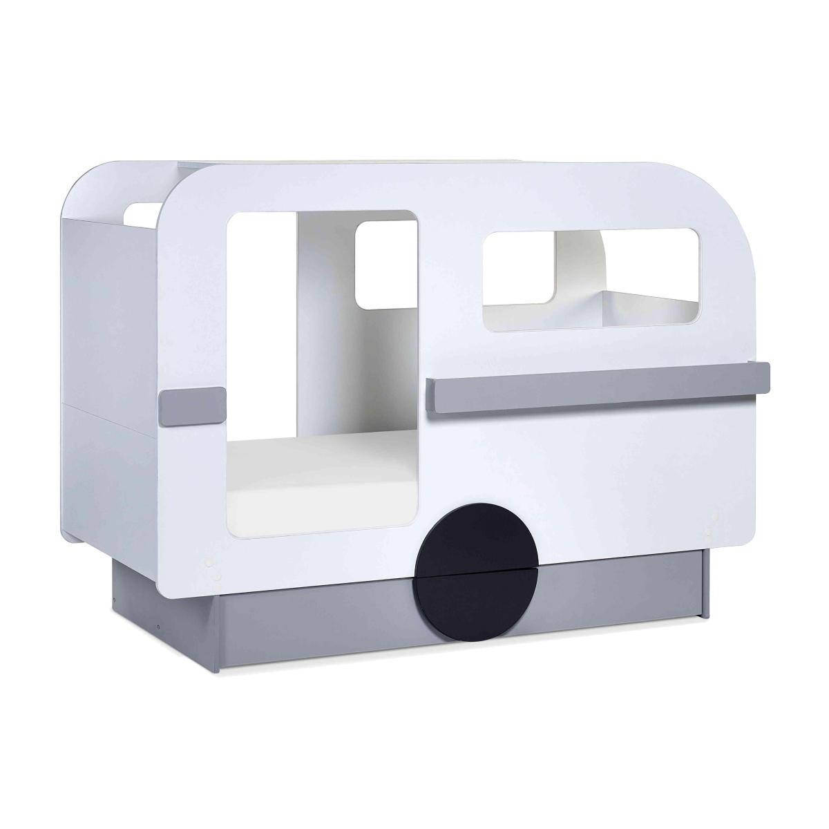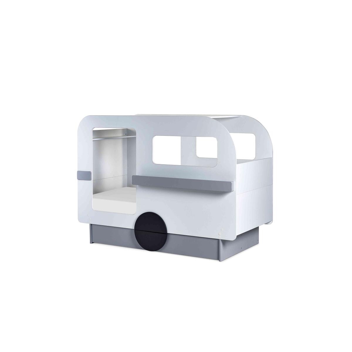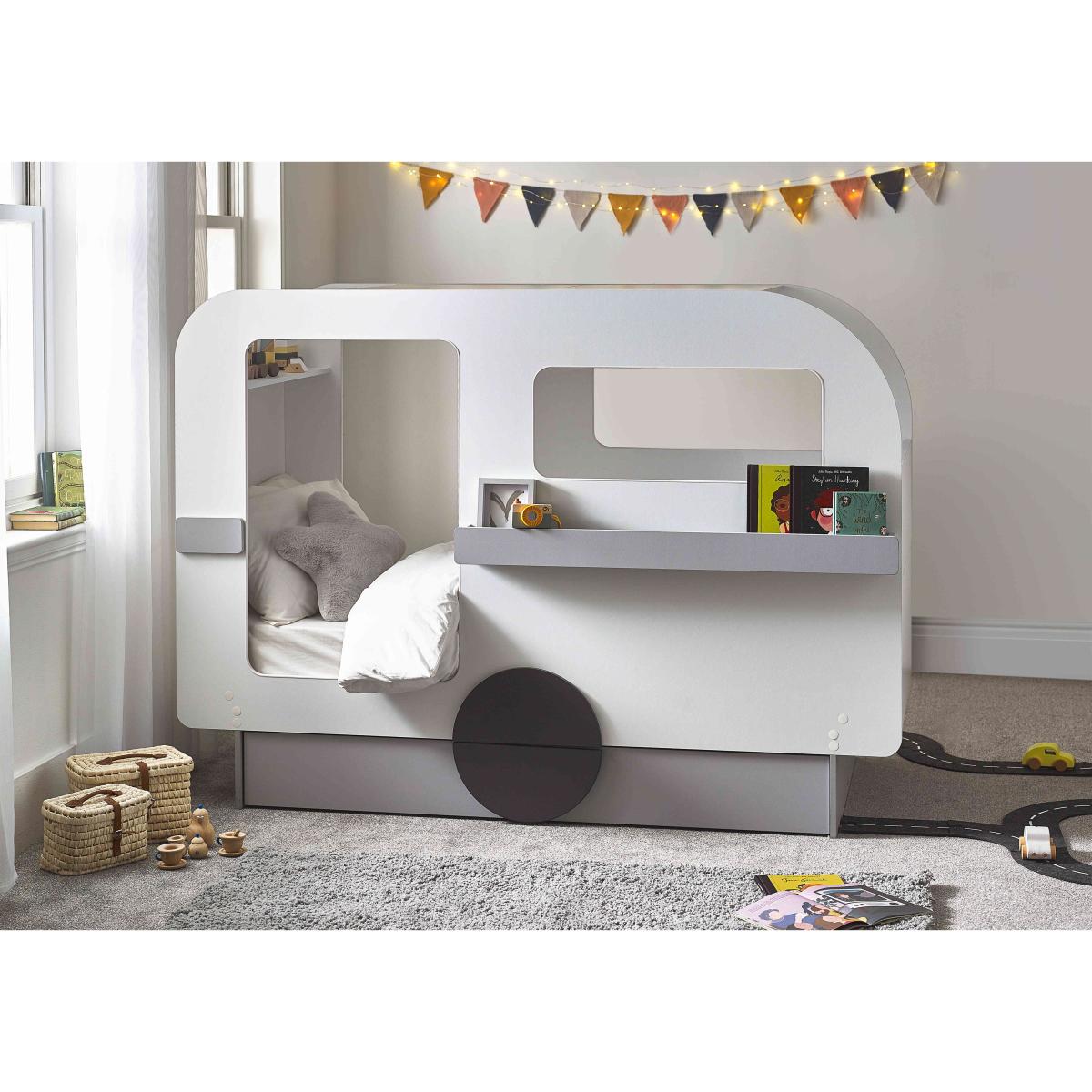 Your child will love this charming caravan bed. Providing a cosy place to sleep as well as encouraging imaginative play, it cleverly integrates shelves and a large storage drawer. Why you'll love it Utterly charming caravan-style bed for a child. Creative design encourages imaginative play and provides a cosy sleep space. Space-saving storage is built in – with shelves inside and out, and a large pull-out drawer. Clean and modern with a lacquered white finish and grey accents. This caravan bed is part of our children’s bedroom furniture collection. What you need to know Mattress not included. Delivered to you flat-packed. Assembly required. Suitable for children aged 6 and over. Requires a standard UK single mattress (90 cm x 190 cm). For safety reasons, the mattress should be no more than 23 cm deep. Takes 2 people approximately 120 minutes to assemble. A clearance of 10 cm at either end of this bed is required for assembly. WARNING!