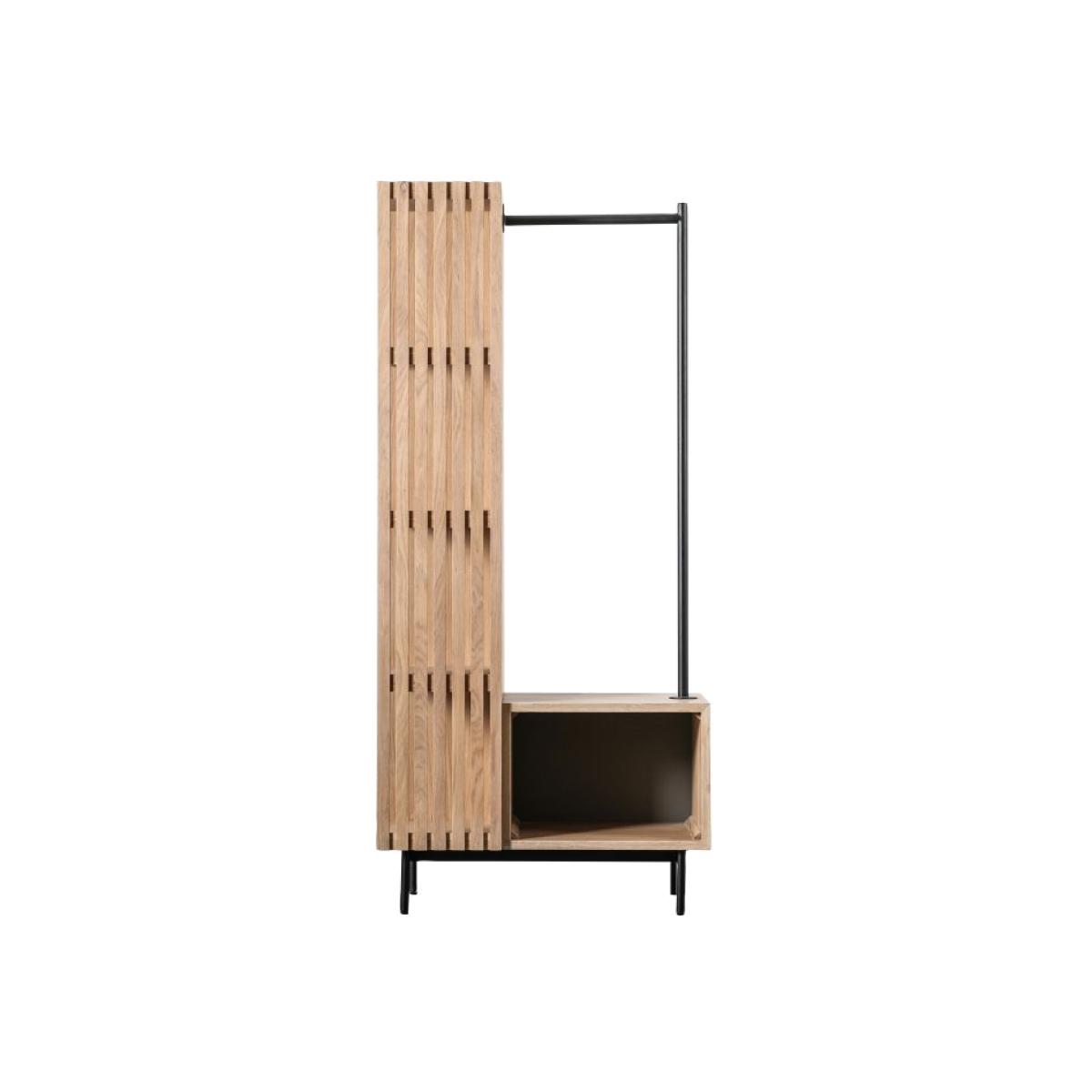 The Alora collection offers a range of living, dining and bedroom furniture offering a beautiful contemporary Japandi style. Crafted from solid oak and oak veneers, great attention to detail has been given to the design across the range to create these stunning pieces. The Alora Open Wardrobe features solid oak slats with four shelves behind, plus another open shelf on the front of the unit. A black metal hanging rail offers practical storage, with matching black metal legs adding the finishing touch. Material: Oak. Colour/Finish: Natural.
