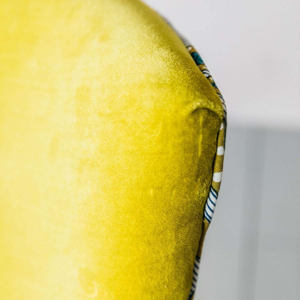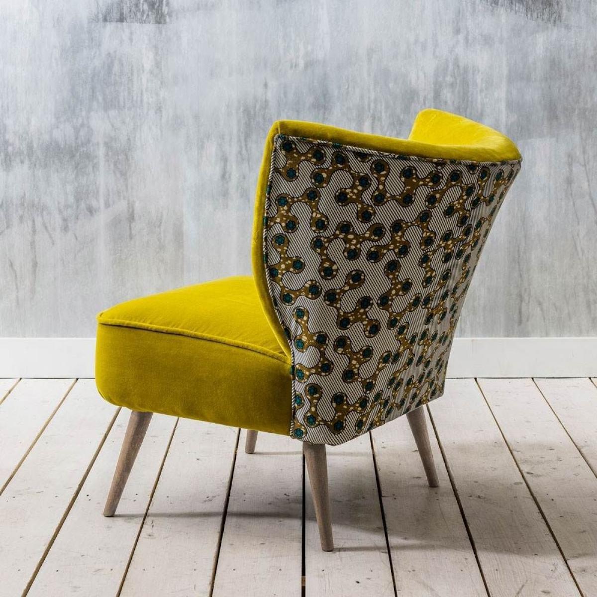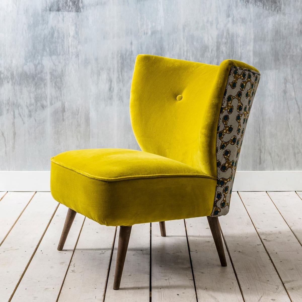 Our Alpana Print Yellow Velvet Cocktail Chair is a modern take on a classic piece. Luxuriously upholstered in rich yellow velvet, from the front this chair is simply traditional, but turn it around and discover a vivid molecule design. African inspired, this intriguing blue and green pattern guarantees this chair will not go unnoticed.