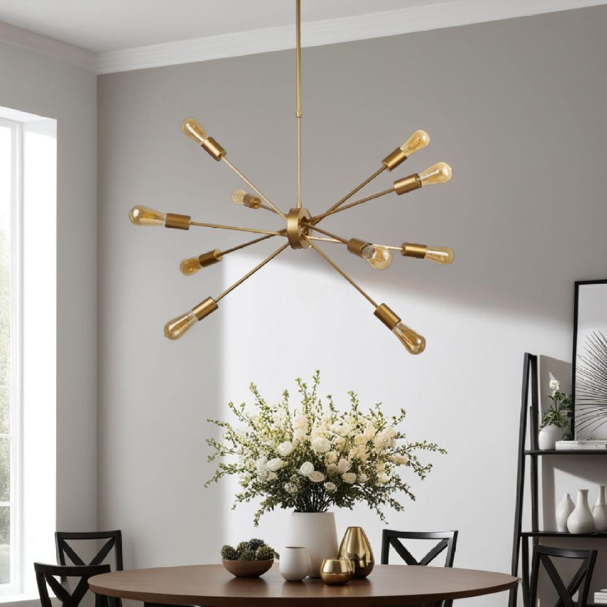 Alpha 10-light sputnik ceiling pendant, featuring exposed lamps and a matte gold finish. A striking fixture that embodies mid-century modern design with a contemporary twist, this ceiling pendant features an iconic sputnik design with ten exposed lamps suspended on delicate rods, creating a dynamic and eye-catching statement piece. The matte gold finish adds a touch of luxury and sophistication, making it a versatile addition to any stylish interior. Ideal for living rooms, dining areas or entryways, the Alpha pendant provides ample illumination while enhancing your space with its bold and unique design. Its combination of exposed lamps and matte gold finish creates a warm and inviting ambiance, perfect for modern and eclectic decor styles. Alpha 10-light sputnik ceiling pendant, featuring exposed lamps and a matte gold finish. A striking fixture that embodies mid-century modern design with a contemporary twist, this ceiling pendant features an iconic sputnik design with ten exposed lamps suspended on delicate rods, creating a dynamic and eye-catching statement piece. The matte gold finish adds a touch of luxury and sophistication, making it a versatile addition to any stylish interior. Ideal for living rooms, dining areas or entryways, the Alpha pendant provides ample illumination while enhancing your space with its bold and unique design. Its combination of exposed lamps and matte gold finish creates a warm and inviting ambiance, perfect for modern and eclectic decor styles.