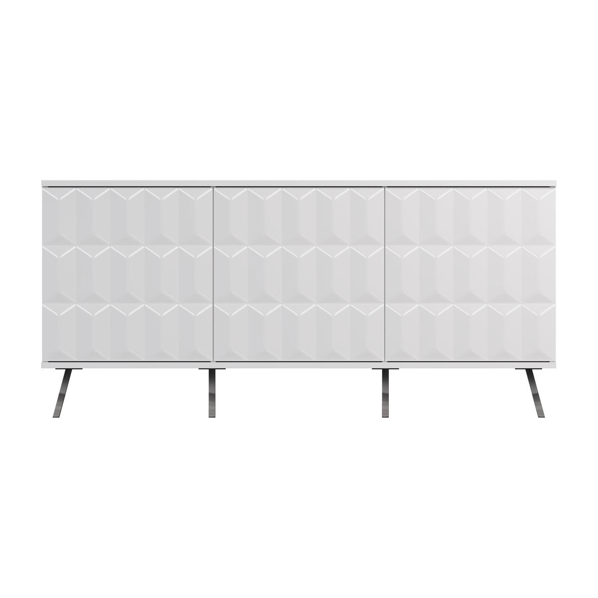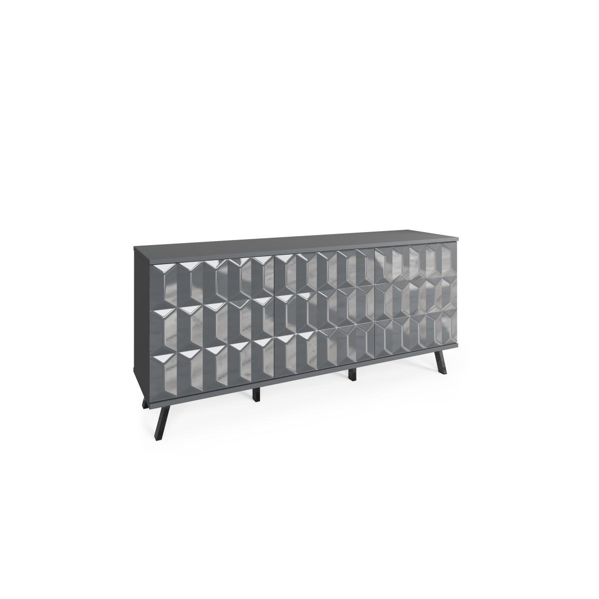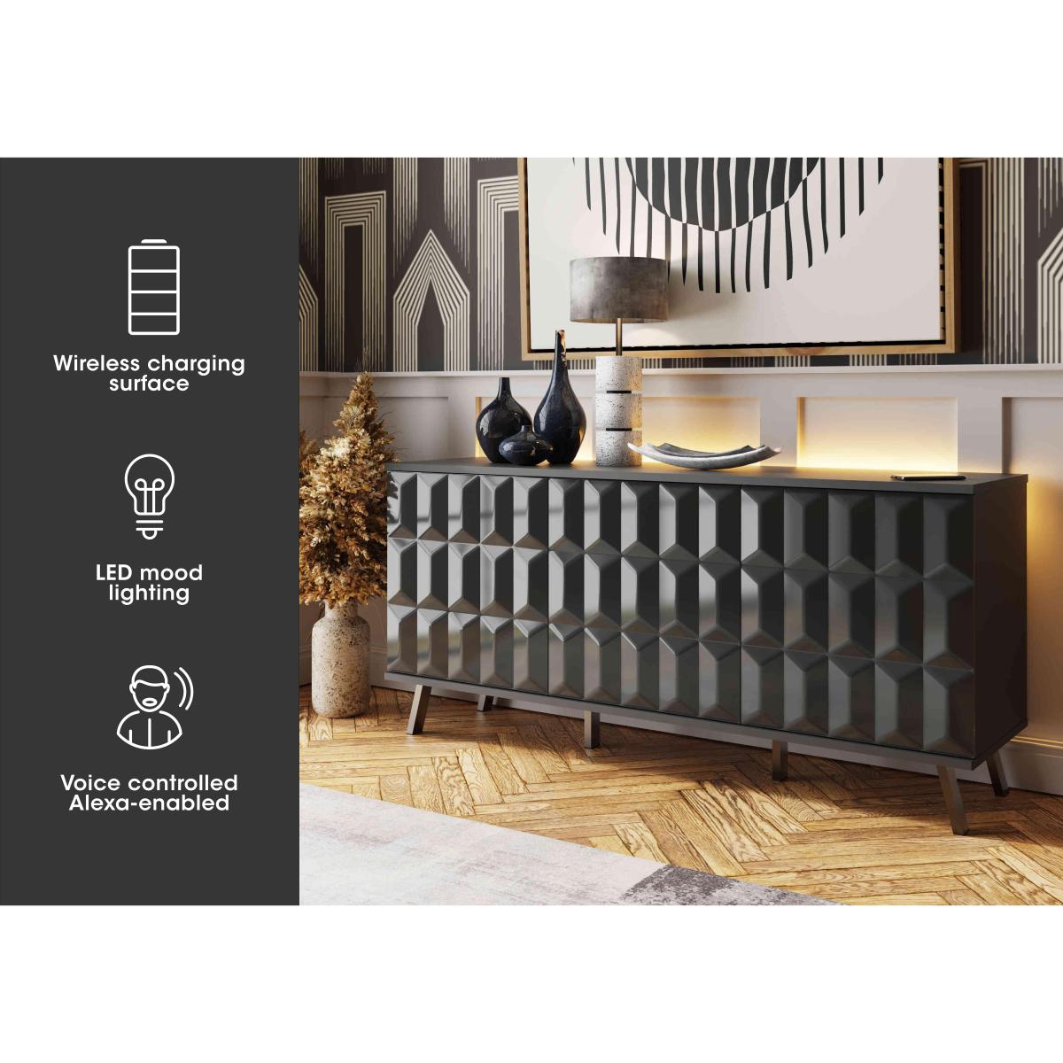 Statement design meets state-of-the-art technology in the 3-door Alpha sideboard. Its bold contemporary look is matched only by its built-in SMART technology. Why you'll love it Striking 3-door sideboard has many hidden talents. A bold contemporary look with seamlessly integrated technology. Built-in SMART LED lighting controlled via smart speaker or app. Discrete wireless phone charging point. Statement design with 3-dimensional geometric door fronts. Choose high-gloss white, high-gloss grey or semi-gloss black. Designed for everyday living with scratch-resistant frame. Interior colour perfectly matches the exterior. Fast and easy click-together self-assembly. A Furniture Village online exclusive. This 3-door sideboard with SMART LED lighting is part of the Alpha range. What you need to know Double-door cupboard has 2 adjustable shelves. Single-door cupboard has 1 adjustable shelf. Do not use abrasive cleaning products. Wipe clean with a damp cloth, and dry with a soft duster. We recommend using coasters and placemats at all times. WARNING!