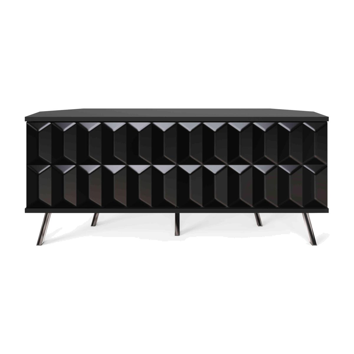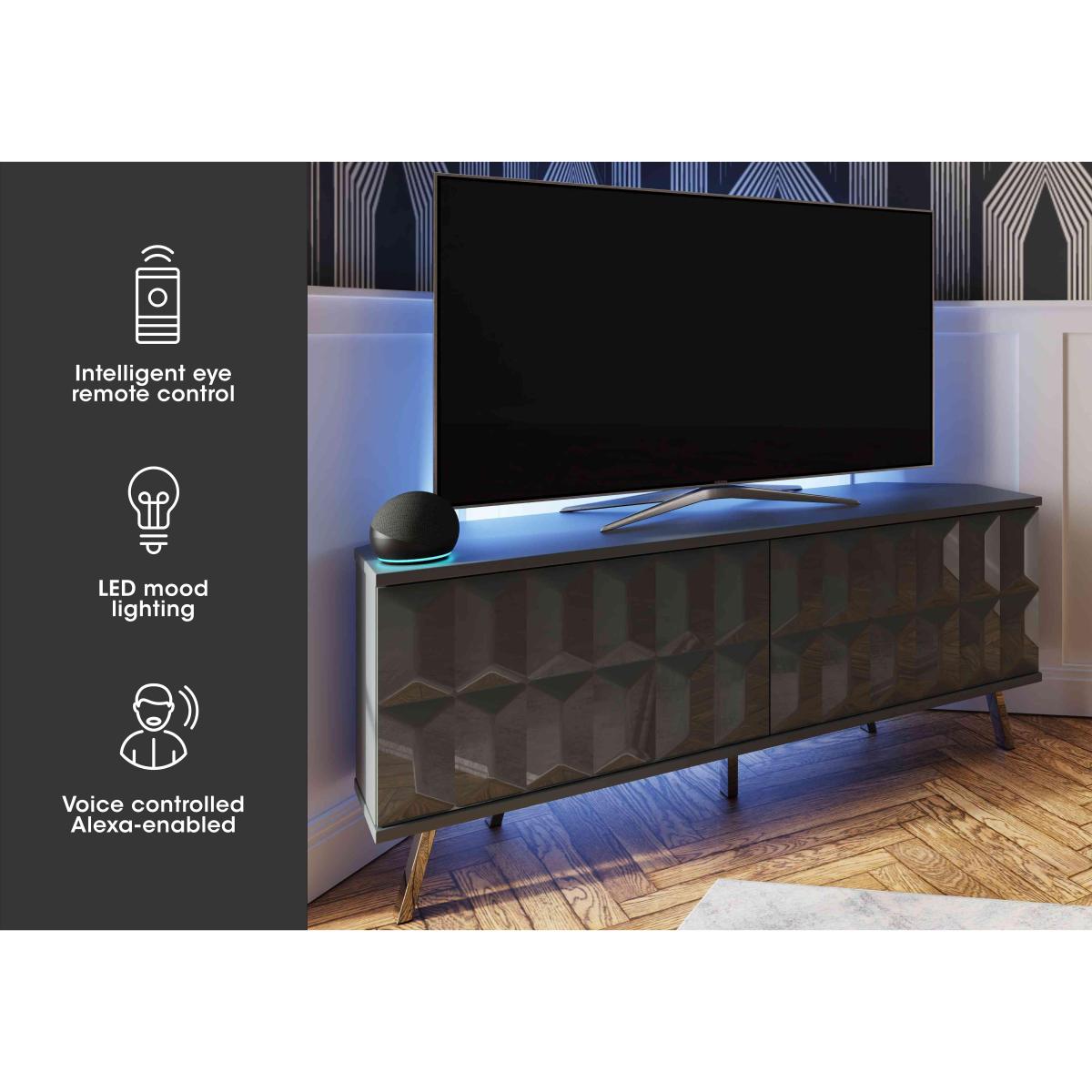 With Intelligent Eye technology and integrated SMART LED lighting, this corner TV unit is a high-tech match for your TV and media components. Why you'll love it This space-saving corner TV unit has all the high-tech features you want. A bold contemporary look with seamlessly integrated technology. Built-in SMART LED lighting controlled via smart speaker or app. Intelligent Eye technology means remote controls work even with the doors closed. Statement design with 3-dimensional geometric door fronts. Choose high-gloss white, high-gloss grey or semi-gloss black. Designed for everyday living with scratch-resistant frame. Interior colour perfectly matches the exterior. Fast and easy click-together self-assembly. A Furniture Village online exclusive. This corner TV unit with SMART LED lighting is part of the Alpha range. What you need to know 1 double-door cupboard with 2 adjustable shelves. The finish may show small surface scratches, a result of the finishing process. Do not place in direct sunlight. Do not use abrasive cleaning products. Wipe clean with a damp cloth, and dry with a soft duster. We recommend using coasters and placemats.