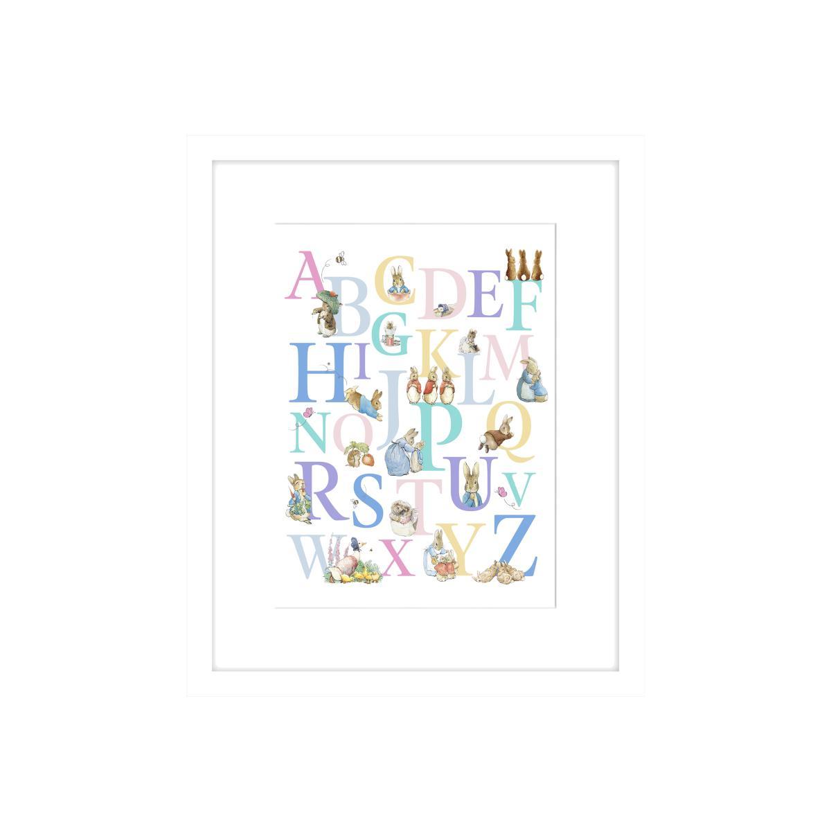 The Alphabet Framed Art is a charming print that combines classic Beatrix Potter illustrations with colourful alphabet typography. A lovely addition to any child’s bedroom or nursery. Why you’ll love it. Discover a host of Beatrix Potter’s most famous characters. A great way to introduce the alphabet to your little one. Featuring lovely pastel shades. Mounted and framed in a contemporary white frame. Made with care for Furniture Village. What you need to know. A paper print on an MDF back board. Finished with a protective glaze. Comes with a metal hanging fixture. Dimensions. Width: 43 cm (17 inches). Height: 53 cm (21 inches).